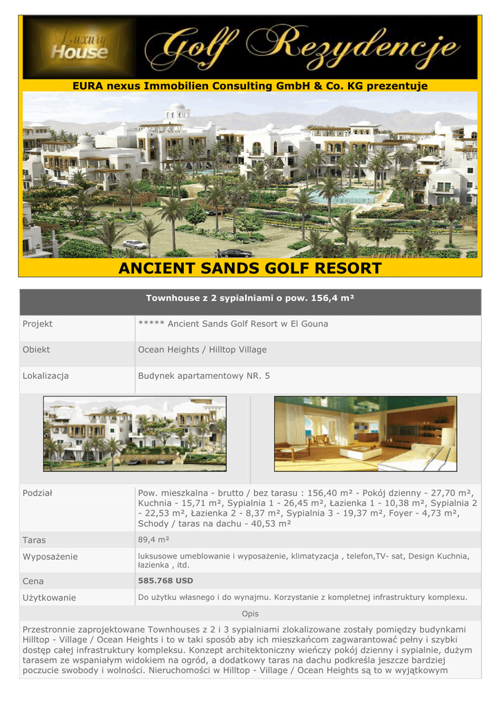 EURA nexus Immobilien Consulting GmbH & Co. KG prezentuje ANCIENT SANDS GOLF RESORT Townhouse z 2 sypialniami o pow. 156,4 m² Projekt ***** Ancient Sands Golf Resort w El Gouna Obiekt Ocean Heights / Hilltop Village Lokalizacja Budynek apartamentowy NR. 5 Podział Pow. mieszkalna - brutto / bez tarasu : 156,40 m² - Pokój dzienny - 27,70 m², Kuchnia - 15,71 m², Sypialnia 1 - 26,45 m², Łazienka 1 - 10,38 m², Sypialnia 2 - 22,53 m², Łazienka 2 - 8,37 m², Sypialnia 3 - 19,37 m², Foyer - 4,73 m², Schody / taras na dachu - 40,53 m² Taras 89,4 m² WyposaŜenie luksusowe umeblowanie i wyposaŜenie, klimatyzacja , telefon,TV- sat, Design Kuchnia, łazienka , itd. Cena 585.768 USD UŜytkowanie Do uŜytku własnego i do wynajmu. Korzystanie z kompletnej infrastruktury komplexu. Opis Przestronnie zaprojektowane Townhouses z 2 i 3 sypialniami zlokalizowane zostały pomiędzy budynkami Hilltop - Village / Ocean Heights i to w taki sposób aby ich mieszkańcom zagwarantować pełny i szybki dostęp całej infrastruktury kompleksu. Konzept architektoniczny wieńczy pokój dzienny i sypialnie, duŜym tarasem ze wspaniałym widokiem na ogród, a dodatkowy taras na dachu podkreśla jeszcze bardziej poczucie swobody i wolności. Nieruchomości w Hilltop - Village / Ocean Heights są to w wyjątkowym Townhouse z 2 sypialniami o pow. 156,4 m² konzepcie opierającym się na nubistycznym stylu zaprojektowane domy, z kopułami, wieŜyczkami i galeriowymi tarasami. Budynki te otoczone są bogatą w róŜnorodność zielenią, ścieŜkami spacerowymi i otwartymi placami zachęcającymi do odpoczynku. Architektoniczne rozwiązanie powierzchni mieszkalnych ,posiada w stronę tarasu charakter otwarty, gwarantujący przyjemne ochłodzenie przez wiatry z nad morza. Do relaksu , wypoczynku i ochłody zachęcają równieŜ przepięknie zaaranŜowane baseny i otaczające je palmy. Centrum apartamentu stanowi duŜy salon, oddzielna kuchnia. Salon to wspaniałe miejsce do odpoczynku, gdzie duŜe szklane drzwi tarasowe zapewniają doskonały napływ światła dziennego. Do kaŜdej nieruchomości mogą Państwo opcjonalnie skorzystać z servisu / programu wynajmu i zarządzania.Elegancja, luksus oraz wysoka jakość są podstawą konceptu wyposaŜenia objektów w ANCIENT SANDS, co daje gwarancję spełnienia w programie wynajmu ,warunków i wymogów kategorii 5*****. Dla Kupujących , chcących wziąść udział w tym programie , ALCHEMY Team przygotował trzy warianty wyposaŜenia: Cool White , Modern Classic i Yacht (w tej opcji pobierana jest dopłata). Koszty wypasaŜenia , do którego naleŜą m.i.n. : klimatyzacja, wykończenie podług i ścian, Design kuchnia , łazienka są juŜ ujęte w cenie nieruchomości. Dla Kupujących, którzy nie chcą brać udziału w programie wynajmu, przygotowana została mniej luksusowa opcja wyposaŜenia " Gouna Gala " , która nie zawiera klimatyzacji i wyposaŜenia kuchni, moŜna je jednak dodatkowo nabyć. Uwagi ! Powierzchnie tarasów są zróŜnicowane , a ich wielkość uzaleŜniona jest od lokalizacji apartamentu w budynku Plan Apartamentu Lokalizacja Developer Agent Generalny na Polskę Kontakt: Tel. +49 (0) 39924 7993 -0 Fax. +49 (0) 39924 7993 – 15 [email protected] j.polski: Tel. +49 (0) 9252 350 900 Fax. +49 (0) 9252 6953 [email protected]