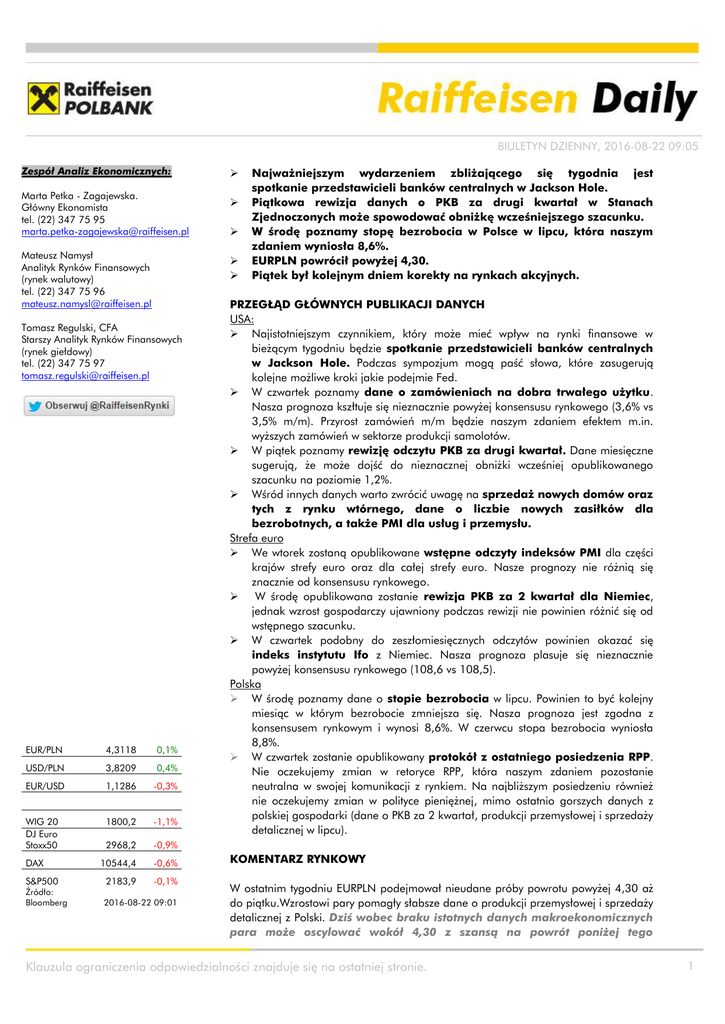 BIULETYN DZIENNY, 2016-08-22 09:05 Zespół Analiz Ekonomicznych: Marta Petka - Zagajewska. Główny Ekonomista tel. (22) 347 75 95 [email protected] Mateusz Namysł Analityk Rynków Finansowych (rynek walutowy) tel. (22) 347 75 96 [email protected] EUR/PLN 4,3118 0,1% USD/PLN 3,8209 0,4% EUR/USD 1,1286 -0,3% WIG 20 DJ Euro Stoxx50 1800,2 -1,1% 2968,2 -0,9% 10544,4 -0,6% 2183,9 -0,1% S&P500 Źródło: Bloomberg Tomasz Regulski, CFA Starszy Analityk Rynków Finansowych (rynek giełdowy) tel. (22) 347 75 97 [email protected] DAX 2016-08-22 09:01 Najważniejszym wydarzeniem zbliżającego się tygodnia jest spotkanie przedstawicieli banków centralnych w Jackson Hole. Piątkowa rewizja danych o PKB za drugi kwartał w Stanach Zjednoczonych może spowodować obniżkę wcześniejszego szacunku. W środę poznamy stopę bezrobocia w Polsce w lipcu, która naszym zdaniem wyniosła 8,6%. EURPLN powrócił powyżej 4,30. Piątek był kolejnym dniem korekty na rynkach akcyjnych. PRZEGŁĄD GŁÓWNYCH PUBLIKACJI DANYCH USA: Najistotniejszym czynnikiem, który może mieć wpływ na rynki finansowe w bieżącym tygodniu będzie spotkanie przedstawicieli banków centralnych w Jackson Hole. Podczas sympozjum mogą paść słowa, które zasugerują kolejne możliwe kroki jakie podejmie Fed. W czwartek poznamy dane o zamówieniach na dobra trwałego użytku. Nasza prognoza kszłtuje się nieznacznie powyżej konsensusu rynkowego (3,6% vs 3,5% m/m). Przyrost zamówień m/m będzie naszym zdaniem efektem m.in. wyższych zamówień w sektorze produkcji samolotów. W piątek poznamy rewizję odczytu PKB za drugi kwartał. Dane miesięczne sugerują, że może dojść do nieznacznej obniżki wcześniej opublikowanego szacunku na poziomie 1,2%. Wśród innych danych warto zwrócić uwagę na sprzedaż nowych domów oraz tych z rynku wtórnego, dane o liczbie nowych zasiłków dla bezrobotnych, a także PMI dla usług i przemysłu. Strefa euro We wtorek zostaną opublikowane wstępne odczyty indeksów PMI dla części krajów strefy euro oraz dla całej strefy euro. Nasze prognozy nie różnią się znacznie od konsensusu rynkowego. W środę opublikowana zostanie rewizja PKB za 2 kwartał dla Niemiec, jednak wzrost gospodarczy ujawniony podczas rewizji nie powinien różnić się od wstępnego szacunku. W czwartek podobny do zeszłomiesięcznych odczytów powinien okazać się indeks instytutu Ifo z Niemiec. Nasza prognoza plasuje się nieznacznie powyżej konsensusu rynkowego (108,6 vs 108,5). Polska W środę poznamy dane o stopie bezrobocia w lipcu. Powinien to być kolejny miesiąc w którym bezrobocie zmniejsza się. Nasza prognoza jest zgodna z konsensusem rynkowym i wynosi 8,6%. W czerwcu stopa bezrobocia wyniosła 8,8%. W czwartek zostanie opublikowany protokół z ostatniego posiedzenia RPP. Nie oczekujemy zmian w retoryce RPP, która naszym zdaniem pozostanie neutralna w swojej komunikacji z rynkiem. Na najbliższym posiedzeniu również nie oczekujemy zmian w polityce pieniężnej, mimo ostatnio gorszych danych z polskiej gospodarki (dane o PKB za 2 kwartał, produkcji przemysłowej i sprzedaży detalicznej w lipcu). KOMENTARZ RYNKOWY W ostatnim tygodniu EURPLN podejmował nieudane próby powrotu powyżej 4,30 aż do piątku.Wzrostowi pary pomagły słabsze dane o produkcji przemysłowej i sprzedaży detalicznej z Polski. Dziś wobec braku istotnych danych makroekonomicznych para może oscylować wokół 4,30 z szansą na powrót poniżej tego Klauzula ograniczenia odpowiedzialności znajduje się na ostatniej stronie. 1 BIULETYN DZIENNY, 22 sierpnia 2016, GODZ 9.10 poziomu. W bieżącym tygodniu najważniejszym czynnikiem wpływającym na rynek finansowy będzie prawdopodobnie sympozjum w Jackson Hole. Oczy wielu inwestorów będą skierowane na piątkowe wystąpienie Janet Yellen. Dość jastrzębie ostatnie wypowiedzi części przedstawicieli Fed tylko chwilowo pomagały ostatnio dolarowi. Mocniejszy ruch na dolarze możemy zaobserwować właśnie podczas wystąpienia prezes Fed, zwłaszcza jeśli padłyby jakieś sugestie dotyczące ruchów jeszcze w br. lub gdy zostanie wskazany czynnik od którego zależeć będą przyszłe decyzje ws. stóp procentowych np. dane z amerykańskiego rynku pracy. Wydaje się, że to właśnie dane z amerykańskiego rynku pracy, które poznamy 2 września mogą silnie wpłynąć na rynki, podobnie jak to miało miejsce przy okazji publikacji analogicznych danych na początku czerwca br. Patrząc w krótszym terminie kurs USDPLN powrócił powyżej 3,80 i naszym zdaniem w przeciągu kilku najbliższych dni może dojść w okolicę 3,85 lub znaleźć się na wyższych poziomach właśnie ze względu na możliwe spekulacje odnośnie sympozjum w Jackson Hole, gdzie mogą paść słowa sugerujące termin następnej podwyżki stóp przez Fed. Na początku dzisiejszej sesji dochodzi do nieznacznego spadku ceny ropy naftowej po silnych wzrostach w ostatnich 3 tygodniach. Przecena dotyka też metali zarówno przemysłowych jak i szlachetnych. Przyczyną gorszego zachowania się surowców jest rosnący kurs dolara na początku dzisiejszej sesji. W piątek obserwowaliśmy kontynuację korekty na rynkach akcyjnych. Francuski indeks CAC40 spadł w piątek o 0,82% i obecnie znajduje się o blisko 0,5% poniżej 200sesyjnej średniej, która będzie ograniczeniem dla wzrostu indeksu. Niemiecki DAX na ostatniej sesji w zeszłym tygodniu spadł o 0,55%, jednak nadal pozostaje powyżej ostatnio przebitej linii ponad rocznego trendu spadkowego obecnie znajdującej się na 10 385 pkt. względem piątkowego zamknięcia indeksu na poziomie 10 544 pkt. W spadkowe tendencje na rynkach akcyjnych wpisał się zarówno WIG (-0,90%) jak i WIG20 (-1,14%). W przypadku indeksu warszawskich blue chipów pozostaliśmy powyżej 1 800 pkt. i utrzymanie tego poziomu może być bardzo istotne w kontekście następnych dni. Spadki na Wall Street w piątek były symboliczne. Indeks S&P500 stracił -0,14