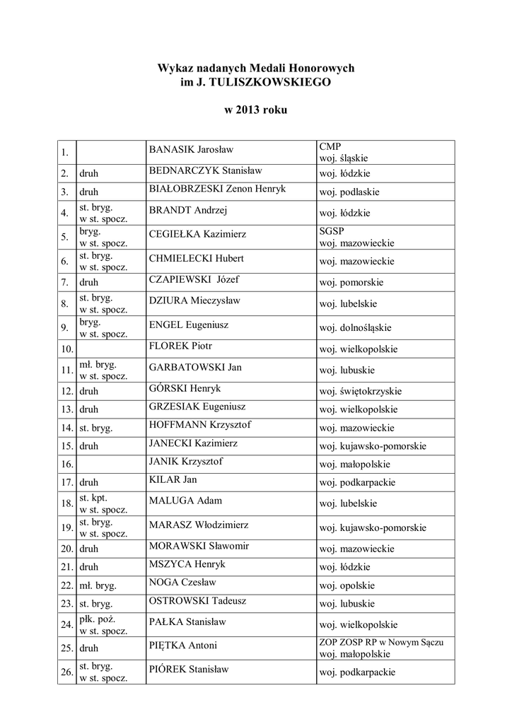 Wykaz nadanych Medali Honorowych im J. TULISZKOWSKIEGO w 2013 roku 2. druh BEDNARCZYK Stanisław CMP woj. śląskie woj. łódzkie 3. druh st. bryg. w st. spocz. bryg. w st. spocz. st. bryg. w st. spocz. druh st. bryg. w st. spocz. bryg. w st. spocz. BIAŁOBRZESKI Zenon Henryk woj. podlaskie BRANDT Andrzej woj. łódzkie CEGIEŁKA Kazimierz SGSP woj. mazowieckie CHMIELECKI Hubert woj. mazowieckie CZAPIEWSKI Józef woj. pomorskie DZIURA Mieczysław woj. lubelskie ENGEL Eugeniusz woj. dolnośląskie 10. FLOREK Piotr woj. wielkopolskie mł. bryg. w st. spocz. 12. druh GARBATOWSKI Jan woj. lubuskie GÓRSKI Henryk woj. świętokrzyskie 13. druh GRZESIAK Eugeniusz woj. wielkopolskie 14. st. bryg. HOFFMANN Krzysztof woj. mazowieckie 15. druh JANECKI Kazimierz woj. kujawsko-pomorskie 16. JANIK Krzysztof woj. małopolskie 17. druh st. kpt. 18. w st. spocz. st. bryg. 19. w st. spocz. 20. druh KILAR Jan woj. podkarpackie MALUGA Adam woj. lubelskie MARASZ Włodzimierz woj. kujawsko-pomorskie MORAWSKI Sławomir woj. mazowieckie 21. druh MSZYCA Henryk woj. łódzkie 22. mł. bryg. NOGA Czesław woj. opolskie 23. st. bryg. płk. poż. 24. w st. spocz. OSTROWSKI Tadeusz woj. lubuskie PAŁKA Stanisław woj. wielkopolskie 25. druh PIĘTKA Antoni ZOP ZOSP RP w Nowym Sączu st. bryg. 26. w st. spocz. PIÓREK Stanisław woj. podkarpackie BANASIK Jarosław 1. 4. 5. 6. 7. 8. 9. 11. woj. małopolskie płk poż. w st. spocz. st. bryg. 28. w st. spocz. st. bryg. 29. w st. spocz. st. bryg. 30. w st. spocz. 27. PILAWSKI Władysław złoty medal POROWSKI Lucjan woj. podlaskie PRZEWOŹNIAK Marian woj. wielkopolskie ROKUJŻO Manfred woj. opolskie 32. Samodzielna Pracownia Ochrony Przeciwpożarowej Lasu Instytutu Badawczego Leśnictwa SKALIK Jarosław 33. druh SKONIECZNY Marian woj. zachodniopomorskie 34. druh SKUBIS Ireneusz woj. śląskie 35. druh st. bryg. 36. w st. spocz. 37. SŁABICKI Kazimierz woj. dolnośląskie SOCHA Jacenty woj. świętokrzyskie STANECKA Bogumiła woj. wielkopolskie 38. nadbryg. STĘPIEŃ Karol woj. opolskie 39. płk lek. med. STOINSKI Grzegorz woj. dolnośląskie 40. SZCZEPAŃSKI Przemysław woj. wielkopolskie SZŁAPA Roman woj. śląskie ULATOWSKI Waldemar woj. warmińsko-mazurskie UTRATA Kazimierz woj. śląskie WIECZORKOWSKI Jerzy Piotr woj. łódzkie WIELKIEWICZ Andrzej woj. małopolskie 46. druh WOLNICZAK Stanisław 47. druh ZALEWSKI Marian woj. wielkopolskie KW PSP w Krakowie woj. małopolskie woj. mazowieckie 31. 41. 42. 43. 44. 45. st. kpt. w st. spocz. bryg. w st. spocz. st. bryg. st. asp. w st. spocz. druh 48. 49. druh Zawodowa Straż Pożarna PKN ORLEN w Płocku ŻABKA Włodzimierz Warszawa woj. wielkopolskie woj. mazowieckie 2