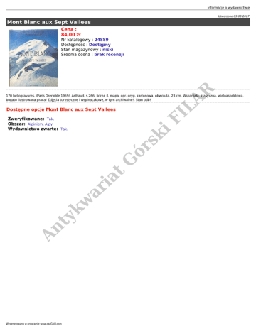 Informacje o wydawnictwie Utworzono 03-03-2017 Mont Blanc aux Sept Vallees Cena : 84,00 zł R Nr katalogowy : 24889 Dostępność : Dostępny Stan magazynowy : niski Średnia ocena : brak recenzji LA 170 heliogravures. /Paris Grenoble 1959/. Arthaud. s.266. liczne il. mapa. opr. oryg. kartonowa. obwoluta. 23 cm. Wspaniała, klasyczna, wieloaspektowa, bogato ilustrowana praca! Zdjęcia turystyczne i wspinaczkowe, w tym archiwalne!. Stan bdb! FI Dostępne opcje Mont Blanc aux Sept Vallees An ty k w ar ia t G ór sk i Zweryfikowane: Tak. Obszar: Alpinizm, Alpy. Wydawnictwo zwarte: Tak. Wygenerowano w programie www.oscGold.com