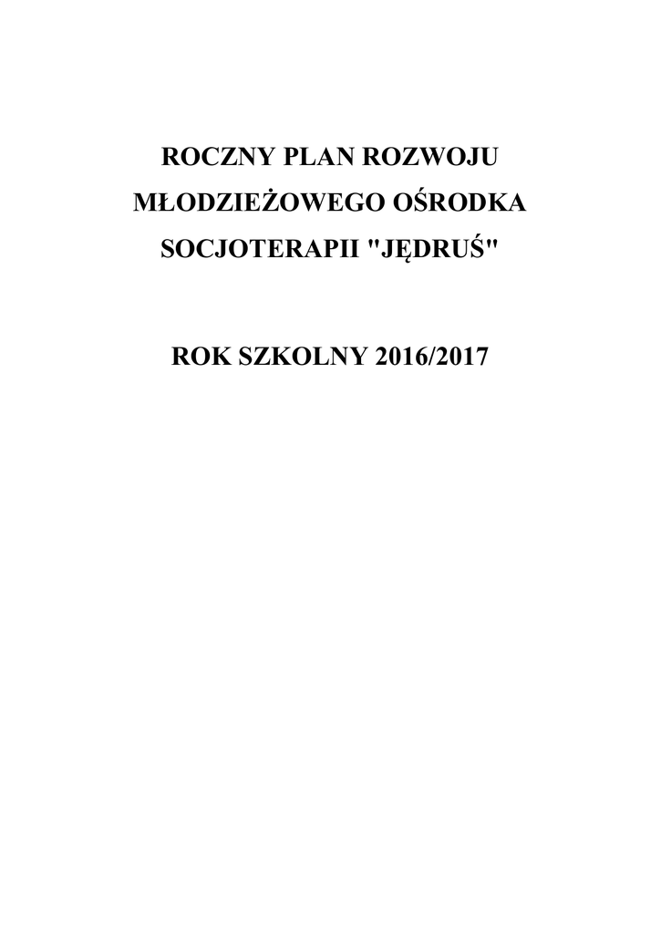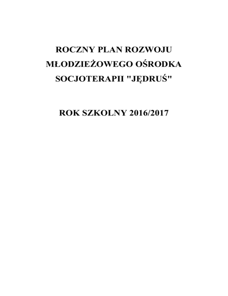 ROCZNY PLAN ROZWOJU MŁODZIEŻOWEGO OŚRODKA SOCJOTERAPII "JĘDRUŚ" ROK SZKOLNY 2016/2017 Cel ogólny1. Nabywanie umiejętności i wiadomości przez wychowanków zgodnie z podstawą programową wynikającą z polityki oświatowej państwa. Cele szczegółowe: 1. Diagnoza i ocena poziomu wiedzy i umiejętności uczniów 2. Korelacja między przedmiotowa 3. Wdrożenie wniosków wynikających z diagnozy i oceny poziomu wiedzy i umiejętności do realizacji procesów edukacyjnych 4. Wdrażanie do czytelnictwa Formy realizacji: wybór i opracowanie programów nauczania dostosowanie szkolnego zestawu podręczników opracowanie tygodniowego planu zajęć szkolnych i opiekuńczowychowawczych pogotowie języka angielskiego wykorzystywanie w procesie dydaktycznym technik informatycznych testy kompetencji klas. III, V i VI możliwość korzystania przez wychowanków ze stale aktualizowanych zbiorów bibliotecznych Cel ogólny2. Praca z uczniem o specjalnych potrzebach edukacyjnych Cele szczegółowe: diagnozowanie i analizowanie potrzeb i możliwości wychowanków formułowanie i wdrażanie wniosków z analizy potrzeb i możliwości wychowanków opracowanie indywidualnych programów edukacyjno - terapeutycznych Formy realizacji 1. Wymiana spostrzeżeń i wnioski do dalszej pracy podczas spotkań: 2. 3. 4. 5. 6. 7. 8. Zespołów ds.opracowania indywidualnych programów edukacyjnoterapeutycznych Zespołów ds. oceny poziomu funkcjonowania wychowanka oraz oceny efektywności zastosowanych form i metod Zespołów interdyscyplinarnych Zespołów problemowych, doraźnych Zajęcia dydaktyczno-wyrównawcze Indywidualne wspomaganie dydaktyczne i emocjonalne Zajęcia korekcyjno-kompensacyjne Zajecia logopedyczne Indywidualna terapia psychologiczna Zajęcia socjoterapeutyczne Terapie wspomagające: Integracja sensoryczna Biofeedback Trening uwagi słuchowej wg. A.Tomatisa, Trening pamięci i koncentracji Stymulacja polisensoryczna Terapia kontaktu metodą W. Sherborne Cel ogólny 3. Aktywizowanie wychowanków Cele szczegółowe: motywowanie wychowanków do podejmowania różnych form aktywności na rzecz własnego rozwoju i rozwoju placówki zindywidualizowane działania zmierzające do wyodrębnienia aktywności charakterystycznej dla danego wychowanka umożliwiające osiągnięcie sukcesu uczestniczenie wychowanków w zajęciach organizowanych przez placówkę. Formy realizacji: Imprezy i uroczystości wg ustalonego harmonogramu kółka zainteresowań drużyna ZHP konkursy przedmiotowe i okolicznościowe przeglądy efektów pracy kół zainteresowań (przedstawienia) turnieje sportowe uczestnictwo uczniów w procesie demokratyzacji życia społeczności ośrodka: -samorządy klasowe - Sejmik - Sąd koleżeński karta rowerowa cykliczne spotkania w Bibliotece Miejskiej Gazetka Jędrusia pod redakcją wychowanków Cel ogólny 4. Przygotowanie wychowanków do funkcjonowania w społeczeństwie. Kształtowanie postaw. Wychowanie do wartości. Cele szczegółowe: Kształtowanie nawyku u dzieci przestrzegania bezpieczeństwa na terenie placówki, a także poza nią, przedstawienie i wdrożenie wychowankom obowiązujących norm i zasad ( tworzenie wewnętrznych regulaminów obowiązujących w grupach internackich) Podejmowanie działań profilaktycznych, mających na celu przeciwdziałanie bądź eliminowanie uzależnień Kształtowanie własnej świadomości; wrażliwości moralnej oraz umiejętności oceny zachowań hierarchizacja dokonywanych wyborów i wspomaganie w dążeniu do samodzielnego podejmowania decyzji kształtowanie postaw moralnych propagowanie zdrowego stylu życia uwrażliwienie na akty przemocy w cyberprzestrzeni. Formy realizacji: zajęcia wynikające z realizacji programów opiekuńczo- wychowawczych, zajęcia socjoterapeutyczne zajęcia społeczności grupowej z elementami socjoterapii (w tym zasady zachowania bezpieczeństwa zdrowia i życia oraz prawa dziecka) apele szkolne godziny wychowawcze (w tym szczególnie bezpieczeństwo i prawa dziecka ) zajecia psychoedukacyjne zajęcia z zakresu profilaktyki uniwersalnej i wskazującej (w tym szczególnie od środków psychoaktywnych i komputerów) zajęcia dotyczące zagrożeń cyberprzestrzeni. działania Koordynatora ds.bezpieczeństwa PRZEBIEG I DOSKONALENIE PROCESÓW EDUKACYJNO – WYCHOWAWCZYCH ZGODNYCH Z KONCEPCJĄ PRACY PLACÓWKI Cel ogólny 1. Koncepcja i organizacja pracy placówki Cele szczegółowe: analiza i modyfikacja koncepcji i organizacji zgodnie z wymogami prawnymi i potrzebami powołanie zespołów diagnostyczno-terapeutycznych dostosowanie wymagań edukacyjnych do możliwości uczniów diagnozowanie uczniów organizacja dodatkowych zajeć sporządzanie planów pracy udzielanie pomocy psychologiczno-pedagogicznej uczniom i rodzicom Formy realizacji: Praca w zespołach a) aktualizujących dokumentację placówki: Statut, Program Profilaktyki , Program Wychowawczy Szkoły , Roczny Plan Rozwoju Placówki. b) Ewaluacyjnych c) zadaniowych Rady Pedagogiczne Rady szkoleniowe w ramach WDN Zespoły diagnostyczne, Zespoły ds.opracowania IPET, Zespoły ds. oceny funkcjonowania wychowanka oraz oceny efektywności zastosowanych form i metod, Zespoły interdyscyplinarne pomoc psychologiczno- pedagogiczna poprzez udział w zajęciach - korekcyjno- kompensacyjnych -logopedycznych - socjoterapeutycznych - profilaktycznych - terapii behawioralno- poznawczej - integracji sensorycznej - stymulacji polisensorycznej - biofeedback - treningu uwagi słuchowej, - trening pamięci i koncentracji - indywidualnej terapii psychologicznej i rozmowach wspierających - terapii kontaktu met. W.Sherborne - psychoedukacji - wyrównawczych i pogotowiach przedmiotowych Cel główny 2. MONITOROWANIE PROCESÓW EDUKACYJNYCH I WYCHOWAWCZYCH Cele szczegółowe: Współdziałanie nauczycieli, wychowawców, terapeutów, pedagogów Ewaluacja procesów rozwojowych Formy realizacji: WDN obserwacje rady pedagogiczne analiza wyników nauczania-uczenia się analiza wyników