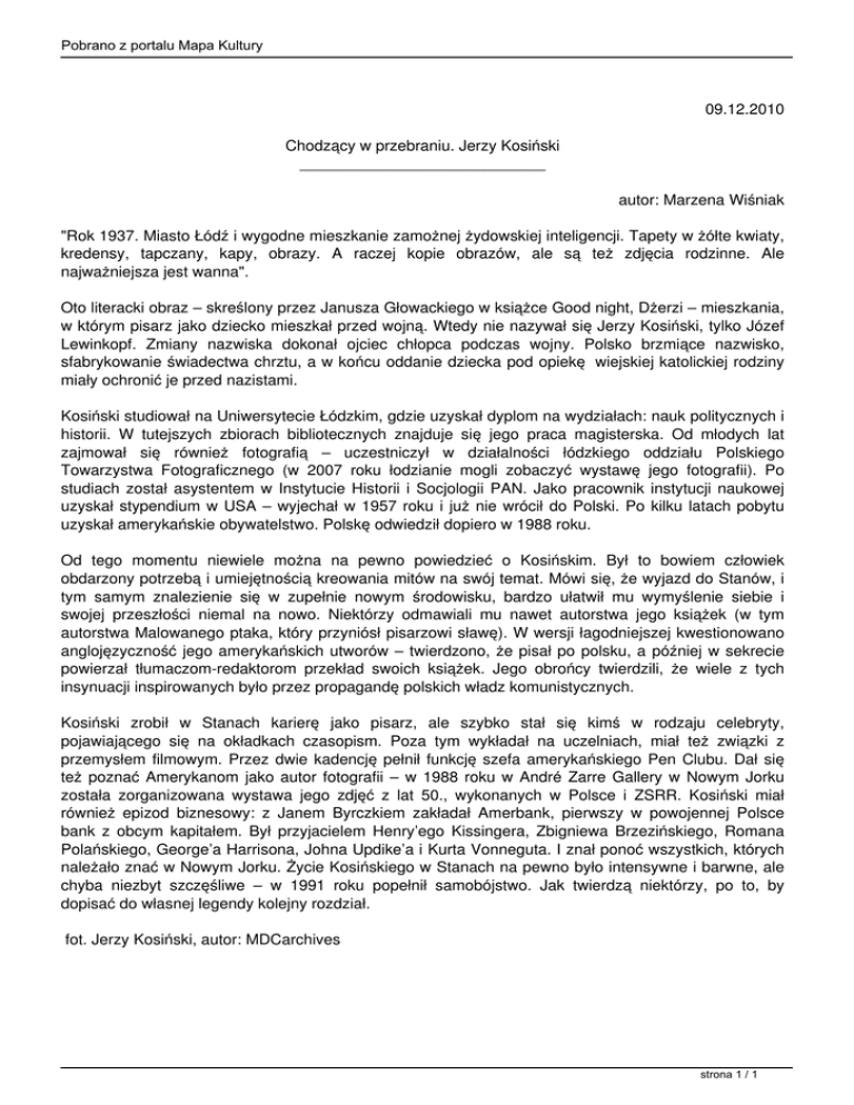 Pobrano z portalu Mapa Kultury 09.12.2010 Chodzący w przebraniu. Jerzy Kosiński ____________________________ autor: Marzena Wiśniak "Rok 1937. Miasto Łódź i wygodne mieszkanie zamożnej żydowskiej inteligencji. Tapety w żółte kwiaty, kredensy, tapczany, kapy, obrazy. A raczej kopie obrazów, ale są też zdjęcia rodzinne. Ale najważniejsza jest wanna". Oto literacki obraz – skreślony przez Janusza Głowackiego w książce Good night, Dżerzi – mieszkania, w którym pisarz jako dziecko mieszkał przed wojną. Wtedy nie nazywał się Jerzy Kosiński, tylko Józef Lewinkopf. Zmiany nazwiska dokonał ojciec chłopca podczas wojny. Polsko brzmiące nazwisko, sfabrykowanie świadectwa chrztu, a w końcu oddanie dziecka pod opiekę wiejskiej katolickiej rodziny miały ochronić je przed nazistami. Kosiński studiował na Uniwersytecie Łódzkim, gdzie uzyskał dyplom na wydziałach: nauk politycznych i historii. W tutejszych zbiorach bibliotecznych znajduje się jego praca magisterska. Od młodych lat zajmował się również fotografią – uczestniczył w działalności łódzkiego oddziału Polskiego Towarzystwa Fotograficznego (w 2007 roku łodzianie mogli zobaczyć wystawę jego fotografii). Po studiach został asystentem w Instytucie Historii i Socjologii PAN. Jako pracownik instytucji naukowej uzyskał stypendium w USA – wyjechał w 1957 roku i już nie wrócił do Polski. Po kilku latach pobytu uzyskał amerykańskie obywatelstwo. Polskę odwiedził dopiero w 1988 roku. Od tego momentu niewiele można na pewno powiedzieć o Kosińskim. Był to bowiem człowiek obdarzony potrzebą i umiejętnością kreowania mitów na swój temat. Mówi się, że wyjazd do Stanów, i tym samym znalezienie się w zupełnie nowym środowisku, bardzo ułatwił mu wymyślenie siebie i swojej przeszłości niemal na nowo. Niektórzy odmawiali mu nawet autorstwa jego książek (w tym autorstwa Malowanego ptaka, który przyniósł pisarzowi sławę). W wersji łagodniejszej kwestionowano anglojęzyczność jego amerykańskich utworów – twierdzono, że pisał po polsku, a później w sekrecie powierzał tłumaczom-redaktorom przekład swoich książek. Jego obrońcy twierdzili, że wiele z tych insynuacji inspirowanych było przez propagandę polskich władz komunistycznych. Kosiński zrobił w Stanach karierę jako pisarz, ale szybko stał się kimś w rodzaju celebryty, pojawiającego się na okładkach czasopism. Poza tym wykładał na uczelniach, miał też związki z przemysłem filmowym. Przez dwie kadencję pełnił funkcję szefa amerykańskiego Pen Clubu. Dał się też poznać Amerykanom jako autor fotografii – w 1988 roku w André Zarre Gallery w Nowym Jorku została zorganizowana wystawa jego zdjęć z lat 50., wykonanych w Polsce i ZSRR. Kosiński miał również epizod biznesowy: z Janem Byrczkiem zakładał Amerbank, pierwszy w powojennej Polsce bank z obcym kapitałem. Był przyjacielem Henry’ego Kissingera, Zbigniewa Brzezińskiego, Romana Polańskiego, George’a Harrisona, Johna Updike’a i Kurta Vonneguta. I znał ponoć wszystkich, których należało znać w Nowym Jorku. Życie Kosińskiego w Stanach na pewno było intensywne i barwne, ale chyba niezbyt szczęśliwe – w 1991 roku popełnił samobójstwo. Jak twierdzą niektórzy, po to, by dopisać do własnej legendy kolejny rozdział. fot. Jerzy Kosiński, autor: MDCarchives strona 1 / 1
