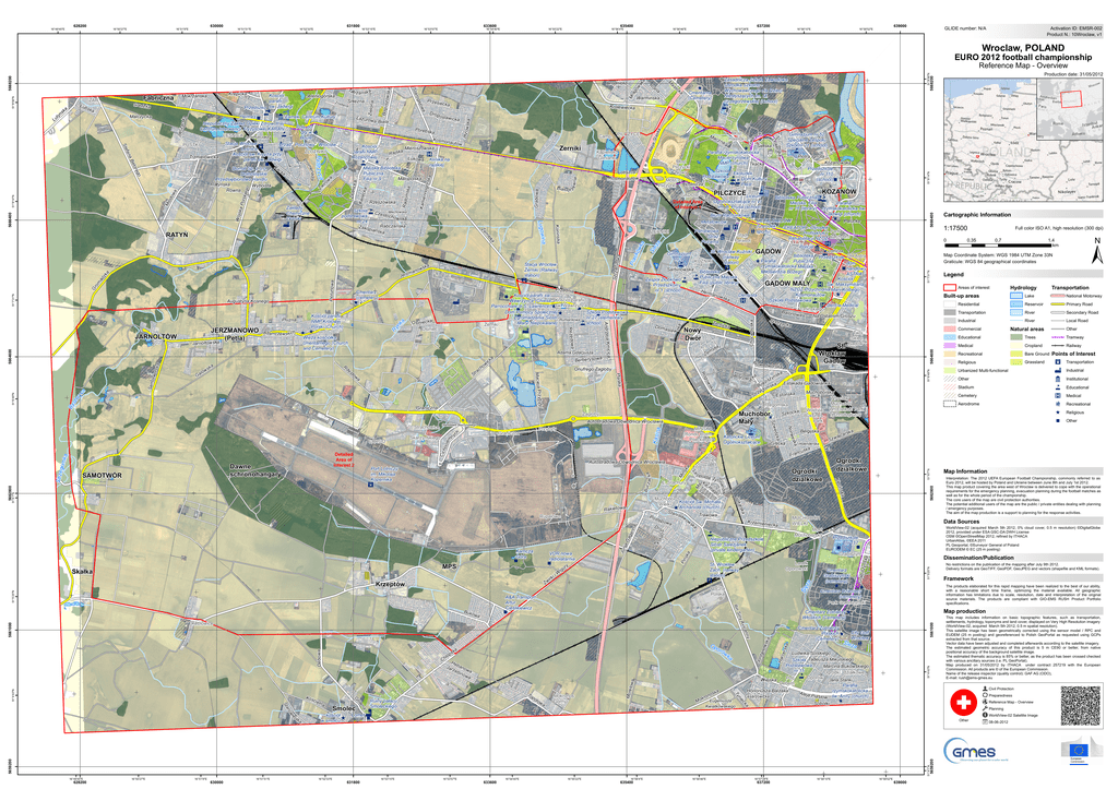 628200 16°49'45"E 16°50'27"E 630000 16°51'9"E 16°51'51"E 631800 16°52'33"E 16°53'15"E 633600 16°53'57"E 16°54'40"E 635400 16°55'22"E 16°56'4"E 16°56'46"E 637200 16°57'28"E 16°58'10"E 639000 16°58'52"E GLIDE number: N/A Activation ID: EMSR-002 Product N.: 10Wroclaw, v1 Wroclaw, POLAND EURO 2012 football championship 51°8'56"N 51°8'14"N 5666400 wna Gwa a Sla sk Ale ja Sl ez a 16°51'9"E 630000 16°51'51"E 16°52'33"E Ślę za Transportation River Secondary Road 16°53'57"E 633600 16°54'40"E 16°55'22"E 16°56'4"E 635400 16°56'46"E 16°57'28"E 637200 5664600 51°6'49"N Local Road Natural areas Other Trees Cropland Bare Ground Recreational Grassland Religious Urbanized Multi-functional Other Tramway Railway Points of Interest X D 9 4 K m ^ Transportation Industrial Institutional Educational Medical Recreational Religious Other 51°6'7"N 5662800 Map Information Interpretation: The 2012 UEFA European Football Championship, commonly referred to as Euro 2012, will be hosted by Poland and Ukraine between June 8th and July 1st 2012. This map product covering the area west of Wroclaw is delivered to cope with the operational requirements for the emergency planning, evacuation planning during the football matches as well as for the whole period of the championship. The core users of the map are civil protection authorities. The potential additional users of the map are the public / private entities dealing with planning / emergency purposes. The aim of the map production is a support to planning for the response activities. ska Dissemination/Publication 51°5'25"N Cmentarz Grabiszyński " ^ (cemetery) ^ cers k Framework The products elaborated for this rapid mapping have been realized to the best of our ability, with a reasonable short time frame, optimizing the material available. All geographic information has limitations due to scale, resolution, date and interpretation of the original source materials. The products are compliant with GIO-EMS RUSH Product Portfolio specifications. ^ Cmentarz Dzieciecy (cemetery) Park Grabiszyński Map production 5661000 City Golf Wrocław Ślez a No restrictions on the publication of the mapping after July 9th 2012. Delivery formats are GeoTIFF, GeoPDF, GeoJPEG and vectors (shapefile and KML formats). m 51°4'43"N H ar This map includes information on basic topographic features, such as transportation, settlements, hydrology, toponyms and land cover, displayed on Very High Resolution imagery (WorldView-02, acquired March 5th 2012, 0.5 m spatial resolution). This satellite image has been geometrically corrected using the sensor model / RPC and EUDEM (25 m posting) and georeferenced to Polish GeoPortal as requested using GCPs extracted from that source. Vector data have been adjusted and completed afterwards according to the satellite imagery. The estimated geometric accuracy of this product is 5 m CE90 or better, from native positional accuracy of the background satellite image. The estimated thematic accuracy is 85% or better, as the product has been crossed checked with various ancillary sources (i.e. PL GeoPortal). Map produced on 31/05/2012 by ITHACA under contract 257219 with the European Commission. All products are © of the European Commission. Name of the release inspector (quality control): GAF AG (ODO), E-mail: [email protected] Civil Protection rzymskokatolicka Al eja Pia stów św. Anny (church) Sobótki Preparedness Reference Map - Overview ^ Planning Other 16°53'15"E River WorldView-02 (acquired March 5th 2012, 0% cloud cover, 0.5 m resolution) ©DigitalGlobe 2012, provided under ESA GSC-DA DWH License OSM ©OpenStreetMap 2012, refined by ITHACA UrbanAtlas, ©EEA 2011 PL Geoportal, ©Surveyor General of Poland EURODEM © EC (25 m posting) Przedszkole nr 117 " " Grabiszyń a a wsk a no Jor d Primary Road Data Sources Lomet D " 631800 Reservoir a 16°58'10"E 16°58'52"E 51°4'1"N 16°50'27"E National Motorway " 5659200 628200 Transportation Residential Aerodrome 5659200 ie 16°49'45"E Lake Cemetery iszyn Pin ska M Eugeniusza Kwiatkowskiego Hydrology Stadium Gr a b Ma z a c ka B uc rina wa More lo 51°7'31"N Chociebuska inska Jur ija G aga 51°5'25"N Debowa 5668200 a sk s ka Piolunowa Pia skó wk a Mi ns ka Ry nk a C ic hoc ie Kasin a ska t w or Sam o By str zy ca a gom k Strze Szcze c ka ad z Gr om 51°7'31"N 5664600 51°6'7"N wa Mokronos Górny Areas of interest Medical ka cins ol o ± 1,4 km Legend Educational Ogródki dzialkowe Cmentarz Zotnierzy Polskich ^ (Cemetery) Honoriusza Balzaka Cesarzowicka 0,7 Commercial Ludwika Solskiego Szkoła Tadeusza Mikulskiego Podstawowa Marcina Bukowskiego nr 15 Ogródki działkowe 4 Oporów Pod Wiejska Jana Stanki Debem Parafia a ck Ruiny pałacu Smoleckiego " a os k n o okr 0,35 Industrial Kle 5662800 a 5661000 esk To p sk car Full color ISO A1, high resolution (300 dpi) Built-up areas Cmentarz Zotnierzy ^ Włoskich (Cemetery) e ni Ty 51°4'43"N No r w Poczta Polska nny He Jar bano w z eb i no a wa kościół w smolcu ^ X vice yA ow a Lasek Oporowski St. Wrokław Zach. (railway station) Op oró wk a a wn ar St jsk ps Niepubliczne Przedszkole Sióstr Salezjanek (private kindergarten) ka ka MUCHOBÓR WIELKI Most Muchoborsky cka 4 A&A Transport Artur Cieślikiewicz " wa Krzemien ie Sin Keblowice Muchobór Kościół Św. Michała Wielki ^ Archanioła (church) S ta n isla Trawowa Po s wo te p o w wa sk a Dro Ibn Buk o Smolec a VOR nowa radiolatarnia " y ur ig W ii rk i Zw Krzeptów ló E. Stachury c us Ogródki dzialkowe o pol da T yrm rka Hl as ki aj Szw Holenderska lska MPS G Grecka n Fra hobyc Karncza Góra " Belgijska a Sok Rakietowa Rupalowo Ko s cie lna 4 Katolickie Liceum Ogólnokształcące 1:17500 Map Coordinate System: WGS 1984 UTM Zone 33N Graticule: WGS 84 geographical coordinates ka anda X lo Ch MINSKA (Rondo Rotm. Pileckiego) Cartographic Information 0 Gadów Autostradowa Obwodnica Wroclawia Port Lotniczy im. Mikolaja Kopernika Skałka s yn ed z k Skarzynskiego Przybyly Graniczna KOZ