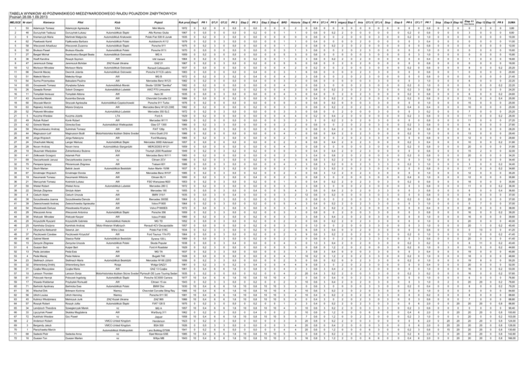 TABELA WYNIKÓW 40 POZNAŃSKIEGO MIĘDZYNARODOWEGO RAJDU POJAZDÓW ZABYTKOWYCH Poznań 28.08-1.09.2013 MIEJSCE Nr start Kierowca Pilot Klub Pojazd Rok prod. Etap1 EAA Mini Morris 1972 PR 1 OTJ1 OTJ2 PR 2 Etap 2 PR 3 Etap 3 Etap 4 BRD Historia Etap 6 PR 4 OTJ 4 PR 5 migacz Etap 7 linia OTJ 5 OTJ 6 0 0,2 0 0 0,0 0 0,0 0 0 0 2 0 0,8 0 0 0 0 0 0 Etap 11 Etap 12 Etap 13 Etap 9 Etap 10 Róża Wiatrów Stop Etap 8 PR 6 OTJ 7 PR 7 Stop PR 8 SUMA 0 0 0 0 0 0,8 0 0 0 0 0 0 0 3,80 1 53 Adamczyk Tomasz Adamczyk Agnieszka 2 46 Durczyński Tadeusz Durczyński Łukasz Automobilklub Śląski Alfa Romeo Giulia 1967 0 0,0 0 0 0,0 0 0,2 0 0 1 1 0 0,6 0 0,2 2 0 0 0 0 0 0 0,2 0 0,6 0 0 0 3 0 0 0 8,80 3 9 Kramarczyk Maria Martinek Małgorzta Automobilklub Krakowski Polski Fiat 508 III Junak 1935 0 0,2 0 3 0,0 0 0,0 0 0 0 0 0 0,6 0 0 2 0 0 0 3 0 0 0,2 0 1,0 0 0 0 0 0 0 0 10,00 4 62 Pawłowski Kamil Fijałkowska Barbara Automobilklub Polski Autobianchi A112 1979 0 0,2 0 3 0,0 0 0,0 0 0 1 1 0 0,4 0 0 0 0 2 0 0 0 0 0 3 0,4 0 0 0 0 0 0 0 11,00 5 58 Wieczorek Arkadiusz Wieczorek Zuzanna Automobilklub Śląski Porsche 911 1975 0 0,2 3 0 0,0 0 0,0 0 0 1 2 0 0,8 0 0,2 2 0 2 0 0 0 0 0 0 0,8 0 0 0 0 0 0 0 12,00 6 50 Brukszo Paweł Brukszo Klaudia Automobilklub Polski Porsche 911t 1970 0 0,0 0 0 0,0 0 0,0 0 0 3 1 3 0,6 0 0 2 0 2 3 0 0 0 0 0 1,0 0 0 0 0 0 0 0 15,60 7 27 Bargiel Michał Asankowicz-Bargiel Beata Automobilklub Ostrowski MG A 1959 0 0,2 0 0 0,0 0 0,0 0 0 5 3 0 0,6 0 0 0 0 0 3 0 0 0 0 3 1,0 0 0 0 0 0 0 0 15,80 8 36 Hoeft Karolina Roszyk Szymon AW VW Variant 1964 0 0,2 0 3 0,0 0 0,2 0 0 1 3 3 0,6 0 0,2 2 0 2 0 0 0 0 0 0 0,4 0 0 0 1 0 0 0 16,60 9 47 Jaremczuk Ostap Jaremczuk Bohdan ZAZ Kozak Ukraina GAZ 21 1967 0 0,2 0 3 0,0 0 0,2 0 0 5 5 0 0,8 0 0 2 0 2 0 0 0 0 0 0 0,8 0 0 0 0 0 0 0 19,00 10 12 Morisson Mirosław Morisson Maria Automobilklub Ostrowski Renault Celtaquatre 1937 0 0,0 0 0 0,0 0 0,0 0 0 4 2 0 0,2 0 0 2 0 0 3 0 0 0 0,2 0 0,6 0 0 0 8 0 0 0,2 20,20 11 66 Dwornik Maciej Dwornik Jolanta Automobilklub Ostrowski Porsche 911CS cabrio 1983 0 0,0 0 0 0,0 0 0,4 0 0 3 1 6 0,6 0 0 0 0 2 3 3 0 0 0 0 0,6 0 0 1 0 0 0 0 20,60 12 51 Małecki Marcin Małecka Kinga AW MG B 1972 0 0,2 0 3 0,2 0 0,4 0 0 4 2 3 0,8 0 0 2 0 2 3 0 0 0 0 0 0,8 0 0 0 0 0 0 0 21,40 13 64 Surma Przemysław Baksalara Paulina AW Mercedes Benz W123 1982 0 0,2 0 0 0,0 0 0,4 0 0 3 2 0 0,6 0 0 0 0 0 3 3 0 0 0 3 1,0 0 0 0 6 0 0 0 22,20 14 65 Groszewski Tomasz Wyrębska Sylwia Automobilklub Morski Skoda 1203M "Sanitka" 1982 0 0,2 0 0 0,0 0 0,0 0 0 4 3 0 0,6 3 0 0 0 2 3 0 0 0 0,2 0 1,0 0 0 0 5 0 0 0,2 22,20 15 26 Gawęda Roman Soboń Grzegorz Automobilklub Lubelski AWZ P70 Limousine 1958 0 0,0 3 0 0,0 0 0,2 0 0 4 2 0 0,8 0 0,2 2 0 2 3 3 0 0 0,2 3 0,8 0 0 0 0 0 0 0 24,20 16 11 Tomyślak Ireneusz Tomyślak Aldona AW Aero 30 1935 0 0,0 0 3 0,0 0 0,0 0 0 4 3 0 0,4 0 0 2 0 2 3 0 0 0 0,2 0 0,8 0 0 0 6 0 0 0,2 24,60 17 43 Kucemba Marek Kucemba Danuta AW Chevrolet Corvette C2 1966 0 0,0 0 0 0,2 0 0,0 0 0 3 3 0 0,4 0 0,2 2 0 2 0 0 0 0 0,2 0 0,6 0 0 0 13 0 0 0,4 25,00 18 60 Stryczak Marcin Stryczak Agnieszka Automobilklub Częstochowski Porsche 911 Turbo 1976 0 0,2 0 0 0,0 0 0,0 0 0 0 2 0 0,6 0 0,2 0 0 0 3 3 0 0 0 0 1,0 0 0 0 15 0 0 0 25,00 19 63 Rajewicz Andrzej Mizera Grażyna AW Mercedes Benz W123 230E 1982 0 0,2 0 0 0,0 0 0,2 0 0 3 3 0 0,6 0 0,2 2 0 2 3 0 0 0 0,4 0 0,4 0 0 0 10 0 0 0 25,00 20 52 Piskorek Mirosław Automobilklub Lubelski Mercedes 350 SLC 1972 0 0,2 0 3 0,0 0 0,0 0 0 3 3 0 0,8 0 0 2 0 0 0 3 0 0 0 3 0,2 0 0 0 7 0 0 0 25,20 21 5 Kuczma Wiesław Kuczma Józefa LTA Ford A 1929 0 0,2 0 0 0,0 0 0,0 0 0 4 4 0 0,2 0 0,4 2 0 0 0 0 0 0 0,2 3 0,8 0 0 0 11 0 0 0,2 26,00 22 49 Robak Robert Konik Robert AW Mercedes W111 1969 0 0,2 0 0 0,0 0 0,0 0 0 3 2 3 0 0 0,2 2 0 2 0 3 0 0 0 0 0,8 0 0 0 11 0 0 0 27,20 23 42 Górecki Marek Górecka Ewa Automobilklub Wielkopolski Glas GT 1300 1966 0 0,2 3 3 0,0 0 0,0 0 0 2 2 0 0,6 0 0 2 0 2 0 3 0 0 0,2 3 0,8 0 0 0 6 0 0 0 27,80 24 59 Wieczorkiewicz Andrzej Sulmiński Tomasz AW FIAT 126p 1975 0 0,0 0 3 0,0 0 0,0 0 0 4 2 0 0,6 0 0,4 2 0 0 3 3 0 0 0,4 3 0,8 0 0 0 6 0 0 0 28,20 25 44 Magnusson Leif Magnusson Bodil Motorhistoriska klubben Skåne Sveden Volvo Duett 210 1966 0 0,2 0 0 0,0 0 0,0 0 0 4 3 0 0,6 0 0,4 2 0 2 3 0 0 0 0,2 0 1,0 0 0 0 13 0 0 0 29,40 26 40 Jórga Wojciech Jórga Katarzyna AW Ford Mustang 1965 0 0,2 0 3 0,0 0 0,0 0 0 2 1 0 0,6 0 0 2 0 2 3 3 0 0 0 0 0,8 0 0 0 12 0 0 0 29,60 27 24 Chachulski Maciej Langer Mariusz Automobilklub Śląski Mercedes 300D Adenauer 1957 0 0,0 0 0 0,0 0 0,0 0 0 2 2 6 0,6 0 0,4 2 0 2 3 0 0 0 0,2 3 0,4 0 0 0 10 0 0 0,2 31,80 28 28 Nocen Andrzej Nocen Irena Automobilklub Stargardzki MERCEDES W121 1959 0 0,0 0 0 0,0 0 0,0 0 0 4 3 0 0,8 0 0 0 0 0 3 0 0 0 0,2 0 0,8 0 0 0 20 0 0 0 31,80 29 18 Słuszniak Władysław Żołnierkiewicz Bożena EAA Triumph 2000 Roadster 1949 0 0,2 0 3 0,2 0 0,2 0 0 0 3 0 0,4 0 0,4 2 0 2 3 0 0 0 0 0 0,6 0 0 0 15 2 0 0 32,00 30 41 Ziółkowski Grzegorz Adamek Piotr AW Mercedes Benz W111 1965 0 0,2 0 0 0,0 0 0,0 0 0 2 3 3 0,4 0 0,6 2 0 2 0 0 0 0 0,2 0 0,8 0 0 0 20 0 0 0 34,20 31 69 Owczarkowski Janusz Owczarkowska Joanna nz Citroen 2CV 1986 0 0,2 0 3 0,0 0 0,2 0 0 4 3 6 0,8 3 0,2 2 0 2 0 3 3 0 0 3 1,0 0 0 0 0 0 0 0 34,40 32 70 Pempera Ignacy Płócieniczak Zbigniew AW Trabant 601 1988 0 0,0 0 3 0,0 0 0,0 0 0 4 2 3 0,8 3 0,2 0 0 2 3 3 3 0 0,2 3 1,0 0 0 0 3 0 0 0,2 34,40 33 14 Stoch Marian Balicki Jacek Automobilklub Beskidzki Aston Martin 15/98 1937 0 0,0 0 3 0,2 0 0,0 0 0 2 1 0 0,2 3 0,2 2 0 2 3 0 0 0 0 0 0,8 0 0 0 17 0 0 0,2 34,60 34 67 Ernstmajer Wojciech Ernstmajer Dorota AW Mercedes Benz W107 1985 0 0,2 0 3 0,0 0 0,2 0 0 2 2 0 0,6 3 1,2 2 0 2 3 3 0 0 0 0 1,0 0 0 0 12 0 0 0 35,20 35 19 Kaczmarek Tomasz Kaczmarek Wiktoria AW Citroen BL11 1950 0 0,2 3 3 0,0 0 0,4 0 0 2 5 0 0,8 3 0 2 0 0 3 0 0 0 0,4 0 1,0 0 0 0 12 0 0 0 35,80 36 21 Sterczyński Tomasz Kośmicki Łukasz AW FSO Warszawa M20 1953 0 0,2 0 3 0,0 0 0,2 0 0 1 2 0 0,4 0 0,2 2 0 2 3 0 3 0 0,2 0 0,6 0 0 0 18