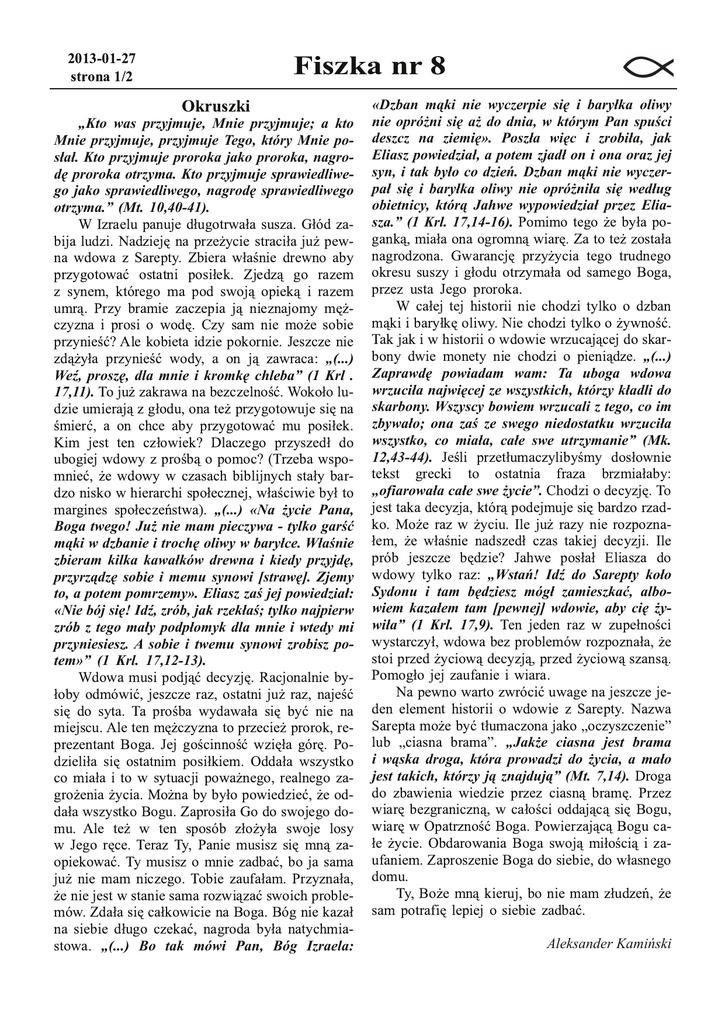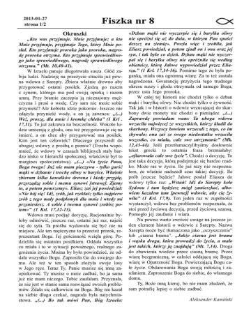 2013-01-27 strona 1/2 Fiszka nr 8 Okruszki „Kto was przyjmuje, Mnie przyjmuje; a kto Mnie przyjmuje, przyjmuje Tego, który Mnie po słał. Kto przyjmuje proroka jako proroka, nagro dę proroka otrzyma. Kto przyjmuje sprawiedliwe go jako sprawiedliwego, nagrodę sprawiedliwego otrzyma.” (Mt. 10,4041). W Izraelu panuje długotrwała susza. Głód zabija ludzi. Nadzieję na przeżycie straciła już pewna wdowa z Sarepty. Zbiera właśnie drewno aby przygotować ostatni posiłek. Zjedzą go razem z synem, którego ma pod swoją opieką i razem umrą. Przy bramie zaczepia ją nieznajomy mężczyzna i prosi o wodę. Czy sam nie może sobie przynieść? Ale kobieta idzie pokornie. Jeszcze nie zdążyła przynieść wody, a on ją zawraca: „(...) Weź, proszę, dla mnie i kromkę chleba” (1 Krl . 17,11). To już zakrawa na bezczelność. Wokoło lu- «Dzban mąki nie wyczerpie się i baryłka oliwy nie opróżni się aż do dnia, w którym Pan spuści deszcz na ziemię». Poszła więc i zrobiła, jak Eliasz powiedział, a potem zjadł on i ona oraz jej syn, i tak było co dzień. Dzban mąki nie wyczer pał się i baryłka oliwy nie opróżniła się według obietnicy, którą Jahwe wypowiedział przez Elia sza.” (1 Krl. 17,1416). Pomimo tego że była po- ganką, miała ona ogromną wiarę. Za to też została nagrodzona. Gwarancję przyżycia tego trudnego okresu suszy i głodu otrzymała od samego Boga, przez usta Jego proroka. W całej tej historii nie chodzi tylko o dzban mąki i baryłkę oliwy. Nie chodzi tylko o żywność. Tak jak i w historii o wdowie wrzucającej do skarbony dwie monety nie chodzi o pieniądze. „(...) Zaprawdę powiadam wam: Ta uboga wdowa wrzuciła najwięcej ze wszystkich, którzy kładli do skarbony. Wszyscy bowiem wrzucali z tego, co im zbywało; ona zaś ze swego niedostatku wrzuciła wszystko, co miała, całe swe utrzymanie” (Mk. 12,4344). Jeśli przetłumaczylibyśmy dosłownie dzie umierają z głodu, ona też przygotowuje się na śmierć, a on chce aby przygotować mu posiłek. Kim jest ten człowiek? Dlaczego przyszedł do ubogiej wdowy z prośbą o pomoc? (Trzeba wspomnieć, że wdowy w czasach biblijnych stały bar- tekst grecki to ostatnia fraza brzmiałaby: dzo nisko w hierarchi społecznej, właściwie był to „ofiarowała całe swe życie”. Chodzi o decyzję. To margines społeczeństwa). „(...) «Na życie Pana, jest taka decyzja, którą podejmuje się bardzo rzadBoga twego! Już nie mam pieczywa tylko garść ko. Może raz w życiu. Ile już razy nie rozpoznamąki w dzbanie i trochę oliwy w baryłce. Właśnie łem, że właśnie nadszedł czas takiej decyzji. Ile zbieram kilka kawałków drewna i kiedy przyjdę, prób jeszcze będzie? Jahwe posłał Eliasza do przyrządzę sobie i memu synowi [strawę]. Zjemy wdowy tylko raz: „Wstań! Idź do Sarepty koło to, a potem pomrzemy». Eliasz zaś jej powiedział: «Nie bój się! Idź, zrób, jak rzekłaś; tylko najpierw zrób z tego mały podpłomyk dla mnie i wtedy mi przyniesiesz. A sobie i twemu synowi zrobisz po tem»” (1 Krl. 17,1213). Wdowa musi podjąć decyzję. Racjonalnie byłoby odmówić, jeszcze raz, ostatni już raz, najeść się do syta. Ta prośba wydawała się być nie na miejscu. Ale ten mężczyzna to przecież prorok, reprezentant Boga. Jej gościnność wzięła górę. Podzieliła się ostatnim posiłkiem. Oddała wszystko co miała i to w sytuacji poważnego, realnego zagrożenia życia. Można by było powiedzieć, że oddała wszystko Bogu. Zaprosiła Go do swojego domu. Ale też w ten sposób złożyła swoje losy w Jego ręce. Teraz Ty, Panie musisz się mną zaopiekować. Ty musisz o mnie zadbać, bo ja sama już nie mam niczego. Tobie zaufałam. Przyznała, że nie jest w stanie sama rozwiązać swoich problemów. Zdała się całkowicie na Boga. Bóg nie kazał na siebie długo czekać, nagroda była natychmiastowa. „(...) Bo tak mówi Pan, Bóg Izraela: Sydonu i tam będziesz mógł zamieszkać, albo wiem kazałem tam [pewnej] wdowie, aby cię ży wiła” (1 Krl. 17,9). Ten jeden raz w zupełności wystarczył, wdowa bez problemów rozpoznała, że stoi przed życiową decyzją, przed życiową szansą. Pomogło jej zaufanie i wiara. Na pewno warto zwrócić uwage na jeszcze jeden element historii o wdowie z Sarepty. Nazwa Sarepta może być tłumaczona jako „oczyszczenie” lub „ciasna brama”. „Jakże ciasna jest brama i wąska droga, która prowadzi do życia, a mało jest takich, którzy ją znajdują” (Mt. 7,14). Droga do zbawienia wiedzie przez ciasną bramę. Przez wiarę bezgraniczną, w całości oddającą się Bogu, wiarę w Opatrzność Boga. Powierzającą Bogu całe życie. Obdarowania Boga swoją miłością i zaufaniem. Zaproszenie Boga do siebie, do własnego domu. Ty, Boże mną kieruj, bo nie mam złudzeń, że sam potrafię lepiej o siebie zadbać. Aleksander Kamiński 2013-01-27 strona 2/2 Kamienie w ogródku Fiszka nr 8 Czas odwiedzin duszpasterskich dobiega końca. Większość z nas przyjęło już kolędę, a pozostali uczynią to w najbliższych dniach. Chciałabym dziś zachęcić do pochylenia się nad tym właśnie tematem i do udzielenia sobie samemu odpowiedzi na kilka pytań. Jakie uczucia towarzyszą mi przy okazji kolędowych odwiedzin? Cieszę się, że ksiądz odwiedzi mój dom, czy raczej odczuwam pewien dyskomfort i stres? Chętnie opowiadam o sobie i swojej rodzinie, czy traktuję tego typu rozmowy jako zbędnie obnażające i naruszające prywatność? Żałuję, że ksiądz nie może zostać dłużej w moim domu, czy oddycham z ulgą, że już po wszystkim i znów spokój na rok? Odpowiedzi niech pozostaną tajemnicą naszego serca, ale jednocześnie niech będą punktem wyjścia do zastanowienia się nad znaczeniem odwiedzin duszpasterskich dla nas, którzy kolędę przyjmujemy. W Kościele katolickim wizyta duszpasterska ma swoje uzasadnienie w prawie kanonicznym: „Pragnąc dobrze wy