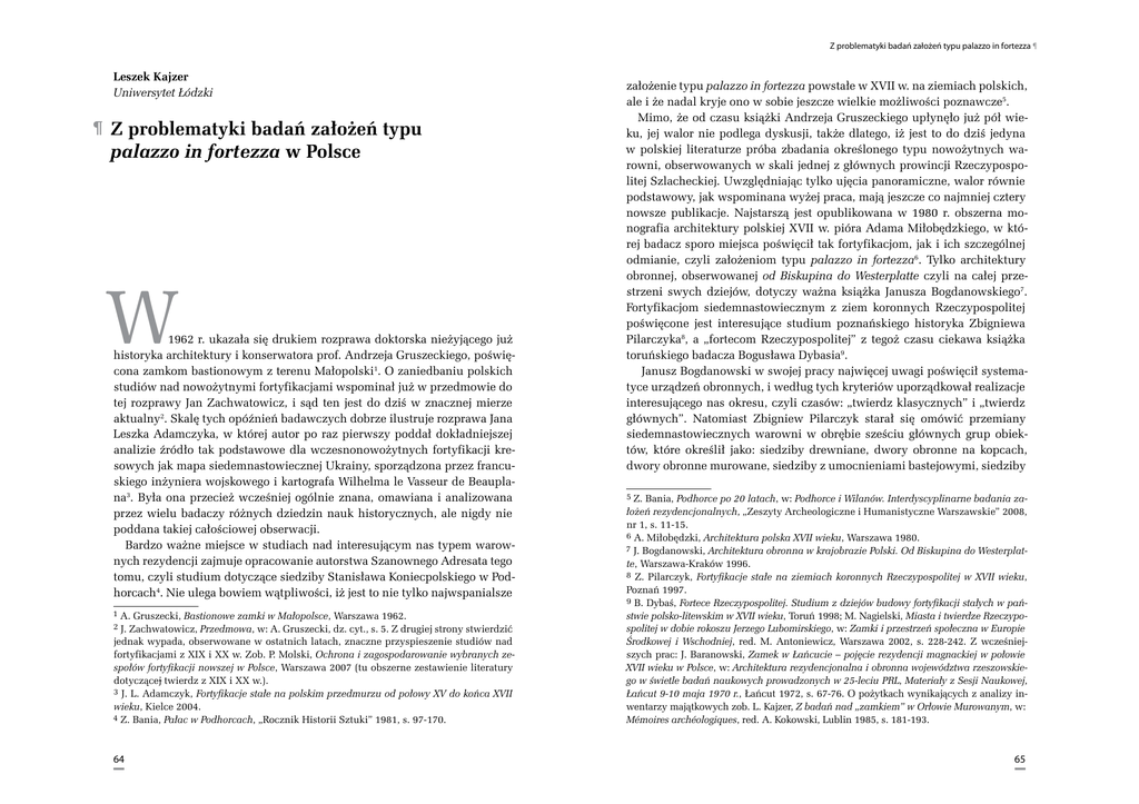Z problematyki badań założeń typu palazzo in fortezza ¶ Leszek Kajzer Uniwersytet Łódzki ¶ Z problematyki badań założeń typu palazzo in fortezza w Polsce W 1962 r. ukazała się drukiem rozprawa doktorska nieżyjącego już historyka architektury i konserwatora prof. Andrzeja Gruszeckiego, poświęcona zamkom bastionowym z terenu Małopolski1. O zaniedbaniu polskich studiów nad nowożytnymi fortyfikacjami wspominał już w przedmowie do tej rozprawy Jan Zachwatowicz, i sąd ten jest do dziś w znacznej mierze aktualny2. Skalę tych opóźnień badawczych dobrze ilustruje rozprawa Jana Leszka Adamczyka, w której autor po raz pierwszy poddał dokładniejszej analizie źródło tak podstawowe dla wczesnonowożytnych fortyfikacji kresowych jak mapa siedemnastowiecznej Ukrainy, sporządzona przez francuskiego inżyniera wojskowego i kartografa Wilhelma le Vasseur de Beauplana3. Była ona przecież wcześniej ogólnie znana, omawiana i analizowana przez wielu badaczy różnych dziedzin nauk historycznych, ale nigdy nie poddana takiej całościowej obserwacji. Bardzo ważne miejsce w studiach nad interesującym nas typem warownych rezydencji zajmuje opracowanie autorstwa Szanownego Adresata tego tomu, czyli studium dotyczące siedziby Stanisława Koniecpolskiego w Podhorcach4. Nie ulega bowiem wątpliwości, iż jest to nie tylko najwspanialsze 1 A. Gruszecki, Bastionowe zamki w Małopolsce, Warszawa 1962. 2 J. Zachwatowicz, Przedmowa, w: A. Gruszecki, dz. cyt., s. 5. Z drugiej strony stwierdzić jednak wypada, obserwowane w ostatnich latach, znaczne przyspieszenie studiów nad fortyfikacjami z XIX i XX w. Zob. P. Molski, Ochrona i zagospodarowanie wybranych zespołów fortyfikacji nowszej w Polsce, Warszawa 2007 (tu obszerne zestawienie literatury dotyczącej twierdz z XIX i XX w.). 3 J. L. Adamczyk, Fortyfikacje stałe na polskim przedmurzu od połowy XV do końca XVII wieku, Kielce 2004. 4 Z. Bania, Pałac w Podhorcach, „Rocznik Historii Sztuki” 1981, s. 97-170. 64 założenie typu palazzo in fortezza powstałe w XVII w. na ziemiach polskich, ale i że nadal kryje ono w sobie jeszcze wielkie możliwości poznawcze5. Mimo, że od czasu książki Andrzeja Gruszeckiego upłynęło już pół wieku, jej walor nie podlega dyskusji, także dlatego, iż jest to do dziś jedyna w polskiej literaturze próba zbadania określonego typu nowożytnych warowni, obserwowanych w skali jednej z głównych prowincji Rzeczypospolitej Szlacheckiej. Uwzględniając tylko ujęcia panoramiczne, walor równie podstawowy, jak wspominana wyżej praca, mają jeszcze co najmniej cztery nowsze publikacje. Najstarszą jest opublikowana w 1980 r. obszerna monografia architektury polskiej XVII w. pióra Adama Miłobędzkiego, w której badacz sporo miejsca poświęcił tak fortyfikacjom, jak i ich szczególnej odmianie, czyli założeniom typu palazzo in fortezza6. Tylko architektury obronnej, obserwowanej od Biskupina do Westerplatte czyli na całej przestrzeni swych dziejów, dotyczy ważna książka Janusza Bogdanowskiego7. Fortyfikacjom siedemnastowiecznym z ziem koronnych Rzeczypospolitej poświęcone jest interesujące studium poznańskiego historyka Zbigniewa Pilarczyka8, a „fortecom Rzeczypospolitej” z tegoż czasu ciekawa książka toruńskiego badacza Bogusława Dybasia9. Janusz Bogdanowski w swojej pracy najwięcej uwagi poświęcił systematyce urządzeń obronnych, i według tych kryteriów uporządkował realizacje interesującego nas okresu, czyli czasów: „twierdz klasycznych” i „twierdz głównych”. Natomiast Zbigniew Pilarczyk starał się omówić przemiany siedemnastowiecznych warowni w obrębie sześciu głównych grup obiektów, które określił jako: siedziby drewniane, dwory obronne na kopcach, dwory obronne murowane, siedziby z umocnieniami bastejowymi, siedziby 5 Z. Bania, Podhorce po 20 latach, w: Podhorce i Wilanów. Interdyscyplinarne badania założeń rezydencjonalnych, „Zeszyty Archeologiczne i Humanistyczne Warszawskie” 2008, nr 1, s. 11-15. 6 A. Miłobędzki, Architektura polska XVII wieku, Warszawa 1980. 7 J. Bogdanowski, Architektura obronna w krajobrazie Polski. Od Biskupina do Westerplatte, Warszawa-Kraków 1996. 8 Z. Pilarczyk, Fortyfikacje stałe na ziemiach koronnych Rzeczypospolitej w XVII wieku, Poznań 1997. 9 B. Dybaś, Fortece Rzeczypospolitej. Studium z dziejów budowy fortyfikacji stałych w państwie polsko-litewskim w XVII wieku, Toruń 1998; M. Nagielski, Miasta i twierdze Rzeczypospolitej w dobie rokoszu Jerzego Lubomirskiego, w: Zamki i przestrzeń społeczna w Europie Środkowej i Wschodniej, red. M. Antoniewicz, Warszawa 2002, s. 228-242. Z wcześniejszych prac: J. Baranowski, Zamek w Łańcucie – pojęcie rezydencji magnackiej w połowie XVII wieku w Polsce, w: Architektura rezydencjonalna i obronna województwa rzeszowskiego w świetle badań naukowych prowadzonych w 25-leciu PRL, Materiały z Sesji Naukowej, Łańcut 9-10 maja 1970 r., Łańcut 1972, s. 67-76. O pożytkach wynikających z analizy inwentarzy majątkowych zob. L. Kajzer, Z badań nad „zamkiem” w Orłowie Murowanym, w: Mémoires archéologiques, red. A. Kokowski, Lublin 1985, s. 181-193. 65 ¶ Leszek Kajzer z umocnieniami bastionowymi i zespoły obronne. Inną drogą w swej systematyzacji poszedł Bogusław Dybaś, zwracając szczególną uwagę na inicjatorów i decydentów budowy twierdz, zróżnicowanie inicjatyw państwowych, magnackich i miejskich, rolę projektantów i wreszcie problem funkcjonowania warowni w warunkach realiów gospodarczych i społecznych interesującego nas okresu. Widać, że autorzy omawianych prac, wywodząc się swymi korzeniami z odmiennych tradycji analitycznych i różnych doświadczeń metodologicznych prezentowanych przez siebie nauk historycznych, w równie zróżnicowany sposób podchodzili do całokształtu problematyki warowni XVII w. Nie komentując tych dość zrozumiałych dla mnie różnic w optyce poznawczej, prezentow