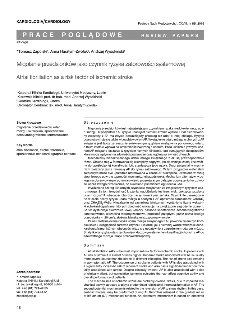 KARDIOLOGIA/CARDIOLOGY PRACE Postępy Nauk Medycznych, t. XXVIII, nr 8B, 2015 POGLĄDOWE REVIEW PAPERS ©Borgis *Tomasz Zapolski1, Anna Haratym-Zwolak2, Andrzej Wysokiński1 Migotanie przedsionków jako czynnik ryzyka zatorowości systemowej Atrial fibrillation as a risk factor of ischemic stroke 1 Katedra i Klinika Kardiologii, Uniwersytet Medyczny, Lublin Kierownik Kliniki: prof. dr hab. med. Andrzej Wysokiński 2 Centrum Kardiologii, Chełm Ordynator Centrum: lek. med. Anna Haratym-Zwolak Słowa kluczowe Streszczenie migotanie przedsionków, udar mózgu, skrzeplina, spontaniczne echokardiograficzne kontrastowanie Migotanie przedsionków jest najważniejszym czynnikiem ryzyka niedokrwiennego udaru mózgu. U pacjentów z AF ryzyko udaru jest niemal 5-krotnie wyższe. Udar niedokrwienny związany z AF ma zwykle poważniejszy przebieg niż udar o innej etiologii. Ryzyko udaru utrzymuje się także w bezobjawowym AF. Wystąpienie udaru mózgu u chorych z AF związane jest także ze znacznie zwiększonym ryzykiem wystąpienia ponownego udaru, a także istotnie wpływa na umieralność związaną z udarem. Poza klinicznie jawnymi udarami AF związane jest także w ryzykiem niemych klinicznie, lecz sumujących się epizodów, które mogą wpływać na zdolności poznawcze oraz ogólną sprawność chorych. Mechanizmy niedokrwiennego udaru mózgu związanego z AF są prawdopodobnie różne. Główną rolę w formowaniu się skrzepliny odgrywa, jak się wydaje, zastój krwi wtórny do upośledzonej kurczliwości LA, a zwłaszcza jego uszka. Drugi potencjalny mechanizm związany jest z rewersją AF do rytmu zatokowego. W tym przypadku materiałem zatorowym może być uprzednio uformowana w czasie AF skrzeplina, uwolniona w miarę stopniowego powrotu czynności mechanicznej przedsionka. Mechanizm alternatywny polega na obserwowanym po umiarowieniu przemijającym dalszym pogorszeniu kurczliwości uszka lewego przedsionka, co określane jest mianem ogłuszenia LAA. Wyróżniono szereg klinicznych czynników związanych ze zwiększonym ryzykiem udaru mózgu. Są to: niewydolność krążenia, nadciśnienie tętnicze, wiek, cukrzyca, przebyty udar mózgu/TIA, obecność choroby naczyniowej i płeć żeńska. Czynniki te uszeregowano w skale oceny ryzyka udaru mózgu u chorych z AF opatrzone akronimami: CHADS2 oraz CHA2DS2-VASc. Niezależnie od czynników klinicznych wyróżniono liczne wskaźniki echokardiograficzne, których obecność wskazuje na zwiększone zagrożenie udarem. Są to: dysfunkcja skurczowa lewej komory, nasilone spontaniczne echokardiograficzne kontrastowanie, skrzeplina wewnątrzsercowa, prędkość przepływu przez uszko lewego przedsionka < 20 cm/s, złożona blaszka miażdżycowa w aorcie. Pełna i rzetelna ocena ryzyka udaru mózgu związanego z AF powinna zatem być kompleksowa i uwzględniać zarówno czynniki kliniczne, jak i niemniej ważne wskaźniki echokardiograficzne, których obecność wiąże się negatywnie z zagrożeniem udarem mózgu. Stratyfikacja ryzyka udaru jest bowiem kluczowym elementem kwalifikacji chorych z AF do adekwatnego rodzaju terapii przeciwzakrzepowej. Key words atrial fibrillation, stroke, thrombus, spontaneous echocardiographic contrast Summary Adres/address: *Tomasz Zapolski Katedra i Klinika Kardiologii UM ul. Jaczewskiego 8, 20-950 Lublin tel. +48 (81) 724-42-55 fax +48 (81) 724-41-51 [email protected] 48 Atrial fibrillation (AF) is the most important risk factor in ischemic stroke. In patients with AF risk of stroke it is almost 5 times higher. Ischemic stroke associated with AF is usually more severe course than the stroke of different etiologies. The risk of stroke also remains in asymptomatic AF. The occurrence of stroke in patients with AF is also associated with a significantly increased risk of recurrent stroke and also has a significant impact on mortality associated with stroke. Despite clinically evident, AF is also associated with a risk of clinically silent, but cumulative ischemic episodes that can affect cognitive ability and overall performance of patients. The mechanisms of ischemic stroke are probably diverse. Stasis, due to impaired mechanical activity, appears to play a predominant role in atrial thrombus formation in AF. The second potential mechanism is related to the reversion of AF to sinus rhythm. In this case, embolic material may be pre-formed during AF thrombus released in the gradual return of left atrium (LA) mechanical function. An alternative mechanism is based on observed Migotanie przedsionków jako czynnik ryzyka zatorowości systemowej after reversion of AF to sinus rhythm transient deteriorate of left atrium appendage (LAA) contractility, what is called LAA stunning phenomenon. There are several clinical factors associated with an increased risk of stroke, including: heart failure, hypertension, age, diabetes, previous stroke/TIA, the presence of vascular disease, female. These factors were classified in the scores assessing the risk of stroke in patients with AF and given the acronyms: CHADS2 and CHA2DS2-VASc. Regardless of the number of clinical factors, several echocardiographic markers associated with increased risk of ischemic stroke have been recognized. They include: left ventricular systolic dysfunction, increased spontaneous echocardiographic contrast, intracardiac thrombus formation, LAA flow velocity < 20 cm/s, complex atherosclerotic plaque in the aorta. Full and thorough evaluation of the risk of stroke associated with AF should therefore be comprehensive and include both clinical factors and still important echocardiographic indicators, the presence of which negatively associated with the risk of stroke. Stroke risk stratification is in fact a key element of qualifications and AF patients at appropriate type of anticoagulant therapy. WSTĘP W ostatnich latach nasza wiedza i zrozumienie zagadnienia arytmii sercowych wzrosło znacznie w porównaniu ze stanem sprzed 50 lat. Pomimo to jednak w okr