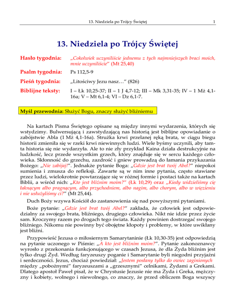 13. Niedziela po Trójcy Świętej 1 13. Niedziela po Trójcy Świętej Hasło tygodnia: „Cokolwiek uczyniliście jednemu z tych najmniejszych braci moich, mnie uczyniliście” (Mt 25,40) Psalm tygodnia: Ps 112,5-9 Pieśń tygodnia: „Litościwy Jezu nasz…” (826) Biblijne teksty: I – Łk 10,25-37; II – 1 J 4,7-12; III – Mk 3,31-35; IV – 1 Mż 4,116a; V – Mt 6,1-4; VI – Dz 6,1-7. Myśl przewodnia: Służyć Bogu, znaczy służyć bliźniemu Na kartach Pisma Świętego opisane są między innymi wydarzenia, których się wstydzimy. Bulwersującą i zawstydzającą nas historią jest biblijne opowiadanie o zabójstwie Abla (1 Mż 4,1-16a). Strużka krwi przelanej ręką brata, w ciągu biegu historii zmieniła się w rzeki krwi niewinnych ludzi. Wiele byśmy uczynili, aby tamta historia się nie wydarzyła. Ale to nie zły przykład Kaina działa destrukcyjnie na ludzkość, lecz przede wszystkim grzech, który znajduje się w sercu każdego człowieka. Skłonność do grzechu, zazdrość i gniew prowadzą do łamania przykazania Bożego: „Nie zabijaj!”. Jednakże pytanie Boga: „Gdzie jest brat twój Abel?” niepokoi sumienia i zmusza do refleksji. Zawarte są w nim inne pytania, często stawiane przez ludzi, wielokrotnie powtarzające się w różnej formie i postaci także na kartach Biblii, a wśród nich: „Kto jest bliźnim moim?” (Łk 10,29) oraz „Kiedy widzieliśmy cię łaknącym albo pragnącym, albo przychodniem, albo nagim, albo chorym, albo w więzieniu i nie usłużyliśmy ci?” (Mt 25,44). Duch Boży wzywa Kościół do zastanowienia się nad powyższymi pytaniami. Boże pytanie: „Gdzie jest brat twój Abel?” zakłada, że człowiek jest odpowiedzialny za swojego brata, bliźniego, drugiego człowieka. Nikt nie idzie przez życie sam. Kroczymy razem po drogach tego świata. Każdy powinien dostrzegać swojego bliźniego. Nikomu nie powinny być obojętne kłopoty i problemy, w które uwikłany jest bliźni. Przypowieść Jezusa o miłosiernym Samarytaninie (Łk 10,30-35) jest odpowiedzią na pytanie uczonego w Piśmie: „A kto jest bliźnim moim?”. Pytanie zakonoznawcy wyrosło z przekonania funkcjonującego w czasach Jezusa, że dla Żyda bliźnim jest tylko drugi Żyd. Według faryzeuszy poganie i Samarytanie byli niegodni przyjaźni i serdeczności. Jezus, chociaż powiedział: „Jestem posłany tylko do owiec zaginionych między „pobożnymi” faryzeuszami a „grzesznymi” celnikami, Żydami a Grekami. Dlatego apostoł Paweł pisał, że w Chrystusie Jezusie nie ma Żyda i Greka, mężczyzny i kobiety, wolnego i niewolnego, co znaczy, że przed obliczem Boga wszyscy 13. Niedziela po Trójcy Świętej 2 ludzie są sobie równi. Każdy dla każdego jest bliźnim, bratem i siostrą. Bóg nieustannie pyta nas: „Gdzie jest brat twój?” W przypowieści o miłosiernym Samarytaninie Jezus nie tylko poddał krytyce pobożność zakonną, ale wskazał na wzór postępowania człowieka, który zapomniał o urazach i śpieszył z pomocą człowiekowi jej potrzebującemu. Przykazanie miłości jest ponad wszelkie przepisy dotyczące czystości rytualnej i sprawowanie kultu. Wszelkie działanie człowieka powinno jemu być podporządkowane. Miłość znosi podziały. Przekracza granice etniczne, społeczne i religijne. Rozmawiający z Jezusem uczony w Piśmie uznał pierwszeństwo przykazania miłości przed wszystkimi przepisami prawa, lecz jego faryzejska pobożność stawiała bariery. Dlatego pytanie zakonoznawcy: „Kto jest bliźnim moim?” (Łk 10,29), należy do tej samej kategorii, co pytanie Kaina: „Czyż jestem stróżem brata mego?” (1 Mż 4,9). Z przypowieści o miłosiernym Samarytaninie wyrosło wielkie dzieło diakonii. Wyznawcy Jezusa Chrystusa wcześnie uświadomili sobie potrzebę niesienia pomocy biednym, chorym i opuszczonym. W prazborze w Jerozolimie ustanowiono instytucję diakonów. Wyznaczeni przez Kościół w Jerozolimie i wyświęceni przez apostołów mężowie pełni Ducha Świętego, mieli usługiwać przy stołach (Dz 6,1-7). Wielkie zakłady misji wewnętrznej, jak np. w Betel, Dzięgielowie itd. są odpowiedzią na wezwanie Jezusa: „Idź, i ty czyń podobnie!”. Wolą Bożą jest, aby chrześcijanie nieśli pomoc ludziom potrzebującym ratunku, opieki i wsparcia. Kościół powołany jest do diakonii, służby w świecie, w którym ciągle ludzie padają ofiarą złego. Jedynie ci, którzy posłuszni są woli swojego Ojca Niebieskiego, należą do rodziny Jezusa Chrystusa. Pan Jezus powiedział: „Ktokolwiek czyni wolę Bożą, ten jest moim bratem i siostrą, i matką” (Mk 3,35). W wielu krajach opiekę socjalną nad ludźmi samotnymi, chorymi i potrzebującymi pomocy objęło państwo. Ale pionierem tej pracy był Kościół. Pomimo przejęcia opieki nad ludźmi opuszczonymi, upośledzonymi i chorymi przez rządy wielu krajów, to jednak chrześcijańskie Kościoły nie mogą zrezygnować z kontynuowania samarytańskiej służby. Jeśli chcą być posłuszne woli Bożej, muszą wiele uwagi poświęcić diakonii. Kościół i wyznawcy Jezusa Chrystusa są przedmiotem miłości Bożej. Obdarowani miłością, miłością winni na nią odpowiedzieć. Miłość, poświęcenie, służba, niesienie pomocy bliźniemu jest znakiem wiary, która – jak pisze apostoł Paweł – powinna być czynna w miłości (por. Ga 5,6). Miłość jest też znakiem nowego życia. Apostoł Jan napomina nas: „Miłujmy się wzajemnie, gdyż miłość jest z Boga, i każdy, kto miłuje, z Boga się narodził i zna Boga… Jeżeli nawzajem się miłujemy, Bóg mieszka w nas i miłość jego doszła w nas do doskonałości” (J 4,7.12) Kto nie udziela pomocy potrzebującemu, popełnia grzech zaniedbania (por. Jk 4,17). Wierzący chrześcijanin powinien być zawsze świadomy tego, że nie tylko jest to grzech zaniedbania wobec bliźniego, lecz także wobec Pana Kościoła, Jezusa Chrystusa, który często do nas przyc