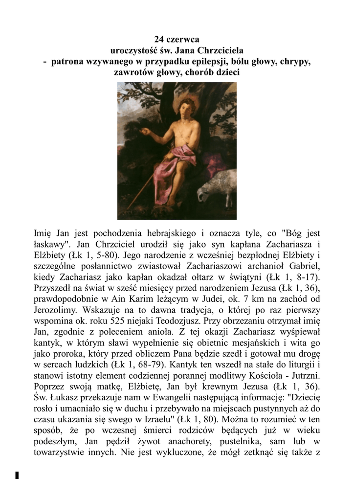 24 czerwca uroczystość św. Jana Chrzciciela - patrona wzywanego w przypadku epilepsji, bólu głowy, chrypy, zawrotów głowy, chorób dzieci Imię Jan jest pochodzenia hebrajskiego i oznacza tyle, co "Bóg jest łaskawy". Jan Chrzciciel urodził się jako syn kapłana Zachariasza i Elżbiety (Łk 1, 5-80). Jego narodzenie z wcześniej bezpłodnej Elżbiety i szczególne posłannictwo zwiastował Zachariaszowi archanioł Gabriel, kiedy Zachariasz jako kapłan okadzał ołtarz w świątyni (Łk 1, 8-17). Przyszedł na świat w sześć miesięcy przed narodzeniem Jezusa (Łk 1, 36), prawdopodobnie w Ain Karim leżącym w Judei, ok. 7 km na zachód od Jerozolimy. Wskazuje na to dawna tradycja, o której po raz pierwszy wspomina ok. roku 525 niejaki Teodozjusz. Przy obrzezaniu otrzymał imię Jan, zgodnie z poleceniem anioła. Z tej okazji Zachariasz wyśpiewał kantyk, w którym sławi wypełnienie się obietnic mesjańskich i wita go jako proroka, który przed obliczem Pana będzie szedł i gotował mu drogę w sercach ludzkich (Łk 1, 68-79). Kantyk ten wszedł na stałe do liturgii i stanowi istotny element codziennej porannej modlitwy Kościoła - Jutrzni. Poprzez swoją matkę, Elżbietę, Jan był krewnym Jezusa (Łk 1, 36). Św. Łukasz przekazuje nam w Ewangelii następującą informację: "Dziecię rosło i umacniało się w duchu i przebywało na miejscach pustynnych aż do czasu ukazania się swego w Izraelu" (Łk 1, 80). Można to rozumieć w ten sposób, że po wczesnej śmierci rodziców będących już w wieku podeszłym, Jan pędził żywot anachorety, pustelnika, sam lub w towarzystwie innych. Nie jest wykluczone, że mógł zetknąć się także z 1 esseńczykami, którzy wówczas mieli nad Morzem Martwym w Qumran swoją wspólnotę. Kiedy miał już lat 30, wolno mu było według prawa występować publicznie i nauczać. Podjął to dzieło nad Jordanem, nad brodem w pobliżu Jerycha. Czasem przenosił się do innych miejsc, np. Betanii (J 1, 28) i Enon (Ainon) w pobliżu Salim (J 3, 23). Swoje nauczenie rozpoczął w piętnastym roku panowania cesarza Tyberiusza (Łk 3, 1), czyli w 30 r. naszej ery według chronologii, którą się zwykło podawać. Jako herold Mesjasza Jan podkreślał z naciskiem, że nie wystarczy przynależność do potomstwa Abrahama, ale trzeba czynić owoce pokuty, trzeba wewnętrznego przeobrażenia. Na znak skruchy i gotowości zmiany życia udzielał chrztu pokuty (Łk 3, 7-14; Mt 3, 7-10; Mk 1, 8). Garnęła się do niego "Jerozolima i cała Judea, i wszelka kraina wokół Jordanu" (Mt 3, 5; Mk 1, 5). Zaczęto nawet go pytać, czy przypadkiem on sam nie jest zapowiadanym Mesjaszem. Jan stanowczo rozwiewał wątpliwości twierdząc, że "Ten, który idzie za mną, mocniejszy jest ode mnie: ja nie jestem godzien nosić Mu sandałów" (Mt 3, 11). Na prośbę Chrystusa, który przybył nad Jordan, Jan udzielił Mu chrztu. Potem niejeden raz widział Chrystusa nad Jordanem i świadczył o Nim wobec tłumu: "Oto Baranek Boży, który gładzi grzechy świata" (J 1, 29. 36). Na skutek tego wyznania, przy Chrystusie Panu zjawili się dwaj pierwsi uczniowie - Jan i Andrzej, którzy dotąd byli uczniami św. Jana (J 1, 37-40). Na działalność Jana szybko zwrócili uwagę starsi ludu. Bali się jednak jawnie przeciwko niemu występować, woleli raczej zająć stanowisko wyczekujące (J 1, 19; Mt 3, 7). Osobą Jana zainteresował się także władca Galilei, Herod II Antypas (+ 40), syn Heroda I Wielkiego, który nakazał wymordować dzieci w Betlejem. Można się domyślać, że Herod wezwał Jana do swojego zamku, Macherontu. Gorzko jednak pożałował swojej ciekawości. Jan bowiem skorzystał z tej okazji, aby rzucić mu prosto w oczy: "Nie wolno ci mieć żony twego brata" (Mk 6, 18). Rozgniewany król, z poduszczenia żony brata Filipa, którą ku ogólnemu oburzeniu Herod wziął za własną, oddalając swoją żonę prawowitą, nakazał Jana aresztować. W dniu swoich urodzin wydał ucztę, w czasie której, pijany, pod przysięgą zobowiązał się dać córce Herodiady, Salome, wszystko, o cokolwiek zażąda. Ta po naradzeniu się z matką zażądała głowy Jana. Herod nakazał katowi wykonać wyrok śmierci na Janie i jego głowę przynieść na misie dla Salome (Mt 14, 1-12). Jan miał wtedy trzydzieści kilka lat. Jezus wystawił Janowi świadectwo, jakiego żaden człowiek z Jego ust nie 2 otrzymał: "Coście wyszli oglądać na pustyni? (...) Proroka zobaczyć? Tak, powiadam wam, nawet więcej niż proroka. On jest tym, o którym napisano: Oto ja posyłam mego wysłańca przed Tobą, aby Ci przygotował drogę. Zaprawdę powiadam wam: Między narodzonymi z niewiast nie powstał większy od Jana Chrzciciela" (Mt 11, 7-11; Łk 7, 24-27). Jan Chrzciciel jako jedyny wśród świętych Pańskich cieszy się takim przywilejem, iż obchodzi się jako uroczystość dzień jego narodzin. U wszystkich innych świętych obchodzimy jako święto dzień ich śmierci czyli dzień ich narodzin dla nieba. Ponadto w kalendarzu liturgicznym znajduje się także wspomnienie męczeńskiej śmierci św. Jana Chrzciciela, obchodzone 29 sierpnia. W Janie Chrzcicielu uderza jego świętość, życie pełne ascezy i pokuty, siła charakteru, bezkompromisowość. Był pierwszym świętym czczonym w całym Kościele. Jemu dedykowana jest bazylika rzymska św. Jana na Lateranie, będąca katedrą papieża. W ikonografii św. Jan Chrzciciel jest przedstawiany jako dziecko, młodzieniec lub mąż ascetyczny, ubrany w skórę zwierzęcą albo płaszcz z sierści wielbłąda. Jego atrybutami są: Baranek Boży, baranek na ramieniu, na księdze lub u stóp, baranek z kielichem, chłopiec bawiący się z barankiem, głowa na misie, krzyż. W tradycji wschodniej, zwłaszcza w ikonach, ukazywany jest jako zwiastun ze skrzydłami. Modlitwy: Boże, wysłałeś św. Jana Chrzciciela, aby był zwiastunem Twego Syna, który urodził się i umarł za nas. Pozwól nam wyznawać