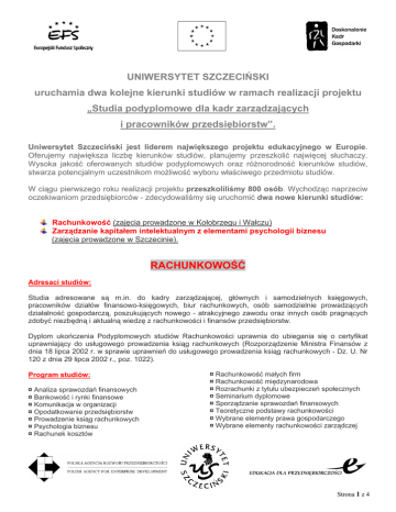 UNIWERSYTET SZCZECIŃSKI uruchamia dwa kolejne kierunki studiów w ramach realizacji projektu „Studia podyplomowe dla kadr zarządzających i pracowników przedsiębiorstw”. Uniwersytet Szczeciński jest liderem największego projektu edukacyjnego w Europie. Oferujemy największa liczbę kierunków studiów, planujemy przeszkolić najwięcej słuchaczy. Wysoka jakość oferowanych studiów podyplomowych oraz różnorodność kierunków studiów, stwarza potencjalnym uczestnikom możliwość wyboru właściwego przedmiotu studiów. W ciągu pierwszego roku realizacji projektu przeszkoliliśmy 800 osób. Wychodząc naprzeciw oczekiwaniom przedsiębiorców - zdecydowaliśmy się uruchomić dwa nowe kierunki studiów: Rachunkowość (zajęcia prowadzone w Kołobrzegu i Wałczu) Zarządzanie kapitałem intelektualnym z elementami psychologii biznesu (zajęcia prowadzone w Szczecinie). RACHUNKOWOŚĆ Adresaci studiów: Studia adresowane są m.in. do kadry zarządzającej, głównych i samodzielnych księgowych, pracowników działów finansowo-księgowych, biur rachunkowych, osób samodzielnie prowadzących działalność gospodarczą, poszukujących nowego - atrakcyjnego zawodu oraz innych osób pragnących zdobyć niezbędną i aktualną wiedzę z rachunkowości i finansów przedsiębiorstw. Dyplom ukończenia Podyplomowych studiów Rachunkowości uprawnia do ubiegania się o certyfikat uprawniający do usługowego prowadzenia ksiąg rachunkowych (Rozporządzenie Ministra Finansów z dnia 18 lipca 2002 r. w sprawie uprawnień do usługowego prowadzenia ksiąg rachunkowych - Dz. U. Nr 120 z dnia 29 lipca 2002 r., poz. 1022). Program studiów: ¤ Analiza sprawozdań finansowych ¤ Bankowość i rynki finansowe ¤ Komunikacja w organizacji ¤ Opodatkowanie przedsiębiorstw ¤ Prowadzenie ksiąg rachunkowych ¤ Psychologia biznesu ¤ Rachunek kosztów ¤ Rachunkowość małych firm ¤ Rachunkowość międzynarodowa ¤ Rozrachunki z tytułu ubezpieczeń społecznych ¤ Seminarium dyplomowe ¤ Sporządzanie sprawozdań finansowych ¤ Teoretyczne podstawy rachunkowości ¤ Wybrane elementy prawa gospodarczego ¤ Wybrane elementy rachunkowości zarządczej Strona 1 z 4 Opłaty i sekretariaty studiów podyplomowych: Kołobrzeg: Wałcz: Koszt małego/średniego przedsiębiorcy: 761,86 zł Koszt małego/średniego przedsiębiorcy: 665,04 zł Koszt dużego przedsiębiorcy: 1 523,72 zł Koszt dużego przedsiębiorcy: 1 330,08 zł Instytut Rachunkowości ul. Mickiewicza 64, 71-101 Szczecin tel. 0-91 444 19 68, tel. kom. 601 300790 e-mail: [email protected] Zamiejscowy Ośrodek Dydaktyczny w Wałczu Studia Podyplomowe Rachunkowość ul. Bydgoska 50, 78-100 Wałcz, Pokój 25 Telefon: 067 258 24 67 Sekretariat: mgr inż. Katarzyna Różycka E-mail: [email protected] ZARZĄDZANIE KAPITAŁEM INTELEKTUALNYM Z ELEMENTAMI PSYCHOLOGII BIZNESU Adresaci studiów: Studia adresowane są do kadry menedżerskiej wszystkich szczebli małych, średnich i dużych przedsiębiorstw, a także osób prowadzących własną działalność gospodarczą. Program studiów: Studia mają charakter interdyscyplinarny, łączący wiedzę z zakresu ekonomii, zarządzania, czy psychologii. Zdobyta wiedza ma charakter użyteczny i praktyczny, poparty przykładami z działalności firm. ¤ Koncepcja kapitału intelektualnego. ¤ Zarządzanie kapitałem ludzkim. ¤ Kształtowanie zasobów niematerialnych w przedsiębiorstwie. ¤ Zasoby partnerskie i klienckie w funkcjonowaniu przedsiębiorstwa. ¤ Zarządzanie innowacjami. Modele mierzenia wartości kapitału intelektualnego. ¤ System motywacyjny w organizacji. ¤ Teoria i praktyka zarządzania wiedzą w przedsiębiorstwie. ¤ Organizacja ucząca się i organizacja inteligentna jako nowoczesne koncepcje zarządzania. ¤ Zarządzanie jakością w przedsiębiorstwie. Zarządzanie czasem. ¤ Kształtowanie profesjonalnych kontaktów z klientami. ¤ Komunikacja interpersonalna. ¤ Różnice kulturowe w biznesie międzynarodowym. ¤ Negocjacje w biznesie. ¤ Konflikt w organizacji. ¤ Reakcja na stres i sposoby jego eliminowania. Strona 2 z 4 Opłaty i sekretariat studiów: Koszt małego/średniego przedsiębiorcy: 549,08 zł Koszt dużego przedsiębiorcy: 1 098,16 zł Tel. 0-91 444 20 15, tel. kom. 512 333 965; fax. 0-91 444 21 28; e-mail:[email protected]; adres do korespondencji: ul. Mickiewicza 69, 71-307 Szczecin, pokój 26. Ponadto UNIWERSYTET SZCZECIŃSKI realizuje pozostałe kierunki studiów: 11)) Analiza finansowa w zarządzaniu przedsiębiorstwem, 22)) Controlling finansowy w małych i średnich przedsiębiorstwach, 33)) Zarządzanie finansami przedsiębiorstw, 44)) Zarządzanie strategiczne w podmiotach łączności, 55)) Zarządzanie biznesem, 66)) Zarządzanie personelem w firmie, 77)) Informatyka w przedsiębiorstwie, 88)) Rynek nieruchomości, 99)) Marketing i zarządzanie przedsiębiorstwem (Szczecin i inne ośrodki), 1100)) Ubezpieczenia i rynki kapitałowe (Gorzów Wielkopolski, Koszalin, Szczecin, Wrocław), 1111)) Europrojects, 1122)) Prowadzenie działalności gospodarczej w UE, 1133)) MBA (Master of Business Administration), 1144)) Efektywność inwestycji i wycena przedsiębiorstw, 1155)) Planowanie i ocena przedsięwzięć rozwojowych. Słuchaczom studiów podyplomowych gwarantujemy: wysoką jakość kształcenia odpowiadającego europejskim standardom, wykwalifikowanych wykładowców, nowoczesne programy i bazę dydaktyczną, praktyczne podejście do omawianych zagadnień, nowoczesne metody nauczania, dbałość o sprawność organizacji studiów i komfort pracy. Strona 3 z 4 Ostateczni beneficjenci projektu Ostatecznymi Beneficjentami – uczestnikami studiów podyplomowych są: kadra zarządzająca oraz pracownicy przedsiębiorstw mających siedzibę na terytorium Rzeczypospolitej Polskiej (duże, średnie i małe przedsiębiorstwa z wszystkich sektorów, z wyłączeniem sektora węglowego), z wyjątkiem przedsiębiorstw, które pozostają pod zarządem komisaryc
