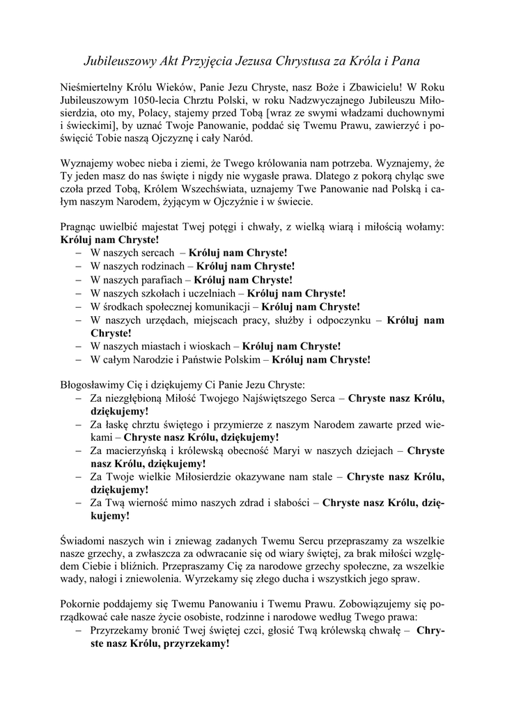 Jubileuszowy Akt Przyjęcia Jezusa Chrystusa za Króla i Pana Nieśmiertelny Królu Wieków, Panie Jezu Chryste, nasz Boże i Zbawicielu! W Roku Jubileuszowym 1050-lecia Chrztu Polski, w roku Nadzwyczajnego Jubileuszu Miłosierdzia, oto my, Polacy, stajemy przed Tobą [wraz ze swymi władzami duchownymi i świeckimi], by uznać Twoje Panowanie, poddać się Twemu Prawu, zawierzyć i poświęcić Tobie naszą Ojczyznę i cały Naród. Wyznajemy wobec nieba i ziemi, że Twego królowania nam potrzeba. Wyznajemy, że Ty jeden masz do nas święte i nigdy nie wygasłe prawa. Dlatego z pokorą chyląc swe czoła przed Tobą, Królem Wszechświata, uznajemy Twe Panowanie nad Polską i całym naszym Narodem, żyjącym w Ojczyźnie i w świecie. Pragnąc uwielbić majestat Twej potęgi i chwały, z wielką wiarą i miłością wołamy: Króluj nam Chryste! W naszych sercach – Króluj nam Chryste! W naszych rodzinach – Króluj nam Chryste! W naszych parafiach – Króluj nam Chryste! W naszych szkołach i uczelniach – Króluj nam Chryste! W środkach społecznej komunikacji – Króluj nam Chryste! W naszych urzędach, miejscach pracy, służby i odpoczynku – Króluj nam Chryste! W naszych miastach i wioskach – Króluj nam Chryste! W całym Narodzie i Państwie Polskim – Króluj nam Chryste! Błogosławimy Cię i dziękujemy Ci Panie Jezu Chryste: Za niezgłębioną Miłość Twojego Najświętszego Serca – Chryste nasz Królu, dziękujemy! Za łaskę chrztu świętego i przymierze z naszym Narodem zawarte przed wiekami – Chryste nasz Królu, dziękujemy! Za macierzyńską i królewską obecność Maryi w naszych dziejach – Chryste nasz Królu, dziękujemy! Za Twoje wielkie Miłosierdzie okazywane nam stale – Chryste nasz Królu, dziękujemy! Za Twą wierność mimo naszych zdrad i słabości – Chryste nasz Królu, dziękujemy! Świadomi naszych win i zniewag zadanych Twemu Sercu przepraszamy za wszelkie nasze grzechy, a zwłaszcza za odwracanie się od wiary świętej, za brak miłości względem Ciebie i bliźnich. Przepraszamy Cię za narodowe grzechy społeczne, za wszelkie wady, nałogi i zniewolenia. Wyrzekamy się złego ducha i wszystkich jego spraw. Pokornie poddajemy się Twemu Panowaniu i Twemu Prawu. Zobowiązujemy się porządkować całe nasze życie osobiste, rodzinne i narodowe według Twego prawa: Przyrzekamy bronić Twej świętej czci, głosić Twą królewską chwałę – Chryste nasz Królu, przyrzekamy! Przyrzekamy pełnić Twoją wolę i strzec prawości naszych sumień – Chryste nasz Królu, przyrzekamy! Przyrzekamy troszczyć się o świętość naszych rodzin i chrześcijańskie wychowanie dzieci – Chryste nasz Królu, przyrzekamy! Przyrzekamy budować Twoje królestwo i bronić go w naszym narodzie – Chryste nasz Królu, przyrzekamy! Przyrzekamy czynnie angażować się w życie Kościoła i strzec jego praw – Chryste nasz Królu, przyrzekamy! Jedyny Władco państw, narodów i całego stworzenia, Królu królów i Panie panujących! Zawierzamy Ci Państwo Polskie i rządzących Polską. Spraw, aby wszystkie podmioty władzy sprawowały rządy sprawiedliwie i stanowiły prawa zgodne z Prawami Twoimi. Chryste Królu, z ufnością zawierzamy Twemu Miłosierdziu wszystko, co Polskę stanowi, a zwłaszcza tych członków Narodu, którzy nie podążają Twymi drogami. Obdarz ich swą łaską, oświeć mocą Ducha Świętego i wszystkich nas doprowadź do wiecznej jedności z Ojcem. W imię miłości bratniej zawierzamy Tobie wszystkie narody świata, a zwłaszcza te, które stały się sprawcami naszego polskiego krzyża. Spraw, by rozpoznały w Tobie swego prawowitego Pana i Króla i wykorzystały czas dany im przez Ojca na dobrowolne poddanie się Twojemu panowaniu. Panie Jezu Chryste, Królu naszych serc, racz uczynić serca nasze na wzór Najświętszego Serca Twego. Niech Twój Święty Duch zstąpi i odnowi oblicze ziemi, tej ziemi. Niech wspiera nas w realizacji zobowiązań płynących z tego narodowego aktu, chroni od zła i dokonuje naszego uświęcenia. W Niepokalanym Sercu Maryi składamy nasze postanowienia i zobowiązania. Matczynej opiece Królowej Polski i wstawiennictwu świętych Patronów naszej Ojczyzny wszyscy się powierzamy. Króluj nam Chryste! Króluj w naszej Ojczyźnie, króluj w każdym narodzie – na większą chwałę Przenajświętszej Trójcy i dla zbawienia ludzi. Spraw, aby naszą Ojczyznę i świat cały objęło Twe Królestwo: królestwo prawdy i życia, królestwo świętości i łaski, królestwo sprawiedliwości, miłości i pokoju. * * * Oto Polska w 1050. rocznicę swego Chrztu uroczyście uznała królowanie Jezusa Chrystusa. Chwała Ojcu i Synowi, i Duchowi Świętemu, jak była na początku, teraz i zawsze, i na wieki wieków. Amen.