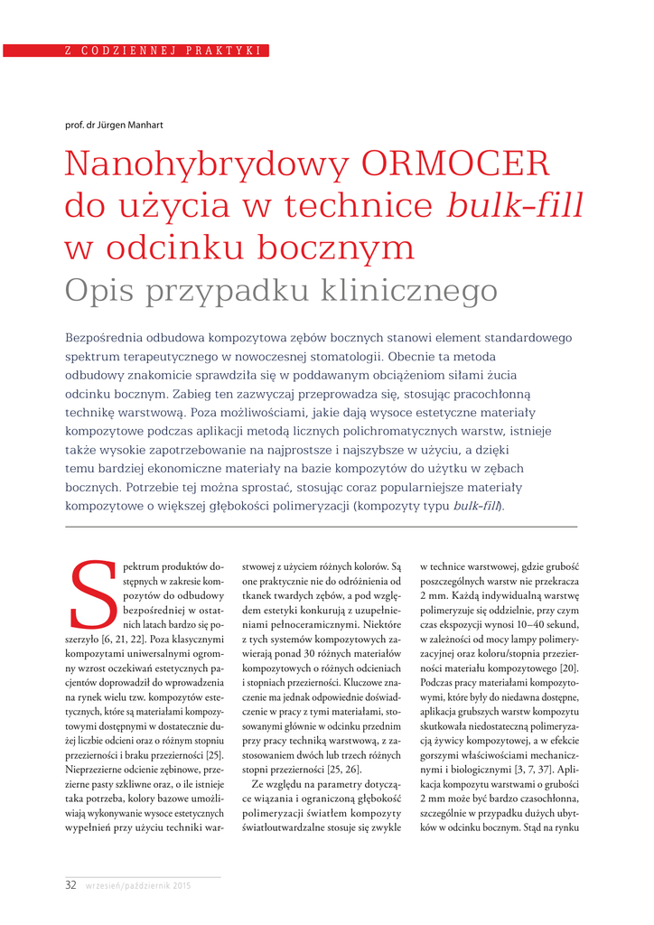 Z CODZIENNEJ PRAKTYKI prof. dr Jürgen Manhart Nanohybrydowy ORMOCER do użycia w technice bulk-fill w odcinku bocznym Opis przypadku klinicznego Bezpośrednia odbudowa kompozytowa zębów bocznych stanowi element standardowego spektrum terapeutycznego w nowoczesnej stomatologii. Obecnie ta metoda odbudowy znakomicie sprawdziła się w poddawanym obciążeniom siłami żucia odcinku bocznym. Zabieg ten zazwyczaj przeprowadza się, stosując pracochłonną technikę warstwową. Poza możliwościami, jakie dają wysoce estetyczne materiały kompozytowe podczas aplikacji metodą licznych polichromatycznych warstw, istnieje także wysokie zapotrzebowanie na najprostsze i najszybsze w użyciu, a dzięki temu bardziej ekonomiczne materiały na bazie kompozytów do użytku w zębach bocznych. Potrzebie tej można sprostać, stosując coraz popularniejsze materiały kompozytowe o większej głębokości polimeryzacji (kompozyty typu bulk-fill). S pektrum produktów dostępnych w zakresie kompozytów do odbudowy bezpośredniej w ostatnich latach bardzo się poszerzyło [6, 21, 22]. Poza klasycznymi kompozytami uniwersalnymi ogromny wzrost oczekiwań estetycznych pacjentów doprowadził do wprowadzenia na rynek wielu tzw. kompozytów estetycznych, które są materiałami kompozytowymi dostępnymi w dostatecznie dużej liczbie odcieni oraz o różnym stopniu przezierności i braku przezierności [25]. Nieprzezierne odcienie zębinowe, przezierne pasty szkliwne oraz, o ile istnieje taka potrzeba, kolory bazowe umożliwiają wykonywanie wysoce estetycznych wypełnień przy użyciu techniki war- 32 wrzesień/pa ździernik 2015 stwowej z użyciem różnych kolorów. Są one praktycznie nie do odróżnienia od tkanek twardych zębów, a pod względem estetyki konkurują z uzupełnieniami pełnoceramicznymi. Niektóre z tych systemów kompozytowych zawierają ponad 30 różnych materiałów kompozytowych o różnych odcieniach i stopniach przezierności. Kluczowe znaczenie ma jednak odpowiednie doświadczenie w pracy z tymi materiałami, stosowanymi głównie w odcinku przednim przy pracy techniką warstwową, z zastosowaniem dwóch lub trzech różnych stopni przezierności [25, 26]. Ze względu na parametry dotyczące wiązania i ograniczoną głębokość polimeryzacji światłem kompozyty światłoutwardzalne stosuje się zwykle w technice warstwowej, gdzie grubość poszczególnych warstw nie przekracza 2 mm. Każdą indywidualną warstwę polimeryzuje się oddzielnie, przy czym czas ekspozycji wynosi 10–40 sekund, w zależności od mocy lampy polimeryzacyjnej oraz koloru/stopnia przezierności materiału kompozytowego [20]. Podczas pracy materiałami kompozytowymi, które były do niedawna dostępne, aplikacja grubszych warstw kompozytu skutkowała niedostateczną polimeryzacją żywicy kompozytowej, a w efekcie gorszymi właściwościami mechanicznymi i biologicznymi [3, 7, 37]. Aplikacja kompozytu warstwami o grubości 2 mm może być bardzo czasochłonna, szczególnie w przypadku dużych ubytków w odcinku bocznym. Stąd na rynku istnieje dość duże zapotrzebowanie na materiały na bazie kompozytów, pozwalające na prostą i szybką, a więc bardziej ekonomiczną pracę w przypadku takich wskazań [2]. W celu zaspokojenia tej potrzeby w ostatnich latach opracowano kompozyty typu bulk-fill, które – pod warunkiem korzystania z lampy polimeryzacyjnej o dostatecznie wysokiej mocy – można nanosić do ubytku szybciej, stosując uproszczoną technikę aplikacji, warstwami o grubości 4–5 mm, oraz krótszy czas polimeryzacji, wynoszący 10–20 sekund [5, 8, 20, 27, 28]. Określenie oznacza dosłownie możliwość zastosowania tych materiałów do jednoetapowego wypełnienia całego ubytku, bez konieczności stosowania techniki warstwowej [14]. Obecnie spośród plastycznych materiałów odtwórczych pozwalają na to tylko cementy oraz kompozyty do odbudowy rdzenia zębów, aktywowane chemicznie albo wykazujące podwójny mechanizm wiązania. Jednak te pierwsze nie mają dostatecznie dobrych właściwości mechanicznych, aby móc wykonywać wypełnienia cechujące się stabilnością kliniczną w perspektywie długoterminowej w odcinkach bocznych uzębienia stałego, poddawanych obciążeniom zwarciowym. W efekcie można je stosować wyłącznie jako wypełnienia przejściowe lub długoterminowe wypełnienia tymczasowe [10, 16, 24]. Z kolei druga wspomniana grupa nie jest zatwierdzona jako materiały do odbudowy ani nie nadaje się do takich zastosowań z punktu widzenia pracy z nimi (np. modelowania powierzchni zwarciowych). Kompozyty typu bulk-fill, dostępne obecnie do stosowania w uproszczonej technice zakładania wypełnień w odcinku bocznym, nie pozwalają faktycznie na odbudowę dosłownie jedną warstwą. Bardziej szczegółowe badania wykazały, że w warunkach klinicznych ubytki, szczególnie na powierzchniach interproksymalnych, są zasadniczo głęb- sze niż maksymalna głębokość polimeryzacji podawana dla tych materiałów (4–5 mm) [9, 11]. Wobec tego można wypełniać ubytki o głębokości do 8 mm, nakładając materiał w 2 warstwach, pod warunkiem wybrania odpowiedniego materiału – a ten zakres obejmuje wymiary większości ubytków, z jakimi można spotkać się w rutynowej praktyce klinicznej. Większość kompozytów zawiera organiczną matrycę złożoną z monomerów opartych na konwencjonalnych metakrylanach [35]. Technologie siloranów [13, 17, 18, 23, 38, 45] i ormocerów [15, 31, 32, 39, 41–44] przedstawiają alternatywne podejście. Ormocery (organicznie modyfikowana ceramika) to modyfikowane organicznie, niezawierające metalu, nieorganiczne materiały kompozytowe [12]. Ormocery można sklasyfikować pomiędzy polimerami nieorganicznymi i organicznymi, zawierają one zarówno sieć nieorganiczną, jak i organiczną [33, 34, 44]. Tę grupę materiałów opracowano we Fraunhofer Institute for Silicate Research (ISC) w Würzburgu. Po raz pierwszy zosta
