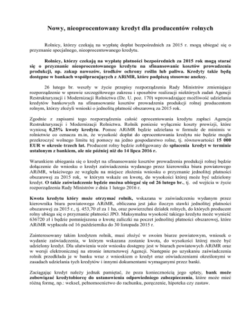 Nowy, nieoprocentowany kredyt dla producentów rolnych Rolnicy, którzy czekają na wypłatę dopłat bezpośrednich za 2015 r. mogą ubiegać się o przyznanie specjalnego, nieoprocentowanego kredytu. Rolnicy, którzy czekają na wypłatę płatności bezpośrednich za 2015 rok mogą starać się o przyznanie nieoprocentowanego kredytu na sfinansowanie kosztów prowadzenia produkcji, np. zakup nawozów, środków ochrony roślin lub paliwa. Kredyty takie będą dostępne w bankach współpracujących z ARiMR, które podpiszą stosowne aneksy. 26 lutego br. weszły w życie przepisy rozporządzenia Rady Ministrów zmieniające rozporządzenie w sprawie szczegółowego zakresu i sposobów realizacji niektórych zadań Agencji Restrukturyzacji i Modernizacji Rolnictwa (Dz. U. poz. 170) wprowadzające możliwość udzielania kredytów bankowych na sfinansowanie kosztów prowadzenia produkcji rolnej producentom rolnym, którzy złożyli wnioski o jednolitą płatność obszarową za 2015 rok. Zgodnie z zapisami tego rozporządzenia całość oprocentowania kredytu zapłaci Agencja Restrukturyzacji i Modernizacji Rolnictwa. Rolnik poniesie wyłącznie koszty prowizji, które wyniosą 0,25% kwoty kredytu. Pomoc ARiMR będzie udzielana w formule de minimis w rolnictwie co oznacza m.in, że wysokość dopłat do oprocentowania kredytu nie będzie mogła przekroczyć wolnego limitu tej pomocy na jedno gospodarstwo rolne, tj. równowartości 15 000 EUR w okresie trzech lat. Producent rolny będzie zobligowany do spłacenia kredyt w terminie ustalonym z bankiem, ale nie później niż do 14 lipca 2016 r. Warunkiem ubiegania się o kredyt na sfinansowanie kosztów prowadzenia produkcji rolnej będzie dołączenie do wniosku o kredyt zaświadczenia wydanego przez kierownika biura powiatowego ARiMR, właściwego ze względu na miejsce złożenia wniosku o przyznanie jednolitej płatności obszarowej za 2015 rok, w którym wskaże on kwotę, do wysokości której może być udzielony kredyt. O takie zaświadczenie będzie można ubiegać się od 26 lutego br., tj. od wejścia w życie rozporządzenia Rady Ministrów z dnia 1 lutego 2016 r. Kwota kredytu który może otrzymać rolnik, wskazana w zaświadczeniu wydanym przez kierownika biura powiatowego ARiMR, obliczana jest jako iloczyn stawki jednolitej płatności obszarowej za 2015 r., tj. 453,70 zł za 1 ha, oraz powierzchni działek rolnych, do których producent rolny ubiega się o przyznanie płatności JPO. Maksymalna wysokość takiego kredytu może wynieść 636720 zł i będzie pomniejszona o kwotę zaliczki na poczet jednolitej płatności obszarowej, które ARiMR wypłacała od 16 października do 30 listopada 2015 r. Zainteresowany takim kredytem rolnik, musi złożyć w swoim biurze powiatowym, wniosek o wydanie zaświadczenia, w którym wskazana zostanie kwota, do wysokości której może być udzielony kredyt. Dla ułatwienia wzór wniosku dostępny jest w biurach powiatowych ARiMR oraz w wersji elektronicznej na stronie internetowej Agencji. Następnie po uzyskaniu zaświadczenia rolnik przedkłada je w banku wraz z wnioskiem o kredyt oraz oświadczeniami określonymi w zasadach udzielania tych kredytów i innymi dokumentami wymaganymi przez banki. Zaciągając kredyt należy jednak pamiętać, że poza koniecznością jego spłaty, bank może zobowiązać kredytobiorcę do ustanowienia odpowiedniego zabezpieczenia, które może mieć różną formę, np.: weksel, pełnomocnictwo do rachunku, poręczenie, hipoteka czy zastaw. Na ustanowienie niektórych zabezpieczeń potrzeba jednak czasu, w związku z tym, w takich przypadkach w celu zabezpieczenia środków banku może zaistnieć konieczność utworzenia w tym banku rachunku, na który powinny wpłynąć płatności bezpośrednie za 2015 rok. Nowa, nieoprocentowana dla producenta rolnego, linia kredytowa będzie finansowana przez banki z ich własnych środków w ramach umów zawartych z ARiMR w zakresie udzielania kredytów preferencyjnych. Aneksy wprowadzające zapisy w zakresie stosowania pomocy zostały przekazane do następujących banków: 1. 2. 3. 4. 5. 6. 7. Bank Polskiej Spółdzielczości S.A. SGB-Bank S.A. Krakowski Bank Spółdzielczy S.A. Bank BGŻ BNP Paribas S.A. Raiffeisen Bank Polska S.A. Bank Zachodni WBK S.A. Pekao S.A. Lista banków, które podpisały aneksy do umowy o współpracy będzie na bieżąco aktualizowana na stronie internetowej ARiMR. Tekst: Departament Wsparcia Krajowego