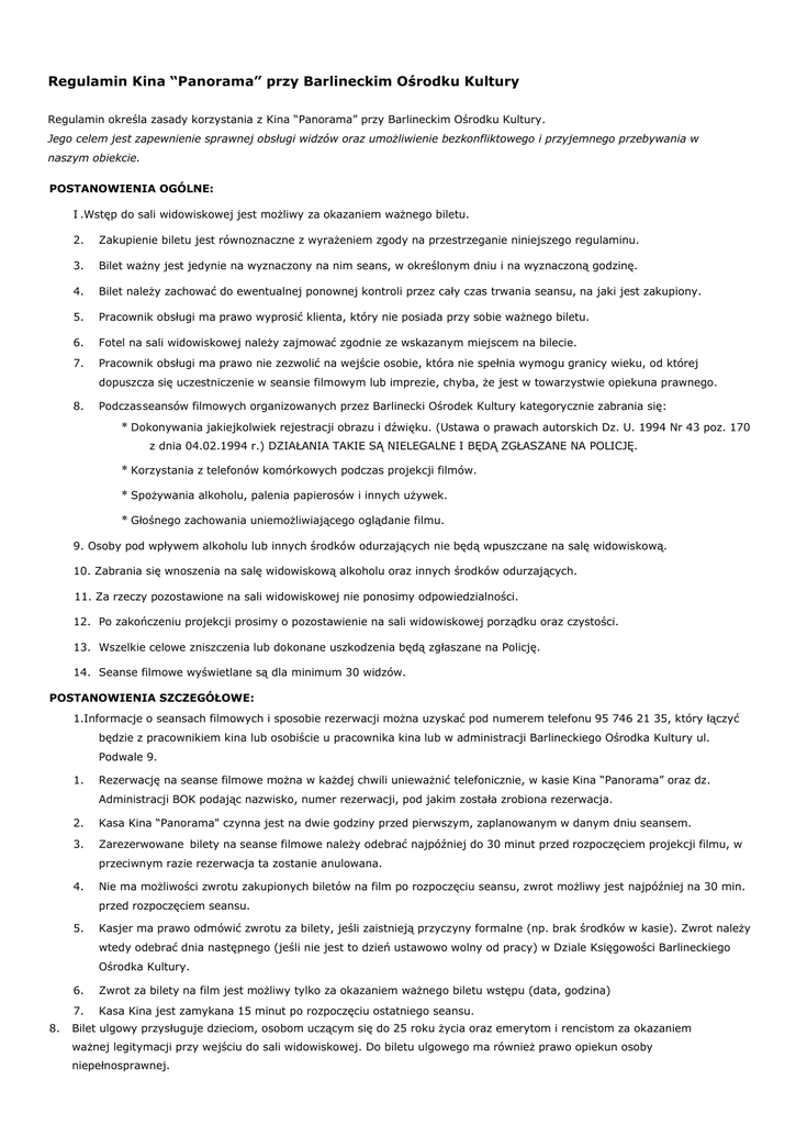 Regulamin Kina “Panorama” przy Barlineckim Ośrodku Kultury Regulamin określa zasady korzystania z Kina “Panorama” przy Barlineckim Ośrodku Kultury. Jego celem jest zapewnienie sprawnej obsługi widzów oraz umożliwienie bezkonfliktowego i przyjemnego przebywania w naszym obiekcie. POSTANOWIENIA OGÓLNE: I .Wstęp do sali widowiskowej jest możliwy za okazaniem ważnego biletu. 2. Zakupienie biletu jest równoznaczne z wyrażeniem zgody na przestrzeganie niniejszego regulaminu. 3. Bilet ważny jest jedynie na wyznaczony na nim seans, w określonym dniu i na wyznaczoną godzinę. 4. Bilet należy zachować do ewentualnej ponownej kontroli przez cały czas trwania seansu, na jaki jest zakupiony. 5. Pracownik obsługi ma prawo wyprosić klienta, który nie posiada przy sobie ważnego biletu. 6. Fotel na sali widowiskowej należy zajmować zgodnie ze wskazanym miejscem na bilecie. 7. Pracownik obsługi ma prawo nie zezwolić na wejście osobie, która nie spełnia wymogu granicy wieku, od której dopuszcza się uczestniczenie w seansie filmowym lub imprezie, chyba, że jest w towarzystwie opiekuna prawnego. 8. Podczas seansów filmowych organizowanych przez Barlinecki Ośrodek Kultury kategorycznie zabrania się: * Dokonywania jakiejkolwiek rejestracji obrazu i dźwięku. (Ustawa o prawach autorskich Dz. U. 1994 Nr 43 poz. 170 z dnia 04.02.1994 r.) DZIAŁANIA TAKIE SĄ NIELEGALNE I BĘDĄ ZGŁASZANE NA POLICJĘ. * Korzystania z telefonów komórkowych podczas projekcji filmów. * Spożywania alkoholu, palenia papierosów i innych używek. * Głośnego zachowania uniemożliwiającego oglądanie filmu. 9. Osoby pod wpływem alkoholu lub innych środków odurzających nie będą wpuszczane na salę widowiskową. 10. Zabrania się wnoszenia na salę widowiskową alkoholu oraz innych środków odurzających. 11. Za rzeczy pozostawione na sali widowiskowej nie ponosimy odpowiedzialności. 12. Po zakończeniu projekcji prosimy o pozostawienie na sali widowiskowej porządku oraz czystości. 13. Wszelkie celowe zniszczenia lub dokonane uszkodzenia będą zgłaszane na Policję. 14. Seanse filmowe wyświetlane są dla minimum 30 widzów. POSTANOWIENIA SZCZEGÓŁOWE: 1.Informacje o seansach filmowych i sposobie rezerwacji można uzyskać pod numerem telefonu 95 746 21 35, który łączyć będzie z pracownikiem kina lub osobiście u pracownika kina lub w administracji Barlineckiego Ośrodka Kultury ul. Podwale 9. 1. Rezerwację na seanse filmowe można w każdej chwili unieważnić telefonicznie, w kasie Kina “Panorama” oraz dz. Administracji BOK podając nazwisko, numer rezerwacji, pod jakim została zrobiona rezerwacja. 2. Kasa Kina “Panorama" czynna jest na dwie godziny przed pierwszym, zaplanowanym w danym dniu seansem. 3. Zarezerwowane bilety na seanse filmowe należy odebrać najpóźniej do 30 minut przed rozpoczęciem projekcji filmu, w przeciwnym razie rezerwacja ta zostanie anulowana. 4. Nie ma możliwości zwrotu zakupionych biletów na film po rozpoczęciu seansu, zwrot możliwy jest najpóźniej na 30 min. przed rozpoczęciem seansu. 5. Kasjer ma prawo odmówić zwrotu za bilety, jeśli zaistnieją przyczyny formalne (np. brak środków w kasie). Zwrot należy wtedy odebrać dnia następnego (jeśli nie jest to dzień ustawowo wolny od pracy) w Dziale Księgowości Barlineckiego Ośrodka Kultury. 8. 6. Zwrot za bilety na film jest możliwy tylko za okazaniem ważnego biletu wstępu (data, godzina) 7. Kasa Kina jest zamykana 15 minut po rozpoczęciu ostatniego seansu. Bilet ulgowy przysługuje dzieciom, osobom uczącym się do 25 roku życia oraz emerytom i rencistom za okazaniem ważnej legitymacji przy wejściu do sali widowiskowej. Do biletu ulgowego ma również prawo opiekun osoby niepełnosprawnej. 11 Legitymacje emeryta-rencisty /plus dokument ze zdjęciem/ studenckie, uczniowskie, sprawdzone są wraz z biletami przy wejściu na salę. 12. Kasjer może odmówić sprzedaży biletu wstępu w następujących, szczególnych przypadkach: * Wykonanie usługi nie jest możliwe, pomimo wcześniejszej deklaracji repertuarowej, poprzez brak wszystkich koniecznych elementów do jej wykonania spowodowanych niewłaściwym działaniem KONTRAHENTÓW, * W przypadku, gdy KLIENT jest w stanie nietrzeźwym, pod wpływem środków odurzających, posiada przy sobie przedmioty niebezpieczne lub swoim zachowaniem zagraża bezpieczeństwu pozostałych KLIENTÓW. * Bilety na seanse filmowe przeznaczone dla określonych kategorii wiekowych mogą nabyć osoby spełniające wymagania związane z wiekiem po okazaniu odpowiedniego dokumentu tożsamości. * Osobie, która nie spełnia wymogu granicy wieku, od której dopuszcza się uczestniczenie w seansie filmowym lub imprezie, chyba, że jest w towarzystwie opiekuna prawnego. * Wystąpienia sił i zdarzeń losowych niezależnych od woli BARLINECKIEGO OŚRODKA KULTURY. 13. Kasjer ma prawo odmówić przyjęcia zwrotu wykupionych biletów wstępu oraz dokonania wypłaty kwoty należnej, na zasadach określonych w Postanowieniach Szczegółowych za niewykorzystane bilety w następujących przypadkach: * KLIENT chce zwrócić bilet po rozpoczęciu seansu filmowego lub imprezy z powodów nie leżących po stronie BARLINECKIEGO OŚRODKA KULTURY. * KLIENT chce zwrócić bilet po częściowym udziale w seansie filmowym lub w imprezie z przyczyn nie leżących po stronie BARLINECKIEGO OŚRODKA KULTURY. * KLIENT chce dokonać zwrotu biletów zbiorowych później niż 24 h przed imprezą, na którą bilet zbiorowy został sprzedany. 14. Podczas projekcji w systemie 3D, należy obowiązkowo nałożyć okulary zgodne z systemem Dolby Digital 3D 15. Okulary są własnością Barlineckiego Ośrodka Kultury i zgodne z wymaganymi parametrami do seansów w systemie 3D na sali kinowej w BOK. 16.Okulary dostępne będą u dyżurnego pracownika BOK po wniesieniu bezzwrotnej opłaty za wypożyczenie w wysokości 2zł 17. Wniesienie ww. opłaty za wypożyczenie okular