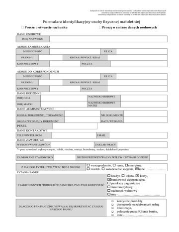 Załącznik nr 1b do instrukcji otwierania i prowadzenia rachunków bankowych dla osób fizycznych zmieniony załącznikiem do uchwały nr 29/BS/2013 Zarządu BS z dnia 10.04.2013r. zmieniony załącznikiem nr 10 do uchwały nr 6/BS/2015 Zarządu BS z dnia 28.01.2015r. Formularz identyfikacyjny osoby fizycznej małoletniej Proszę o otwarcie rachunku Proszę o zmianę danych osobowych DANE OSOBOWE IMIĘ NAZWISKO ADRES ZAMIESZKANIA MIEJSCOWOŚĆ NR DOMU ULICA GMINA/ POWIAT / KRAJ KOD POCZTOWY POCZTA ADRES DO KORESPONDENCJI MIEJSCOWOŚĆ NR DOMU ULICA GMINA/ POWIAT / KRAJ KOD POCZTOWY POCZTA DANE RODZINNE IMIĘ OJCA NAZWISKO RODOWE IMIĘ MATKI NAZWISKO RODOWE MATKI DANE ADMINISTRACYJNE RODZAJ DOKUMENTU TOŻSAMOŚCI NR DOKUMENTU ORGAN WYDAJĄCY DOKUMENT DATA WYDANIA PESEL DANE KONTAKOTWE TELEFON/TEL KOM EMAIL DANE ZAWODOWE WYKONYWANY ZAWÓD* ZAKŁAD PRACY *- poza zawodami wykonywanymi, rolnik, rencista, emeryt, bezrobotny, student, działalność prywatna ZAJMOWANE STANOWISKO ŚREDNI PRZEWIDYWALNY WPŁYW / WYNAGRODZENIE Z JAKIEGO TYTUŁU WPŁYWAC BĘDĄ ŚRODKI wynagrodzenie, renta, emerytura, zasiłek, świadczenie socjalne, inne ………………. PYTANIA BANKU Z JAKICH INNYCH PRODUKTÓW ZAMIERZA PAN /PANI KORZYSTAĆ kredyt, lokata, karty, bankowość elektroniczna, przekazy zagraniczne limit kredytowy rachunek walutowy inny -……………………………….. DLACZEGO PAN/PANI ZDECYDWAŁ(A) SIĘ SKORZYSTAĆ Z USŁUG NASZEGO BANKU korzystne produkty, dostępność oczekiwanych usług lokalizacja, polecenie przez Klienta banku, inne -………………….… Formularz identyfikacyjny osoby fizycznej(przedstawiciel ustawowy) DANE OSOBOWE IMIĘ NAZWISKO ADRES ZAMIESZKANIA MIEJSCOWOŚĆ NR DOMU ULICA GMINA/ POWIAT / KRAJ KOD POCZTOWY POCZTA ADRES DO KORESPONDENCJI MIEJSCOWOŚĆ NR DOMU ULICA GMINA/ POWIAT / KRAJ KOD POCZTOWY POCZTA DANE RODZINNE IMIĘ OJCA NAZWISKO RODOWE IMIĘ MATKI NAZWISKO RODOWE MATKI DANE ADMINISTRACYJNE RODZAJ DOKUMENTU TOŻSAMOŚCI NR DOKUMENTU ORGAN WYDAJĄCY DOKUMENT DATA WYDANIA PESEL DANE KONTAKOTWE TELEFON/TEL KOM EMAIL DANE ZAWODOWE WYKONYWANY ZAWÓD* PRACOWNIK ZAKŁAD PRACY *- poza zawodami wykonywanymi, rolnik, rencista, emeryt, bezrobotny, student, działalność prywatna ZAJMOWANE STANOWISKO ŚREDNI PRZEWIDYWALNY WPŁYW / WYNAGRODZENIE Z JAKIEGO TYTUŁU WPŁYWAC BĘDĄ ŚRODKI wynagrodzenie, renta, emerytura, zasiłek, świadczenie socjalne, inne ………………. PYTANIA BANKU Z JAKICH INNYCH PRODUKTÓW ZAMIERZA PAN /PANI KORZYSTAĆ kredyt, lokata, karty, bankowość elektroniczna, przekazy zagraniczne limit kredytowy rachunek walutowy inny -……………………………….. DLACZEGO PAN/PANI ZDECYDWAŁ(A) SIĘ SKORZYSTAĆ Z USŁUG NASZEGO BANKU korzystne produkty, dostępność oczekiwanych usług lokalizacja, polecenie przez Klienta banku, inne -………………….… Wnioskujemy o: Otwarcie rachunku oszczędnościowo – rozliczeniowego i zawarcie umowy o Pakiet młodzieżowy Wyciągi prosimy: drukować na koniec miesiąca do odbioru w placówce Banku nie drukować Internetowy dostęp do rachunku - nadanie identyfikatorów, wydanie haseł dostępu do usługi Internet Banking dla n/w użytkowników Imię i nazwisko l.p. 1. 2. o następujących uprawnieniach 1. 2. 3. 4. 5. 6. Definiowanie przelewów zdefiniowanych Podgląd salda i operacji na rachunku Przelewy oczekujące Realizacja przelewów Realizacja przelewów zdefiniowanych Zlecenia okresowe Hasła papierowe Hasła SMS-owe Limity kwotowe przelewów: (w przypadku braku limitów wpisać „0”) a) dzienny limit kwoty przelewów 0,00 b) jednorazowy limit kwoty przelewu 0,00 wydanie karty lokalnej wydanie karty Visa Classic Debetowa i ustalenie następujących dziennych limitów transakcyjnych: Visa Classic Debetowa Visa payWave 1) Imię i nazwisko do umieszczenia na karcie (max 21 znaków): Dzienny limit transakcji gotówkowych Dzienny limit transakcji bezgotówkowych Dzienny limit transakcji internetowych złotych złotych, w tym złotych 2) Imię i nazwisko do umieszczenia na karcie (max 21 znaków): Dzienny limit transakcji gotówkowych Dzienny limit transakcji bezgotówkowych Dzienny limit transakcji internetowych złotych złotych, w tym złotych udostępnienie do rachunku usługi SMS Banking – numer telefonu komórkowego SMS wysyłać : 1) po każdej operacji, 2) po operacji Winien 3) po operacji Ma 4) codziennie o godzinie ………………., 5) w odpowiedzi na otrzymany SMS z zapytaniem od klienta Otwarcie rachunku oszczędnościowego 2. 3. Otwarcie rachunku terminowej lokaty oszczędnościowej 4. Otwarcie rachunku oszczędnościowo-rozliczeniowego 5. Oświadczam, że wyrażam zgodę nie wyrażam zgody, na: - przetwarzanie moich danych osobowych przez Bank w celu marketingu produktów własnych Banku; - na przesyłanie informacji handlowej za pomocą środków komunikacji elektronicznej w rozumieniu ustawy o świadczeniu usług drogą elektroniczną z dnia 18 lipca 2002 r. (Dz. U. z 2002 r., Nr 144, poz. 1204 z późn. zm.)w tym celu wskazuje adres poczty elektronicznej. Mińsk Mazowiecki, …………………………………………. Numer rachunku: PODPIS WNIOSKODAWCY STANOWIĄCY WZÓR PODPISU Imię i nazwisko: PODPIS PRZEDSTAWICIELA USTAWOWEGO STANOWIĄCY WZÓR PODPISU Imię i nazwisko: Podpis: Podpis: PODPIS PEŁNOMOCNIKA STANOWIĄCY WZÓR PODPISU Imię i nazwisko: Imię i nazwisko: Podpis: Podpis: PODPIS UŻYTKOWNIKA KARTY Imię i nazwisko: Imię i nazwisko: Podpis: Podpis: Data przyjęcia wniosku stempel dzienny i podpis pracownika przyjmującego wniosek Weryfikacja WYPEŁNIA PRACOWNIK BANKU Inny dokument: ze zdjęciem - Prawo jazdy (seria numer) Rejestr ubezpieczyciela społecznego Rachunek telefoniczny inne (Internet, wiedza) ……………………………………….. …………………………………………. Miejscowość i data P odpis pracownika weryfikującego Opinia pracownika: Proponuję przyznać wszystkie wnioskowane usługi o parametrach okre