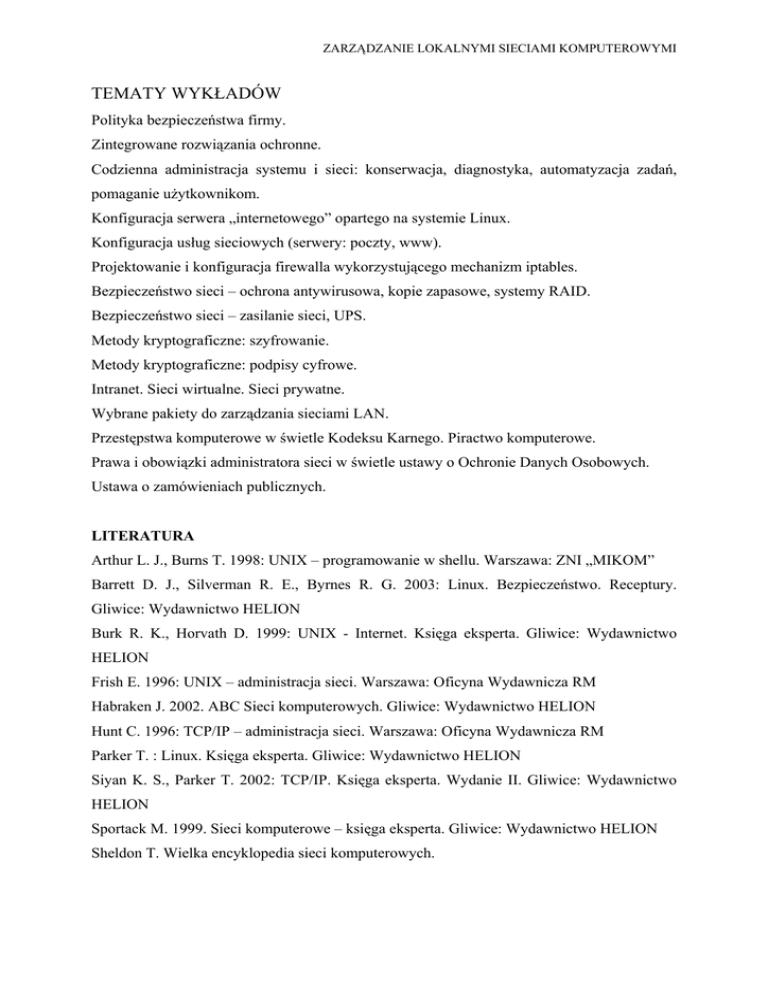 ZARZĄDZANIE LOKALNYMI SIECIAMI KOMPUTEROWYMI TEMATY WYKŁADÓW Polityka bezpieczeństwa firmy. Zintegrowane rozwiązania ochronne. Codzienna administracja systemu i sieci: konserwacja, diagnostyka, automatyzacja zadań, pomaganie użytkownikom. Konfiguracja serwera „internetowego” opartego na systemie Linux. Konfiguracja usług sieciowych (serwery: poczty, www). Projektowanie i konfiguracja firewalla wykorzystującego mechanizm iptables. Bezpieczeństwo sieci – ochrona antywirusowa, kopie zapasowe, systemy RAID. Bezpieczeństwo sieci – zasilanie sieci, UPS. Metody kryptograficzne: szyfrowanie. Metody kryptograficzne: podpisy cyfrowe. Intranet. Sieci wirtualne. Sieci prywatne. Wybrane pakiety do zarządzania sieciami LAN. Przestępstwa komputerowe w świetle Kodeksu Karnego. Piractwo komputerowe. Prawa i obowiązki administratora sieci w świetle ustawy o Ochronie Danych Osobowych. Ustawa o zamówieniach publicznych. LITERATURA Arthur L. J., Burns T. 1998: UNIX – programowanie w shellu. Warszawa: ZNI „MIKOM” Barrett D. J., Silverman R. E., Byrnes R. G. 2003: Linux. Bezpieczeństwo. Receptury. Gliwice: Wydawnictwo HELION Burk R. K., Horvath D. 1999: UNIX - Internet. Księga eksperta. Gliwice: Wydawnictwo HELION Frish E. 1996: UNIX – administracja sieci. Warszawa: Oficyna Wydawnicza RM Habraken J. 2002. ABC Sieci komputerowych. Gliwice: Wydawnictwo HELION Hunt C. 1996: TCP/IP – administracja sieci. Warszawa: Oficyna Wydawnicza RM Parker T. : Linux. Księga eksperta. Gliwice: Wydawnictwo HELION Siyan K. S., Parker T. 2002: TCP/IP. Księga eksperta. Wydanie II. Gliwice: Wydawnictwo HELION Sportack M. 1999. Sieci komputerowe – księga eksperta. Gliwice: Wydawnictwo HELION Sheldon T. Wielka encyklopedia sieci komputerowych.