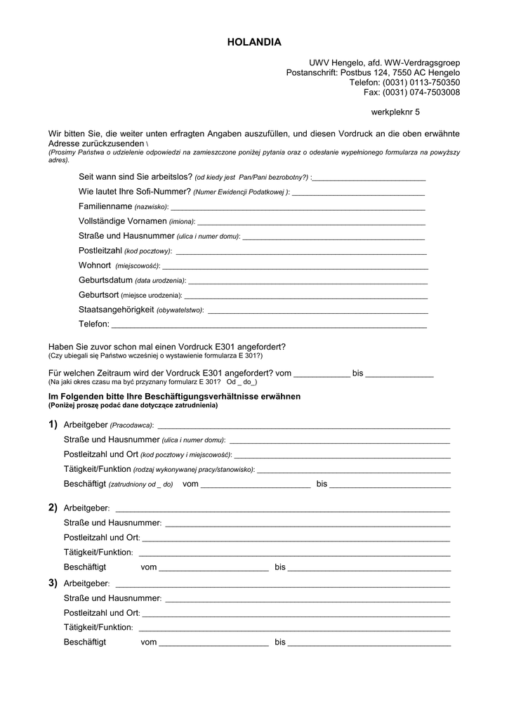 HOLANDIA UWV Hengelo, afd. WW-Verdragsgroep Postanschrift: Postbus 124, 7550 AC Hengelo Telefon: (0031) 0113-750350 Fax: (0031) 074-7503008 werkpleknr 5 Wir bitten Sie, die weiter unten erfragten Angaben auszufüllen, und diesen Vordruck an die oben erwähnte Adresse zurückzusenden \ (Prosimy Państwa o udzielenie odpowiedzi na zamieszczone poniżej pytania oraz o odesłanie wypełnionego formularza na powyższy adres). Seit wann sind Sie arbeitslos? (od kiedy jest Pan/Pani bezrobotny?) :______________________________ Wie lautet Ihre Sofi-Nummer? (Numer Ewidencji Podatkowej ): ___________________________________ Familienname (nazwisko): ___________________________________________________________________ Vollständige Vornamen (imiona): ____________________________________________________________ Straße und Hausnummer (ulica i numer domu): ________________________________________________ Postleitzahl (kod pocztowy): __________________________________________________________________ Wohnort (miejscowość): ______________________________________________________________________ Geburtsdatum (data urodzenia): _______________________________________________________________ Geburtsort (miejsce urodzenia): ________________________________________________________________ Staatsangehörigkeit (obywatelstwo): __________________________________________________________ Telefon: ___________________________________________________________________________________ Haben Sie zuvor schon mal einen Vordruck E301 angefordert? (Czy ubiegali się Państwo wcześniej o wystawienie formularza E 301?) Für welchen Zeitraum wird der Vordruck E301 angefordert? vom _______________ bis __________________ (Na jaki okres czasu ma być przyznany formularz E 301? Od _ do_) Im Folgenden bitte Ihre Beschäftigungsverhältnisse erwähnen (Poniżej proszę podać dane dotyczące zatrudnienia) 1) Arbeitgeber (Pracodawca): _____________________________________________________________________________ Straße und Hausnummer (ulica i numer domu): __________________________________________________________ Postleitzahl und Ort (kod pocztowy i miejscowość): _________________________________________________________ Tätigkeit/Funktion (rodzaj wykonywanej pracy/stanowisko): ___________________________________________________ Beschäftigt (zatrudniony od _ do) 2) Arbeitgeber: vom _____________________________ bis ________________________________ ________________________________________________________________________________________ Straße und Hausnummer: ___________________________________________________________________________ Postleitzahl und Ort: _________________________________________________________________________________ Tätigkeit/Funktion: __________________________________________________________________________________ Beschäftigt 3) Arbeitgeber: vom _____________________________ bis ___________________________________________ ________________________________________________________________________________________ Straße und Hausnummer: ___________________________________________________________________________ Postleitzahl und Ort: _________________________________________________________________________________ Tätigkeit/Funktion: __________________________________________________________________________________ Beschäftigt vom _____________________________ bis ___________________________________________ 4) Arbeitgeber: ________________________________________________________________________________________ Straße und Hausnummer: ___________________________________________________________________________ Postleitzahl und Ort: _________________________________________________________________________________ Tätigkeit/Funktion: __________________________________________________________________________________ Beschäftigt 5) Arbeitgeber: vom _____________________________ bis ___________________________________________ ________________________________________________________________________________________ Straße und Hausnummer: ___________________________________________________________________________ Postleitzahl und Ort: _________________________________________________________________________________ Tätigkeit/Funktion: __________________________________________________________________________________ Beschäftigt 6) Arbeitgeber: vom _____________________________ bis ___________________________________________ ________________________________________________________________________________________ Straße und Hausnummer: ___________________________________________________________________________ Postleitzahl und Ort: _________________________________________________________________________________ Tätigkeit/Funktion: __________________________________________________________________________________ Beschäftigt 7) Arbeitgeber: vom _____________________________ bis ___________________________________________ ________________________________________________________________________________________ Straße und Hausnummer: ___________________________________________________________________________ Postleitzahl und Ort: _________________________________________________________________________________ Tätigkeit/Funktion: __________________________________________________________________________________ Beschäftigt 8) Arbeitgeber: vom _____________________________ bis ___________________________________________ ________________________________________________________________________________________ Straße und Hausnummer: ___________________________________________________________________________ Postleitzahl und Ort: _________________________________________________________________________________ Tätigkeit/Funktion: __________________________________________________________________________________ Beschäftigt vom _____________________________ bis ___________________________________________ Datum (data): 