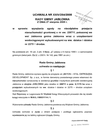 UCHWALA NR XXIVl25412008 RADY GMlNY JABLONNA Z DNlA 27 sierpnia 2008 r. w sprawie: wyraienia zgody na nieodplatne przejqcie nieruchomoSci gruntowej o nr ew. 226711, potozonej we wsi Jabtonna gmina Jabtonna wraz z urzqdzeniami wodociqgowymi wybudowanymi na ww. dziatce i dziatce nr 2275 - drodze. Na podstawie art. 18 ust. 2 pkt. 9 litera ,,anustawy z 8 marca 1990 r. o samorzqdzie gminnym (tekst jedn. Dz.U. z 2001r. Nr 142, poz.1591 ze zm.) Rada Gminy Jabl-onna uchwala co nastqpuje: §1 Rada Gminy Jablonna wyraza zgodq na przyjqcie od ,,BETON - STAL OSTROLKKA DEVELOPMENT Sp. z o.o., w formie darowizny posiadanego prawa wlasnosci do nieruchomoSci oznaczonej w ewidencji gruntow i budynkow jednostki ewidencyjnej Jablonna w obrqbie JABLONNA jako dzialka nr 226711 o pow. 0,1175 ha wraz z przejeciem wybudowanych na ww. dzialce i dzialce nr 2275 - drodze urzqdzen wodociqgowych. Sqd Rejonowy w Legionowie IV Wydzial Ksiqg Wieczystych prowadzi dla tej dzialki ksiqgi wieczyste nr WAIL 100031114 11. §2 Wykonanie uchwaly Rada Gminy Jablonna powierza siq Wojtowi Gminy Jablonna. §3 Uchwala wchodzi w zycie z dniem podjqcia i podlega ogloszeniu poprzez wywieszenie jej na tablicy ogloszen Urzqdu Gminy. przewodniczqca Rady Uzasadnienie do Uchwaly Nr XXIVl25412008 Rady Gminy Jabtonna z dnia 27 sierpnia 2008r. Zarzqd ,,BETON - STAL OSTROLEKA DEVELOPMENT Sp. z 0.0. po negocjacjach z Wojtem, zaproponowal Gminie nieodplatne przejqcie posiadanego prawa wlasnoSci do nieruchomoSci oznaczonej w ewidencji gruntow i budynkow jednostki ewidencyjnej Jablonna w obrqbie JABtONNA jako dzialka nr 226711 o pow. 0,1175 ha. Propozycja ,,BETON - STAL OSTROLEKA DEVELOPMENT Sp. z 0.0 dotyczyla takie przejqcia urzqdzeri wodociqgowych zlokalizowanych na dziaikach nr 226711, nr 2275 . Sqd Rejonowy w Legionowie IV Wydzial Ksiqg Wieczystych prowadzi dla przedmiotowej nieruchomoSci ksiegq wieczystq nr WA1LI 0003111411. Zgodnie z operatem ewidencji gruntow i budynkow jednostki ewidencyjnej Jablonna obrqb Chotomow przedmiot darowizny stanowi wlasnoS6 wnioskujqcego. Przedmiotowq nieruchomoS6 oznaczono kolorem zoltym na zalqczniku graficznym. odniczqca Rady MAPA SYTUAC 1 dkbna I z projektowanym podzia Zestawienie przebiegu glosowania jawnego imiennego nad uchwalq w sprawie: wyraienia zgody na nieodplatne przejecie nieruchomoBci gruntowej o nr ew. 2267/1, pokoionej we wsi Jabkonna Gmina Jabfonna wraz z urzqdzeniami wodociqgowyrni wybudowanymi na w / w dzialce i dzialce nr 2275-drodze, Uchwala Nr XXIVI 25412008 1 Zestawi nie sporzqdzila: