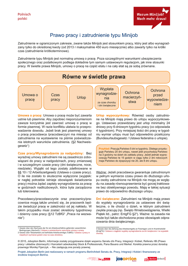 Warum Minijob? Mach mehr draus! Polnisch polski Prawo pracy i zatrudnienie typu Minijob Zatrudnienie w ograniczonym zakresie, zwane także Minijob jest stosunkiem pracy, który jest albo wynagradzany tylko do określonej kwoty (od 2013 r maksymalnie 450 euro miesięcznie) albo zawarty tylko na krótki czas (zatrudnienie krótkoterminowe). Zatrudnienie typu Minijob jest normalną umową o pracę. Poza szczególnymi warunkami ubezpieczenia społecznego oraz podatkowymi podlega dokładnie tym samym ustawowym regulacjom, jak inne stosunki pracy. W świetle prawa Minijob, umowy o pracę na część etatu i na cały etat są ze sobą zrównane. Równe w świetle prawa Umowa o pracę Czas pracy Urlop Umowa o pracę: Umowa o pracę może być zawarta ustnie lub pisemnie. Aby zapobiec nieporozumieniom zawsze korzystnie jest zawrzeć umowę o pracę w formie pisemnej. W razie konfliktu ułatwia to przeprowadzenie dowodu. Jeżeli brak jest pisemnej umowy o pracę pracodawca /pracodawczyni ma miesiąc od zatrudnienia na wystawienie na piśmie poświadczenia istotnych warunków zatrudnienia. (§2 Nachweisgesetz1) Czas pracy/Wynagrodzenie za nadgodziny: Bez wyraźnej umowy zatrudnieni nie są zasadniczo zobowiązani do pracy w nadgodzinach, pracy zmianowej i w szczególnym czasie pracy (dni świąteczne, noce, niedziele). Wyjątki od tego zostały zdefiniowane w §§ 10 i 12 Arbeitszeitgesetz (Ustawa o czasie pracy). O ile nie zostało to skutecznie wyłączone (wyjątek: w nagłej potrzebie istnieje obowiązek świadczenia pracy) można żądać zapłaty wynagrodzenia za pracę w godzinach nadliczbowych, która była zarządzona lub tolerowana. Wypłata wynagrodzenia za czas choroby i dni świąteczne Ochrona macierzyństwa Ochrona przed wypowiedzeniem Urlop wypoczynkowy: Również osoby zatrudnione na Minijob mają prawo do urlopu wypoczynkowego. Ustawowo przewidziany jest urlop minimalny 24 dniowy przy 6-dniowym tygodniu pracy (co odpowiada 4 tygodniom). Przy mniejszej ilości dni pracy w tygodniu wymiar urlopu musi być odpowiednio przeliczony (Bundesurlaubsgesetz / Ustawa federalna o urlopie). Przykład: Pracują Państwo 5 dni w tygodniu. Dlatego przysługuje Państwu 20 dni urlopu, nawet jeśli przychodzą Państwo na 3 godziny na dzień do zakładu pracy. Jeżeli jednak wypracowują Państwo te 15 godzin w ciągu tylko 2 dni roboczych maja Państwo do dyspozycji nie 20, ale 8 dni urlopu. Ważne: Jeżeli pracodawca gwarantuje zatrudnionym w pełnym wymiarze czasu prawo do dłuższego urlopu osoby zatrudnione na Minijob nie mogą ze względu na zasadę równouprawnienia być gorzej traktowane bez obiektywnego powodu. Mają w takiej sytuacji prawo do odpowiednio dłuższego urlopu. Pracodawcy/pracodawczynie oraz pracownicy/pracownice mogą także umówić się, że pracownik będzie świadczył pracę w zależności od jej nakładu. W takim przypadku musi zostać określony tygodniowy i dzienny czas pracy (§12 TzBfG2 „Praca na wezwanie“) Dni świąteczne: Zatrudnieni na Minijob mają prawo do wypłaty wynagrodzenia za ustawowe dni świąteczne, o ile chodzi o dzień, w którym zatrudnieni zwykle pracują (np. Święto Wniebowstąpienia, Wielki Piątek itd., patrz: EntgFG §23). Ważne: ta zasada nie może być także obchodzona przez obowiązek odpracowania dnia świątecznego. 1 Gesetz über den Nachweis der für ein Arbeitsverhältnis geltenden wesentlichen Bedingungen (NachwG) / Ustawa o potwierdzeniu warunków umowy o pracę 2 Gesetz über Teilzeitarbeit und befristete Arbeitsverträge (TzBfG) / Ustawa o pracy w niepełnym wymiarze godzin oraz na czas określony 3 Gesetz über die Zahlung des Arbeitsentgelts an Feiertagen und im Krankheitsfall (EntgFG) / Ustawa o ciągłości wypłaty wynagrodzenia za dni świąteczne i na wypadek choroby © 2015, Joboption Berlin, Informacje zostały przygotowane dzięki wsparciu Senatu d/s Pracy, Integracji i Kobiet, Referatu IIB (Prawo pracy i układów zbiorowych) i Kancelarii adwokackiej Glock & Professionals, Pana Bauera und Merkel. Korekta prawna przez doradcę prawnego Monikę Fijarczyk. – Nie zastępują one porady prawnej. Projekt Joboption Berlin jest realizowany w ramach programu BerlinArbeit Senatu ds. Pracy, Integracji i Kobiet i finansowany ze środków krajowych Berlina. Warum Minijob? Mach mehr draus! Polnisch polski Choroba: Tak jak wszyscy zatrudnieni osoby pracujące na warunkach Minijob mają prawo do wypłaty wynagrodzenia przez pracodawcę przez 6 tygodni kalendarzowych w razie choroby. Ochrona macierzyństwa: Kobiety, które są członkami ustawowej kasy chorych otrzymują zasiłek macierzyński (patrz § 13 MuSchG4). Jeżeli istnieje zakaz wykonywania pracy ze względu na ciążę także kobiety zatrudnione na Minijob otrzymują wynagrodzenie podczas zakazu wykonywania pracy. Ochrona przed wypowiedzeniem: Jeżeli pracownicy zatrudnieni na Minijob nie pracują w małym zakładzie pracy5 (§ 23 Absatz 1 KSchG6) i ich stosunek pracy istnieje dłużej niż 6 miesięcy korzystają oni z ochrony przed wypowiedzeniem zgodnie z KschG. Wypowiedzenie musi być pisemne i zrozumiałe. Dla biegu terminu wypowiedzenia decydujące jest doręczenie oświadczenia osobie zatrudnionej na Minijob. Również osoby zatrudnione na Minijob mogą w ciągu 3 tygodni od doręczenia wypowiedzenia dochodzić przed Sądem Pracy stwierdzenia, że wypowiedzenie jest socjalnie nieusprawiedliwione albo prawnie bezskuteczne z innych powodów. Zasada równouprawnienia: Pracownicy zatrudnieni na Minijob nie mogą być traktowani gorzej niż pracownicy zatrudnieni w pełnym wymiarze czasu na porównywalnych stanowiskach (§ 4 ust. 1 TzBfG „Zakaz dyskryminacji”). Ma to zastosowanie w stosunku pracy do wszystkich działań oraz ustaleń pracodawcy, które zapadają między pracodawcą i osobą zatrudnioną na Minijob. Wyjątek: Istnieje obiektywny powód dla różnego traktowania. 4 Gesetz zum Schutz der erwerbstätigen Mutter (MuSchG) / Ustawa o ochronie kobiet 
