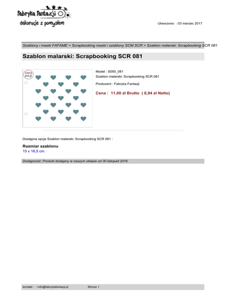 Utworzono : 03 marzec 2017 Szablony i maski FAFAME > Scrapbooking maski i szablony SCM SCR > Szablon malarski: Scrapbooking SCR 081 Szablon malarski: Scrapbooking SCR 081 Model : S050_081 Szablon malarski: Scrapbooking SCR 081 Producent : Fabryka Fantazji Cena : 11,00 zł Brutto ( 8,94 zł Netto) Dostępne opcje Szablon malarski: Scrapbooking SCR 081 : Rozmiar szablonu 15 x 16,5 cm. Dostępność: Produkt dostępny w naszym sklepie od 30 listopad 2016 kontakt : - [email protected] Strona 1