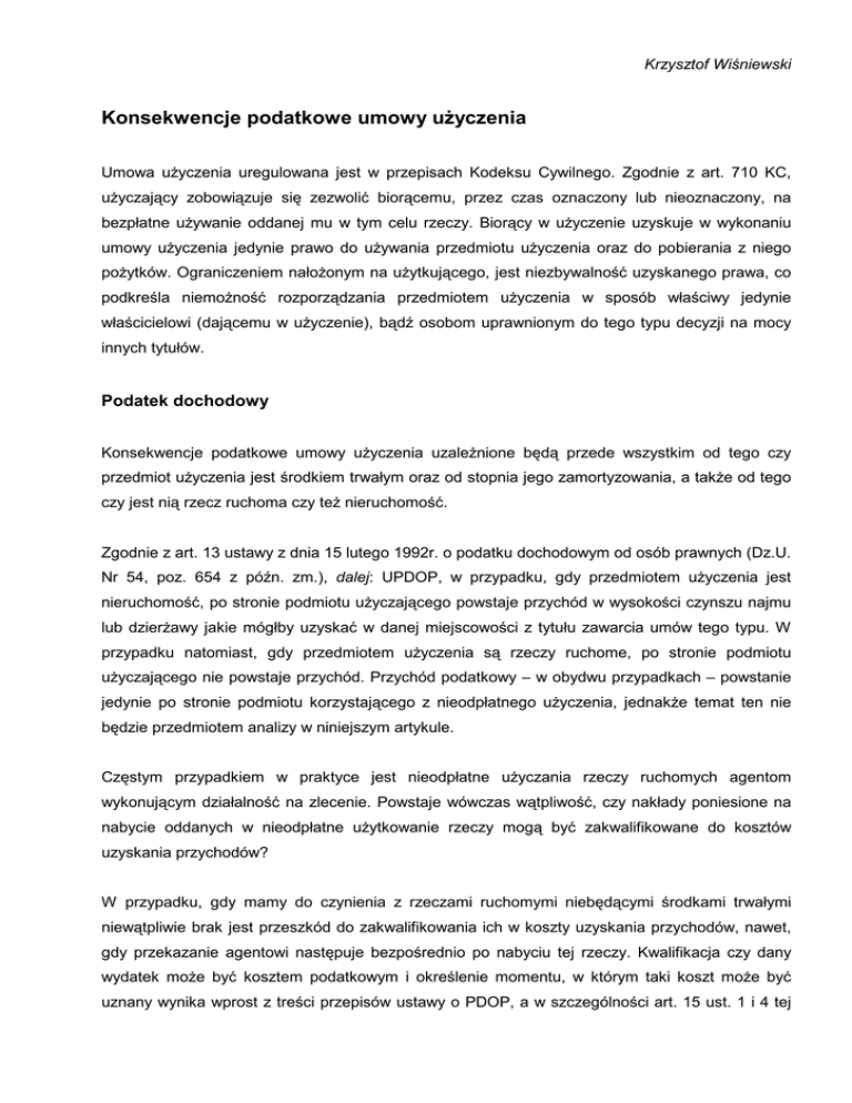Krzysztof Wiśniewski Konsekwencje podatkowe umowy uŜyczenia Umowa uŜyczenia uregulowana jest w przepisach Kodeksu Cywilnego. Zgodnie z art. 710 KC, uŜyczający zobowiązuje się zezwolić biorącemu, przez czas oznaczony lub nieoznaczony, na bezpłatne uŜywanie oddanej mu w tym celu rzeczy. Biorący w uŜyczenie uzyskuje w wykonaniu umowy uŜyczenia jedynie prawo do uŜywania przedmiotu uŜyczenia oraz do pobierania z niego poŜytków. Ograniczeniem nałoŜonym na uŜytkującego, jest niezbywalność uzyskanego prawa, co podkreśla niemoŜność rozporządzania przedmiotem uŜyczenia w sposób właściwy jedynie właścicielowi (dającemu w uŜyczenie), bądź osobom uprawnionym do tego typu decyzji na mocy innych tytułów. Podatek dochodowy Konsekwencje podatkowe umowy uŜyczenia uzaleŜnione będą przede wszystkim od tego czy przedmiot uŜyczenia jest środkiem trwałym oraz od stopnia jego zamortyzowania, a takŜe od tego czy jest nią rzecz ruchoma czy teŜ nieruchomość. Zgodnie z art. 13 ustawy z dnia 15 lutego 1992r. o podatku dochodowym od osób prawnych (Dz.U. Nr 54, poz. 654 z późn. zm.), dalej: UPDOP, w przypadku, gdy przedmiotem uŜyczenia jest nieruchomość, po stronie podmiotu uŜyczającego powstaje przychód w wysokości czynszu najmu lub dzierŜawy jakie mógłby uzyskać w danej miejscowości z tytułu zawarcia umów tego typu. W przypadku natomiast, gdy przedmiotem uŜyczenia są rzeczy ruchome, po stronie podmiotu uŜyczającego nie powstaje przychód. Przychód podatkowy – w obydwu przypadkach – powstanie jedynie po stronie podmiotu korzystającego z nieodpłatnego uŜyczenia, jednakŜe temat ten nie będzie przedmiotem analizy w niniejszym artykule. Częstym przypadkiem w praktyce jest nieodpłatne uŜyczania rzeczy ruchomych agentom wykonującym działalność na zlecenie. Powstaje wówczas wątpliwość, czy nakłady poniesione na nabycie oddanych w nieodpłatne uŜytkowanie rzeczy mogą być zakwalifikowane do kosztów uzyskania przychodów? W przypadku, gdy mamy do czynienia z rzeczami ruchomymi niebędącymi środkami trwałymi niewątpliwie brak jest przeszkód do zakwalifikowania ich w koszty uzyskania przychodów, nawet, gdy przekazanie agentowi następuje bezpośrednio po nabyciu tej rzeczy. Kwalifikacja czy dany wydatek moŜe być kosztem podatkowym i określenie momentu, w którym taki koszt moŜe być uznany wynika wprost z treści przepisów ustawy o PDOP, a w szczególności art. 15 ust. 1 i 4 tej ustawy. Późniejsze uŜyczenie rzeczy bądź jej zbycie nie ma wpływu na podjętą juŜ w okresie wcześniejszym decyzję o kwalifikacji wydatku na jego nabycie jako kosztu uzyskania przychodów. Niewątpliwie oddanie rzeczy ruchomej w nieodpłatne uŜytkowanie nie wpływa takŜe na kwalifikację do kosztów podatkowych odpisów amortyzacyjnych od wartości początkowej tej rzeczy, jeŜeli jest ona środkiem trwałym. Warunkiem zakwalifikowania wydatku do kosztów uzyskania przychodów jest bowiem, w myśl art. 15 ust. 1 ustawy o PDOP istnienie związku między poniesionym wydatkiem a potencjalnym przychodem oraz brak wyłączenia z zakresu kosztów uzyskania przychodów w katalogu wymienionym w art. 16 ust. 1 ustawy o PDOP. Wydatki związane z nabyciem rzeczy ruchomych przeznaczonych do nieodpłatnego uŜyczenia agentom są związane z przychodami podatnika. NaleŜy bowiem pamiętać, iŜ agenci nie są podmiotami zupełnie odrębnymi od podatnika. Działają na jego rzecz, w celu świadczenia usług jego klientom a bezpośrednim skutkiem ich działalności jest zwiększenie przychodów z tytułu usług. Wątpliwości powstają jednak w przypadku, gdy mamy do czynienia z przekazaniem w nieodpłatne uŜytkowanie rzeczy ruchomej będącej środkiem trwałym, który nie został do końca zamortyzowany. Wątpliwości odnoszą się do tego, czy podatnik będzie miał moŜliwość dalszego dokonywania odpisów amortyzacyjnych od wartości początkowej środka trwałego. W takim przypadku, ze strony organów podatkowych moŜe pojawić się zarzut, iŜ podatnik nie ma prawa dokonywania odpisów amortyzacyjnych od wartości początkowej środka trwałego z uwagi na fakt, iŜ przestał środek ten uŜytkować. W myśl bowiem art. 16a ustawy o PDOP warunkiem dokonywania odpisów amortyzacyjnych od wartości początkowej środków trwałych jest ich wykorzystywanie na cele związane z prowadzoną przez podatnika działalnością gospodarczą. Dlatego wydaje się, iŜ bezpieczniejszym – pod kątem ewentualnych sporów z organami podatkowymi – rozwiązaniem jest odpłatne przeniesienie własności nie w pełni zamortyzowanego środka trwałego w drodze umowy sprzedaŜy. Wówczas istnieć będzie moŜliwość ujęcia w kosztach uzyskania przychodów pozostałej – niezamortyzowanej – części wartośći początkowej środka trwałego na mocy art. 16 ust. 1 ustawy o PDOP. Zdaniem autora moŜna jednak znaleźć argumenty za przyjęciem tezy, iŜ podatnik, pomimo oddania środka trwałego w nieodpłatne uŜytkowanie, będzie miał moŜliwość dalszego dokonywania odpisów amortyzacyjnych od wartości początkowej tego aktywu. MoŜliwym jest bowiem zakwalifikowanie przedmiotowych umów, jako elementu prowadzenia działalności gospodarczej, podejmowanej za pośrednictwem podmiotów trzecich nie zaś osobiście. Skoro bowiem agenci działają na rzecz podatnika, w celu świadczenia usług jego klientom a bezpośrednim skutkiem ich działalności jest zwiększenie przychodów z tytułu świadczenia szeroko rozumianych usług, to nakłady poniesione na prawidłowe funkcjonowanie działalności agentów (w 2 tym takŜe nabycia przedmiotu uŜyczenia) bezspornie spełniają przesłanki związku z osiąganym przychodem i winny być uwzględniane w rachunku podatkowym podatnika po stronie kosztów uzyskania przychodu. Odnosi się to równieŜ do dokonywanych odpisów amortyzacyjnych od uŜyczonych składników majątku. Stanowisko takie zajął takŜe Minister