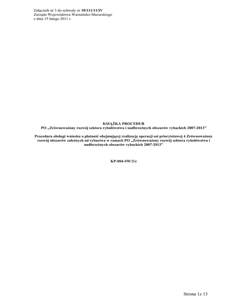 Załącznik nr 3 do uchwały nr 10/111/11/IV Zarządu Województwa Warmińsko-Mazurskiego z dnia 15 lutego 2011 r. KSIĄśKA PROCEDUR PO „ZrównowaŜony rozwój sektora rybołówstwa i nadbrzeŜnych obszarów rybackich 2007-2013” Procedura obsługi wniosku o płatność obejmującej realizację operacji osi priorytetowej 4 ZrównowaŜony rozwój obszarów zaleŜnych od rybactwa w ramach PO „ZrównowaŜony rozwój sektora rybołówstwa i nadbrzeŜnych obszarów rybackich 2007-2013” KP-004-SW/2/z Strona 1z 13 Zatwierdzenie KP Opracowali: Data złoŜenia podpisu: Podpis i pieczęć Data złoŜenia podpisu: Podpis i pieczęć Wydział Obszarów ZaleŜnych Departament Rybołówstwa Zatwierdził: MRiRW Strona 2z 13 Spis treści: 1. Procedury ....................................................................................................................................................................... 4 1.1. Nazwa procedury .................................................................................................................................................... 5 1.1.1. Przedmiot procedury. ...................................................................................................................................... 5 1.1.2. Obszar. ............................................................................................................................................................ 5 1.1.3. Funkcja............................................................................................................................................................ 5 1.1.4. Przebieg procesu ............................................................................................................................................. 5 2. Czynności wykonywane na poszczególnych stanowiskach pracy.................................................................................. 9 3. Załączniki ............................................................................................................. 16Błąd! Nie zdefiniowano zakładki. Strona 3z 13 1. PROCEDURY Strona 4z 13 1. Procedury 1.1. Nazwa procedury Procedura obsługi wniosków o płatność składanych na podstawie umów o dofinansowanie zawieranych w zakresie środka 4.1. „Rozwój obszarów zaleŜnych od rybactwa” oraz środka 4.2. „Wsparcie na rzecz współpracy międzyregionalnej i międzynarodowej” w ramach PO „ZrównowaŜony rozwój sektora rybołówstwa i nadbrzeŜnych obszarów rybackich 2007-2013”. 1.1.1. Przedmiot procedury. Procedura obsługi wniosku o płatność składanego w ramach operacji w zakresie środka 4.1. „Rozwój obszarów zaleŜnych od rybactwa” oraz środka 4.2. „Wsparcie na rzecz współpracy międzyregionalnej i międzynarodowej” w ramach PO „ZrównowaŜony rozwój sektora rybołówstwa i nadbrzeŜnych obszarów rybackich 2007-2013”. Przedmiotowa procedura słuŜy do weryfikacji wniosku o płatność. 1.1.2. Obszar. Obsługa wniosków o płatność w ramach, których będą realizowane następujące operacje: • wzmocnieniu konkurencyjności i utrzymaniu atrakcyjności obszarów zaleŜnych od rybactwa, • restrukturyzacji i reorientacji działalności gospodarczej oraz dywersyfikacji zatrudnienia osób mających pracę związaną z sektorem rybactwa, w drodze tworzenia dodatkowych miejsc pracy poza tym sektorem, • podnoszeniu wartości produktów rybactwa. Rozwoju usług na rzecz społeczności zamieszkującej obszary zaleŜne od rybactwa, • ochronie środowiska i dziedzictwa przyrodniczego na obszarach zaleŜnych od rybactwa w celu utrzymania jego atrakcyjności oraz przywracaniu potencjału produkcyjnego sektora rybactwa, w przypadku jego zniszczenia w wyniku klęski Ŝywiołowej. • funkcjonowanie lokalnej grupy rybackiej (LGR) oraz nabywaniu umiejętności i aktywizacji lokalnych społeczności, • wsparcie na rzecz współpracy międzyregionalnej i międzynarodowej, w ramach którego mogą być realizowane operacje polegające na promowaniu współpracy międzyregionalnej lub międzynarodowej między LGR. 1.1.3. Funkcja Funkcją procedury jest opis trybu postępowania pracowników SW w procesie obsługi wniosków o płatność dla operacji w zakresie środka 4.1. „Rozwój obszarów zaleŜnych od rybactwa” oraz środka 4.2. „Wsparcie na rzecz współpracy międzyregionalnej i międzynarodowej” w ramach PO „ZrównowaŜony rozwój sektora rybołówstwa i nadbrzeŜnych obszarów rybackich 2007-2013”. 1.1.4. Przebieg procesu. Reguły związane z przebiegiem procesu R.1. Zaliczka jest wypłacana beneficjentowi po ustanowieniu i wniesieniu przez niego zabezpieczenia naleŜytego wykonania zobowiązań wynikających z umowy o dofinansowanie. R.2. Formy zabezpieczenia zaliczki określone są w rozporządzeniu Ministra Rozwoju Regionalnego z dnia 18 grudnia 2009 r. w sprawie warunków i trybu udzielania i rozliczania zaliczek oraz zakresu i terminów składania wniosków o płatność w ramach programów finansowanych z udziałem środków europejskich (Dz. U. Nr 223, poz. 1786). Strona 5z 13 R.3. W przypadku, gdy umowa o dofinansowanie przewiduje wypłatę zaliczki w kilku transzach, wypłata drugiej i kolejnych transz jest uzaleŜniona od rozliczenia określonej w umowie o dofinansowanie części dotychczas otrzymanych transz, nie niŜszej jednak niŜ 70% łącznej kwoty przekazanych transz. R.4. W przypadku konieczności poprawy zlecenia płatności naleŜy przejść do procedury Poprawa zlecenia płatności dla środków w ramach PO „ZrównowaŜony rozwój sektora rybołówstwa i nadbrzeŜnych obszarów rybackich 2007-2013” (KP-008-SW/1/z). R.5. W przypadku podejrzenia wystąpienia nieprawidłowości naleŜy posłuŜyć się Instrukcją postępowania w przypadku stwierdzenia, rozpatrywania oraz przekazywania informacji o nieprawidłowościach (I-1) R.6. Zgodnie z KP Departamentu Księgowości ARiMR dla PO 2007-2013 (KP-611-200-ARiMR) najpóź