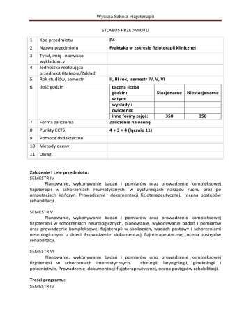 Wyższa Szkoła Fizjoterapii SYLABUS PRZEDMIOTU 1 Kod przedmiotu P4 2 Nazwa przedmiotu Praktyka w zakresie fizjoterapii klinicznej 3 5 Tytuł, imię i nazwisko wykładowcy Jednostka realizująca przedmiot (Katedra/Zakład) Rok studiów, semestr II, III rok, semestr IV, V, VI 6 Ilość godzin 4 7 Forma zaliczenia Łączna liczba godzin: w tym: wykłady : ćwiczenia: inne formy zajęć: Zaliczenie na ocenę 8 Punkty ECTS 4 + 3 + 4 (łącznie 11) 9 Pomoce dydaktyczne Stacjonarne Niestacjonarne 350 350 10 Metody oceny 11 Uwagi Założenie i cele przedmiotu: SEMESTR IV Planowanie, wykonywanie badań i pomiarów oraz prowadzenie kompleksowej fizjoterapii w schorzeniach reumatycznych, w dysfunkcjach narządu ruchu oraz po amputacjach kończyn. Prowadzenie dokumentacji fizjoterapeutycznej, ocena postępów rehabilitacji SEMESTR V Planowanie, wykonywanie badań i pomiarów oraz prowadzenie kompleksowej fizjoterapii w schorzeniach neurologicznych, planowanie, wykonywanie badań i pomiarów oraz prowadzenie kompleksowej fizjoterapii w skoliozach, wadach postawy i schorzeniami neurologicznymi u dzieci. Prowadzenie dokumentacji fizjoterapeutycznej, ocena postępów rehabilitacji. SEMESTR VI Planowanie, wykonywanie badań i pomiarów oraz prowadzenie kompleksowej fizjoterapii w schorzeniach internistycznych, chirurgii, laryngologii, ginekologii i położnictwie. Prowadzenie dokumentacji fizjoterapeutycznej, ocena postępów rehabilitacji. Treści programu: SEMESTR IV Wyższa Szkoła Fizjoterapii Kompleksowa fizjoterapia w schorzeniach reumatycznych- korelacja zabiegów kinezyterapii, fizykoterapii i masażu w rehabilitacji leczniczej. Planowanie procesu usprawniania. Prowadzenie dokumentacji leczniczej. Choroba zwyrodnieniowa stawów kończyn i stawów kręgosłupa, ZZSK, RZS, PHS. Kompleksowa fizjoterapia w dysfunkcjach narządu ruchu- korelacja zabiegów kinezyterapii, fizykoterapii i masażu w rehabilitacji leczniczej. Planowanie procesu usprawniania. Prowadzenie dokumentacji leczniczej; złamania kości, skręcenia i zwichnięcia stawów, uszkodzenia łąkotek, zerwanie więzadeł, ścięgien, przyczepów mięśni. Kompleksowa fizjoterapia po amputacjach kończyn- korelacja zabiegów kinezyterapii, fizykoterapii i masażu w rehabilitacji leczniczej. Planowanie procesu usprawniania. Prowadzenie dokumentacji leczniczej. SEMESTR V Kompleksowa fizjoterapia w schorzeniach neurologicznych- korelacja zabiegów kinezyterapii, fizykoterapii i masażu w rehabilitacji leczniczej. Planowanie procesu usprawniania. Prowadzenie dokumentacji leczniczej; zespoły bólowe, schorzenia i uszkodzenia nerwów obwodowych, ogniskowe uszkodzenie OUN, schorzenia neurologiczne przewlekle postępujące. Kompleksowa fizjoterapia w urazach kręgosłupa i uszkodzeniach rdzenia kręgowego. Kompleksowa fizjoterapia w wadach postawy i skoliozach. Kompleksowa fizjoterapia dzieci z mózgowym porażeniem dziecięcym, zespołem Downa i innymi zespołami. SEMESTR VI Kompleksowa fizjoterapia po zabiegach operacyjnych wad serca u dzieci. Fizjoterapia w zaburzeniach obturacyjnych i restrykcyjnych układu oddechowego u dzieci. Usprawnianie pacjentów po zawale mięśnia sercowego i w chorobie niedokrwiennej serca oraz w nadciśnieniu tętniczym. Fizjoterapia w chorobach naczyń obwodowych. Usprawnianie lecznicze pacjentów z astmą oskrzelową, rozedmą płuc, zapaleniach oskrzeli i płuc oraz w rozstrzeniach oskrzeli. Fizjoterapia w wysiękowym zapaleniu opłucnej. Prowadzenie usprawniania po zabiegach operacyjnych na klatce piersiowej, jamie brzusznej i miednicy małej. Prowadzenie usprawniania po zabiegach w angiochirurgii. Fizjoterapia w chorobach przewodu pokarmowego i laryngologii. Prowadzenie kompleksowej fizjoterapii po zabiegach onkologicznych. Prowadzenie usprawniania w chorobach ginekologicznych i położnictwie. Wykonywanie zabiegów fizjoterapeutycznych u pacjentów w wieku starczym. Literatura: 1) Kinezyterapia. Red. A. Zembaty. T.1-2. Kraków 2003 2) Walaszek R., Kasperczyk T., Magiera L. Diagnostyka w kinezyterapii i masażu. Kraków 2007 3) Rosławski A., Skolimowski T. Badania czynnościowe w kinezyterapii. Wrocław 2000 4) Rosławski A., Skolimowski T. Technika wykonywania ćwiczeń leczniczych. Wyd. 8. Wrocław 2003 5) Szczechowicz J. Pomiary kątowe zakresu ruchu zapisy pomiarów, metoda SFTR. Kraków 2004 6) Franek A., Franek E., Polak A. Nowoczesna elektroterapia. Wybór zagadnień. Katowice 2001 7) Janczak Z. [i in]. Przewodnik do ćwiczeń z fizykoterapii. Cz. 1-2. Warszawa 2001 8) Krioterapia miejscowa i ogólnoustrojowa. Red. Z. Zagrobelny. Wrocław 2003 Wyższa Szkoła Fizjoterapii 9) Krioterapia w medycynie. Red. M. S. Gabryś, A. Popiel. Wrocław 2003 10) Łazowski J. Podstawy fizykoterapii. Wyd. 2. Wrocław 2002 11) Mika T., Kasprzak W. Fizykoterapia. Warszawa 2006 12) Polak A., Chmielewska D., Kozioł P., Rzepka R. Terapia ultradźwiękowa. Gliwice 2002 13) Spodaryk K. Krioterapia. Gliwice 2005 14) Taradaj J. Światłolecznictwo praktyczne. Gliwice 2002 15) Straburzyński G., Straburzyńska- Lupa. Medycyna fizykalna. Warszawa 2005 16) Voner V. Podstawy masażu. Gliwice 2007 17) Walaszek R., Kasperczyk T., Magiera L. Diagnostyka w kinezyterapii i masażu. Kraków 2007 18) Walaszek R., Magiera L. Masaż z elementami odnowy biologicznej. Kraków 2004 19) Fizjoterapia XXI wieku. Red. J. Grossman. Olsztyn 2004 20) Kolster B., Ebelt- Paprotny G. Poradnik fizjoterapeuty. Badanie, techniki, leczenie, rehabilitacja. Wrocław 2001 21) Zembaty A. Zarys podstaw teoretycznych fizjoterapii. Katowice 1995 22) Nowotny J. Podstawy fizjoterapii. T. 1-3. Kraków 2004 23) Kwolek A. Rehabilitacja Medyczna. T 1-2. Warszawa 2003