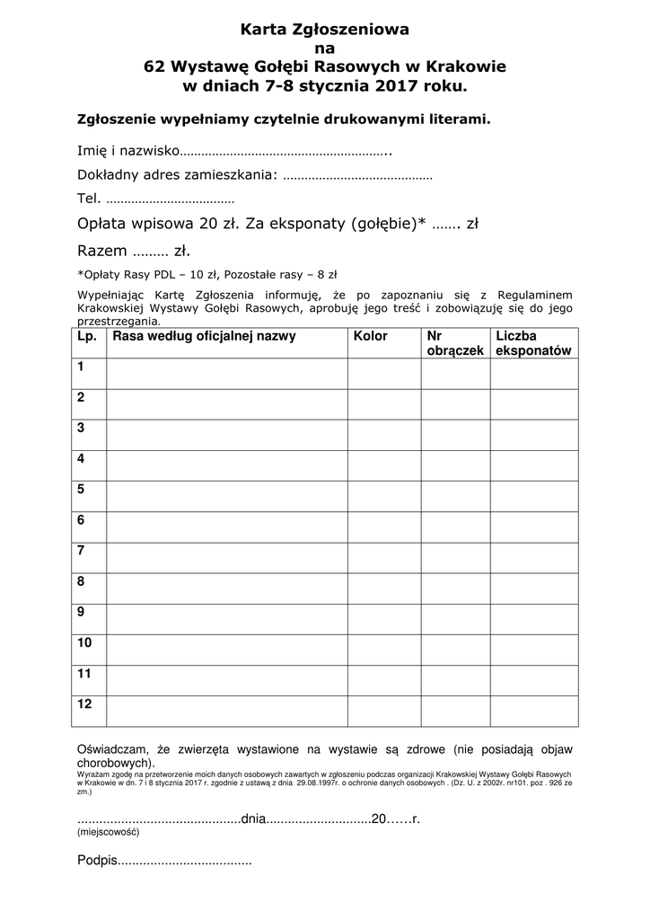 Karta Zgłoszeniowa na 62 Wystawę Gołębi Rasowych w Krakowie w dniach 7-8 stycznia 2017 roku. Zgłoszenie wypełniamy czytelnie drukowanymi literami. Imię i nazwisko………………………………………………….. Dokładny adres zamieszkania: …………………………………… Tel. ……………………………… Opłata wpisowa 20 zł. Za eksponaty (gołębie)* ……. zł Razem ……… zł. *Opłaty Rasy PDL – 10 zł, Pozostałe rasy – 8 zł Wypełniając Kartę Zgłoszenia informuję, że po zapoznaniu się z Regulaminem Krakowskiej Wystawy Gołębi Rasowych, aprobuję jego treść i zobowiązuję się do jego przestrzegania. Lp. Rasa według oficjalnej nazwy Kolor Nr Liczba obrączek eksponatów 1 2 3 4 5 6 7 8 9 10 11 12 Oświadczam, że zwierzęta wystawione na wystawie są zdrowe (nie posiadają objaw chorobowych). Wyrażam zgodę na przetworzenie moich danych osobowych zawartych w zgłoszeniu podczas organizacji Krakowskiej Wystawy Gołębi Rasowych w Krakowie w dn. 7 i 8 stycznia 2017 r. zgodnie z ustawą z dnia 29.08.1997r. o ochronie danych osobowych . (Dz. U. z 2002r. nr101. poz . 926 ze zm.) .............................................dnia.............................20……r. (miejscowość) Podpis.....................................