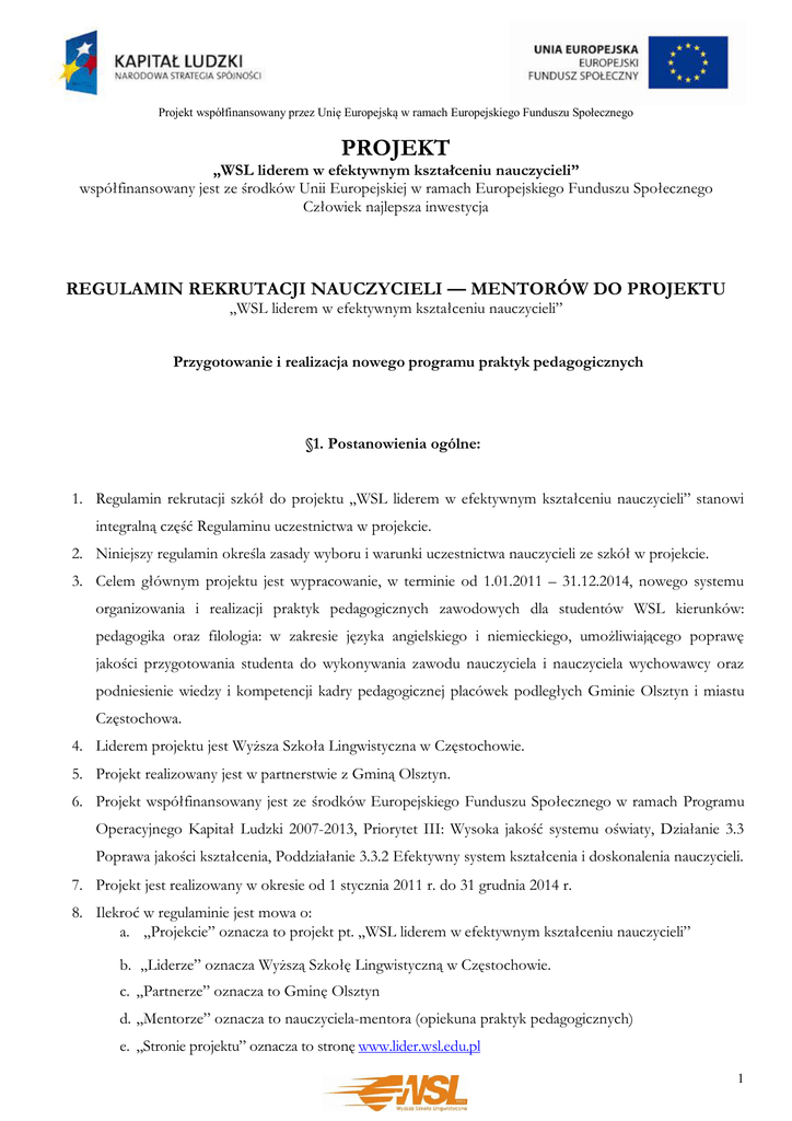 Projekt współfinansowany przez Unię Europejską w ramach Europejskiego Funduszu Społecznego PROJEKT „WSL liderem w efektywnym kształceniu nauczycieli” współfinansowany jest ze środków Unii Europejskiej w ramach Europejskiego Funduszu Społecznego Człowiek najlepsza inwestycja REGULAMIN REKRUTACJI NAUCZYCIELI — MENTORÓW DO PROJEKTU „WSL liderem w efektywnym kształceniu nauczycieli” Przygotowanie i realizacja nowego programu praktyk pedagogicznych §1. Postanowienia ogólne: 1. Regulamin rekrutacji szkół do projektu „WSL liderem w efektywnym kształceniu nauczycieli” stanowi integralną część Regulaminu uczestnictwa w projekcie. 2. Niniejszy regulamin określa zasady wyboru i warunki uczestnictwa nauczycieli ze szkół w projekcie. 3. Celem głównym projektu jest wypracowanie, w terminie od 1.01.2011 – 31.12.2014, nowego systemu organizowania i realizacji praktyk pedagogicznych zawodowych dla studentów WSL kierunków: pedagogika oraz filologia: w zakresie języka angielskiego i niemieckiego, umożliwiającego poprawę jakości przygotowania studenta do wykonywania zawodu nauczyciela i nauczyciela wychowawcy oraz podniesienie wiedzy i kompetencji kadry pedagogicznej placówek podległych Gminie Olsztyn i miastu Częstochowa. 4. Liderem projektu jest Wyższa Szkoła Lingwistyczna w Częstochowie. 5. Projekt realizowany jest w partnerstwie z Gminą Olsztyn. 6. Projekt współfinansowany jest ze środków Europejskiego Funduszu Społecznego w ramach Programu Operacyjnego Kapitał Ludzki 2007-2013, Priorytet III: Wysoka jakość systemu oświaty, Działanie 3.3 Poprawa jakości kształcenia, Poddziałanie 3.3.2 Efektywny system kształcenia i doskonalenia nauczycieli. 7. Projekt jest realizowany w okresie od 1 stycznia 2011 r. do 31 grudnia 2014 r. 8. Ilekroć w regulaminie jest mowa o: a. „Projekcie” oznacza to projekt pt. „WSL liderem w efektywnym kształceniu nauczycieli” b. „Liderze” oznacza Wyższą Szkołę Lingwistyczną w Częstochowie. c. „Partnerze” oznacza to Gminę Olsztyn d. „Mentorze” oznacza to nauczyciela-mentora (opiekuna praktyk pedagogicznych) e. „Stronie projektu” oznacza to stronę www.lider.wsl.edu.pl 1 Projekt współfinansowany przez Unię Europejską w ramach Europejskiego Funduszu Społecznego §2. Warunki uczestnictwa nauczycieli w projekcie Warunki uczestnictwa nauczycieli-mentorów w projekcie obejmują: 1. Dostarczenie kompletu dokumentów rekrutacyjnych (formularz zgłoszeniowy, deklarację uczestnictwa w projekcie, oświadczenie o zgodzie na przetwarzanie danych osobowych, zaświadczenie o zatrudnieniu) Dokumenty rekrutacyjne są dostępne na stronie internetowej projektu lub w Biurze projektu. 2. Jako datę zgłoszenia udziału w projekcie traktuje się datę wpływu kompletu dokumentów do Biura projektu, które mieści się w siedzibie Lidera. 3. Udział w projekcie mogą wziąć nauczyciele zatrudnieni w szkołach, które zostaną wybrane do udziału w projekcie i podpiszą porozumienie w zakresie organizacji praktyk. 4. Udział w programie mogą wziąć osoby zgłaszane przez Dyrektora szkoły w postępowaniu rekrutacyjnym szkół. 5. Udział w programie mogą wziąć nauczyciele, którzy spełnią kryteria uczestnictwa w projekcie zawarte w §2. §3. Kryteria uczestnictwa Mentorów w projekcie Udział w szkoleniu mogą wziąć nauczyciele, którzy spełniają wymagania dotyczące awansu zawodowego, tj. posiadają co najmniej stopień nauczyciela mianowanego . W przypadku niewyczerpania wolnych miejsc Mentora przez nauczycieli spełniających kryterium z pkt.1 dopuszcza się przyjęcie nauczyciela kontraktowego odbywającego 3 rok stażu. §4. Zasady rekrutacji mentorów do projektu 1. W działania projektowe zaangażowanych zostanie łącznie 120 nauczycieli. Rekrutacja odbywa się w czterech edycjach: a. I edycja - 30 nauczycieli, b. II edycja - 30 nauczycieli, c. III edycja - 30 nauczycieli, d. IV edycja - 30 nauczycieli, 2. O zakwalifikowaniu się do programu decydować będzie kolejność zgłoszeń. 3. Osoby, które spełnią warunki uczestnictwa w projekcie, a nie zostaną przyjęte na I edycję szkolenia z uwagi na ograniczoną liczbę miejsc zostaną wpisane na listę rezerwową, jak również zostaną zgłoszone 2 Projekt współfinansowany przez Unię Europejską w ramach Europejskiego Funduszu Społecznego na II edycję programu. 4. W przypadku przerwania udziału w projekcie osoby zakwalifikowanej, na jej miejsce zostanie przyjęta pierwsza osoba z listy rezerwowej. 5. W przypadku, kiedy osoby wpisane na listę rezerwową, które zostały automatycznie zgłoszone na II edycję szkolenia nie zapełnią listy uczestników II edycji szkolenia zorganizowany zostanie drugi nabór do projektu. 6. Rekrutacja nauczycieli do projektu odbywać się będzie przy zachowaniu zasady równości szans. § 5. Prawa i obowiązki mentora uczestniczącego w szkoleniu 1. Nauczyciel biorący udział w szkoleniach projektowych zobowiązany jest do uczestnictwa w co najmniej 80% zajęć. 2. W przypadku nieobecności na zajęciach w wymiarze przekraczającym 20% łącznej liczby godzin zajęć Lider stworzy warunki do uzupełnienia materiału w postaci kursów na platformie moodle. 3. Mentor, który ukończy szkolenie otrzyma stosowne zaświadczenie. 4. Mentor biorący udział w szkoleniu zobowiązany jest do udziału w badaniach ewaluacyjnych. 5. Mentor biorący udział w szkoleniu zobowiązany jest do aktywnego uczestnictwa w zajęciach. 6. Uczestnik szkolenia zobowiązany jest do każdorazowego potwierdzenia obecności na zajęciach własnoręcznym podpisem. 7. Uczestnik szkolenia zobowiązany jest do informowania pracowników Biura projektu o zmianach w danych teleadresowych podanych w formularzu zgłoszeniowym przed zakończeniem uczestnictwa w projekcie. 8. W przypadku rezygnacji z udziału w projekcie uczestnik zobowiązany jest o niezwłoczne zgłoszenie tego faktu do Biura projektu i złożenia pisemneg