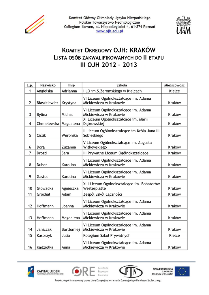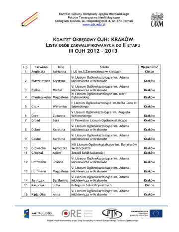 KOMITET OKRĘGOWY OJH: KRAKÓW LISTA OSÓB ZAKWALIFIKOWANYCH DO II ETAPU III OJH 2012 – 2013 L.p. Nazwisko Imię 1 Angielska Adrianna 2 Błaszkiewicz Krystyna 3 Bylina Szkoła Miejscowość I LO im.S.Żeromskiego w Kielcach Kielce VI Liceum Ogólnokształcące im. Adama Mickiewicza w Krakowie Kraków 4 VI Liceum Ogólnokształcące im. Adama Mickiewicza w Krakowie XI Liceum Ogólnokształcące im. Marii Chmielewska Magdalena Dąbrowskiej 5 Ciślik Michał Kraków Kraków Weronika II Liceum Ogólnokształcące im.Króla Jana III Sobieskiego Kraków Kraków 6 Dora Zuzanna V Liceum Ogólnokształcące im. Augusta Witkowskiego 7 Drozd Sara III Prywatne Liceum Ogólnokształcące Kraków 8 Duber Karolina VI Liceum Ogólnokształcące im. Adama Mickiewicza w Krakowie Kraków Kraków 9 Gastoł Karolina VI Liceum Ogólnokształcące im. Adama Mickiewicza w Krakowie 10 Głowacka Agnieszka XIII Liceum Ogólnokształcące im. Bohaterów Westerplatte Kraków 11 Grochal Adam Zespół Szkół Łączności Kraków VI Liceum Ogólnokształcące im. Adama Mickiewicza w Krakowie Kraków 12 Hoffmann Joanna 13 Hoffmann VI Liceum Ogólnokształcące im. Adama Magdalena Mickiewicza w Krakowie Kraków 14 Janiczak VI Liceum Ogólnokształcące im. Adama Bartłomiej Mickiewicza w Krakowie Kraków 15 Kasprzyk Julia Kolegium Szkół Prywatnych Kielce 16 Kądziołka Anna VI Liceum Ogólnokształcące im. Adama Mickiewicza w Krakowie Kraków 17 Kozuba Anna VI Liceum Ogólnokształcące im. Adama Mickiewicza w Krakowie Kraków 18 Król Dagmara VI Liceum Ogólnokształcące im. Adama Mickiewicza w Krakowie Kraków Kraków 19 Kuźmiński Marek VI Liceum Ogólnokształcące im. Adama Mickiewicza w Krakowie 20 Leszko Agnieszka VI Liceum Ogólnokształcące im. Adama Mickiewicza w Krakowie Kraków 21 Mach Weronika VI Liceum Ogólnokształcące im. Adama Mickiewicza w Krakowie Kraków 22 Majewska Sylwia II Liceum Ogólnokształcących Bochnia 23 Maślakiewicz Wojciech Gimnazjum nr 2 w Krakowie im. Adama Mickiewicza Kraków 24 Michałek Maciej Prywatne Akademickie Centrum Kształcenia Kraków Kraków 25 Nocula Marta VI Liceum Ogólnokształcące im. Adama Mickiewicza w Krakowie 26 Olkuski Norbert Prywatne Gimnazjum nr 5 Kraków 27 Parvi Katarzyna VI Liceum Ogólnokształcące im. Adama Mickiewicza w Krakowie Kraków 28 Pilipiszyn VI Liceum Ogólnokształcące im. Adama Anna Maria Mickiewicza w Krakowie Kraków 29 Pluta Karolina VI Liceum Ogólnokształcące im. Adama Mickiewicza w Krakowie Kraków 30 Raab Monika VI Liceum Ogólnokształcące im. Adama Mickiewicza w Krakowie Kraków 31 Rachwał Ewelina VI Liceum Ogólnokształcące im. Adama Mickiewicza w Krakowie Kraków 32 Romanek VI Liceum Ogólnokształcące im. Adama Aleksandra Mickiewicza w Krakowie Kraków 33 Rusek Dominika VI Liceum Ogólnokształcące im. Adama Mickiewicza w Krakowie Kraków 34 VI Liceum Ogólnokształcące im. Adama Aleksandra Mickiewicza w Krakowie Kraków 35 Rymarowicz Sanchez Lugo Aleksandra XVI Liceum Ogólnokształcące Kraków 36 Sitko Weronika VI Liceum Ogólnokształcące im. Adama Mickiewicza w Krakowie Kraków 37 Sito Patrycja VI Liceum Ogólnokształcące im. Adama Mickiewicza w Krakowie Kraków 38 Skiba Iwona VI Liceum Ogólnokształcące im. Adama Mickiewicza w Krakowie Kraków Kraków Tarnów 39 Skrzat Justyna VI Liceum Ogólnokształcące im. Adama Mickiewicza w Krakowie 40 Sojka Angelina I Liceum Ogólnokształcące im. Kazimierza Brodzińskiego 41 Spychaj Edyta LO nr I im/ Stanisława Staszica 42 Stasińska Wiktoria 43 Staszczyk Katarzyna 44 Tabiś Justyna XX Liceum Ogólnokształcące im. Leopolda Staffa w Krakowie Powiatowy Zespół Nr 1 Szkół Ogólnokształcących im. Stanisława Konarskiego III Liceum Ogólnokształcące im. A. Mickiewicza 45 Tomasik Monika VI Liceum Ogólnokształcące im. Adama Mickiewicza w Krakowie Kraków Kraków Ostrowiec Świętokrzyski Kraków Oświęcim Tarnów 46 Topa Kamila VI Liceum Ogólnokształcące im. Adama Mickiewicza w Krakowie 47 Twardosz Natalia VI Liceum Ogólnokształcące im. Adama Mickiewicza w Krakowie Kraków 48 Werońska Dominika VI Liceum Ogólnokształcące im. Adama Mickiewicza w Krakowie Kraków 49 Wicherek Marta V Liceum Ogólnokształcące im. Augusta Witkowskiego Kraków 50 Widła Justyna XII LO Kraków im. C.K Norwida Kraków 51 Wiśniewska Kornelia Liceum Ogólnokształcące Nr II im. J. Chreptowicza w Ostrowcu Św. 52 Wojtas Ewelina Liceum Ogólnokształcące im. Mikołaja Kopernika w Tuchowie 53 Zapalska Patrycja Zespół Szkół Nr 3 Angelika VI Liceum Ogólnokształcące im. Adama Mickiewicza w Krakowie 54 Zawada Ostrowiec Świętokrzyski Tuchów Ostrowiec Świętokrzyski Kraków