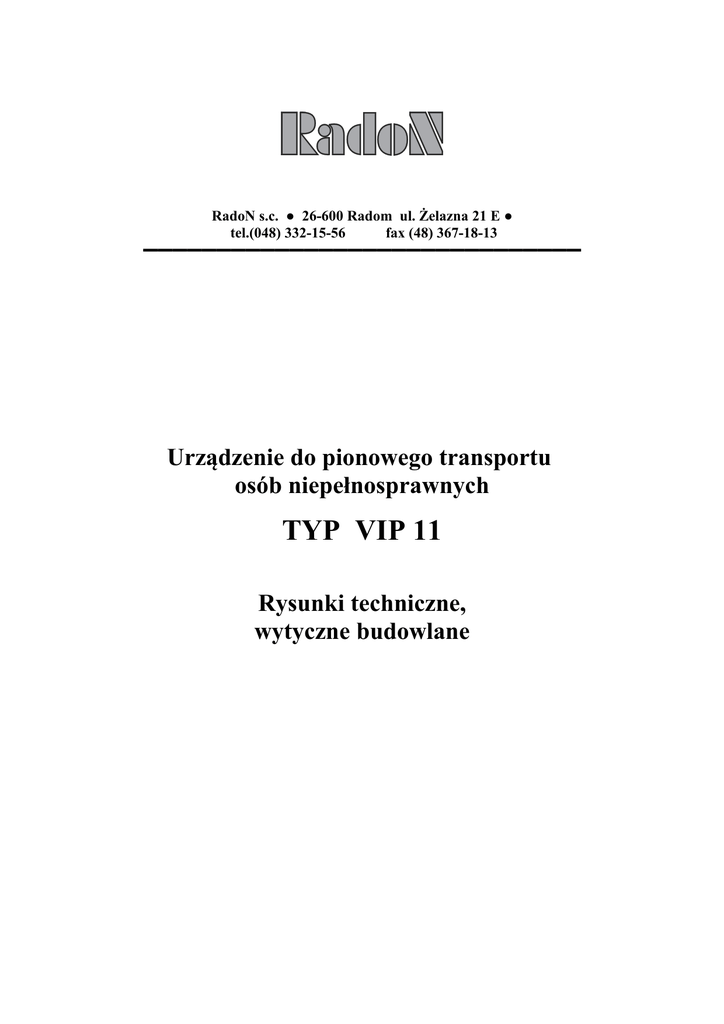 RadoN s.c. ● 26-600 Radom ul. Żelazna 21 E ● tel.(048) 332-15-56 fax (48) 367-18-13 ▬▬▬▬▬▬▬▬▬▬▬▬▬▬▬▬▬▬▬▬▬▬▬▬▬▬▬▬▬▬ Urządzenie do pionowego transportu osób niepełnosprawnych TYP VIP 11 Rysunki techniczne, wytyczne budowlane RadoN (048) 332-15-56 URZĄDZENIE DO PIONOWEGO TRANSPORTU OSÓB NIEPEŁNOSPRAWNYCH TYP VIP 11 str. 2 z14 Rysunki techniczne, wytyczne budowlane SPECYFIKACJA TECHNICZNA Wysokość podnoszeni a Liczba przystankó w Wymiary platformy Przeznaczenie windy Wymiary zewnętrzne szybu windy Wypełnienie ścian szybu Posadowienie windy Miejsce instalacji Kolor windy do 11000 mm max. 4 1100x1400 mm 1100x1600 mm 1100x1250 mm UWAGA! Po uzgodnieniu istnieje możliwość wykonania innych wymiarów windy przy ograniczeniu powierzchni platformy do 2m². Opiekun stojący obok Opiekun stojący obok użytkownika na lub za użytkownikiem wózku lub, gdy drzwi na wózku. są umieszczone Drzwi umieszczone w w sąsiadujących dowolnych pionach. pionach. Sam użytkownik w wózku. Drzwi w jednym lub w przeciwległych pionach. Sam użytkownik stojący. Drzwi w jednym lub w przeciwległych pionach. A x B A x B A x B A x B 1455x1530 mm 1455x1730 mm 1455x1380 mm 1455x930 mm z 4-ch stron szkło bezpieczne P2 lub z 3-ch stron szkło P2, a za maszynownią poliwęglan komorowy 95 mm poniżej I-go poziomu. wewnątrz lub na zewnątrz budynku Dowolny wg palety RAL Napęd Śrubowy Nośność 300 kg Prędkość eksploatac yjna Moc silnika Zasilanie Sterowanie Usytuowanie skrzynki sterowania 1100x800 mm do 0,15 m/s 2,2 kW 400V doprowadzone (przewodem 5x2,5mm² , zab. 3x20A typ C) do miejsca instalacji skrzynki sterowania. Mikroprocesorowe 24 V Do uzgodnienia RadoN (048) 332-15-56 URZĄDZENIE DO PIONOWEGO TRANSPORTU OSÓB NIEPEŁNOSPRAWNYCH TYP VIP 11 str. 3 z14 Rysunki techniczne, wytyczne budowlane C A B D Winda VIP 11 - gabaryty (zalecane przez UDT) L.p. 1 2 3 4 Przeznaczenia windy VIP 11 Opiekun stojący obok użytkownika na wózku i/lub gdy drzwi są umieszczone pod kątem 90° w stosunku do każdego z nich Opiekun stojący obok lub za użytkownikiem na wózku. Drzwi umieszczone w dowolnych pionach. Sam użytkownik stojący lub w wózku. Drzwi w jednym lub przeciwległych pionach. Sam użytkownik stojący. Drzwi w jednym lub przeciwległych pionach. Platforma C D 1100 1400 1455 1530 1100 1600 1455 1730 1100 1250 1455 1380 1100 800 1455 930 Kabina 5 Opiekun stojący obok użytkownika na wózku i/lub gdy drzwi są umieszczone pod kątem 90° w stosunku do każdego z nich Gabaryt zewnętrzny A B C D 1100 1400 Gabaryt zewnętrzny A B 1490 1570 RadoN (048) 332-15-56 URZĄDZENIE DO PIONOWEGO TRANSPORTU OSÓB NIEPEŁNOSPRAWNYCH TYP VIP 11 str. 4 z14 Rysunki techniczne, wytyczne budowlane UWAGA! Po uzgodnieniu istnieje możliwość wykonania innych wymiarów windy przy ograniczeniu powierzchni platformy do 2m². Gabaryty płyty fundamentowej oraz sposoby doprowadzenia przewodów. Sposób II Doprowadzenie rur Peschla(2x) 50 z pilotem (wprowadzonym drutem) na poziomie podstawy windy ~505 Płyta fundamentowa Sposób I W obu przypadkach zapas Rury Peschla 800 mm nad powierzchnię fundamentu licząc od osi windy. B B +100 Kratka odwodnienia (dla wind zewnętrznych) ~520 Wyjście rur Peschla z fundamentu (2x) 50 z pilotem (wprowadzonym drutem) ~70 Zarys dźwigu A A +100 Uwaga! Od strony przylegania windy do budynku dopuszcza się pokrywanie się krawędzi fundamentu z zarysem podstawy windy. - - - Wytyczne do zaprojektowania płyty fundamentowej. konstrukcja płyty fundamentowej musi zapewniać przeniesienie obciążeń wynikających z ciężaru oraz nacisków (orientacyjne wartości podano w tabeli ciężarów i nacisków) powierzchnia płyty fundamentowej położona 95mm poniżej pierwszego poziomu powierzchnia płyty fundamentowej powinna być jak najstaranniej wypoziomowana i wyrównana od skrzynki sterowniczej do płyty fundamentowej lub podstawy windy należy przeprowadzić dwie rury Peschla Ø50 (z wciągniętym wewnątrz drutem) wg załączonego rysunku dla wind zewnętrznych należy przewidzieć odwodnienie powierzchni płyty fundamentowej RadoN (048) 332-15-56 URZĄDZENIE DO PIONOWEGO TRANSPORTU OSÓB NIEPEŁNOSPRAWNYCH TYP VIP 11 str. 5 z14 Wyjście rur Peschla (2x) 50 Zasilanie 5x2,5mm2 w Peschlu 50 Skrzynka sterownicza Rysunki techniczne, wytyczne budowlane Skrzynka sterownicza. Skrzynkę sterowniczą należy umiejscowić w pomieszczeniu zapewniającym dodatnią temperaturę, jak najbliżej podstawy windy. Do miejsca umieszczenia skrzynki sterowniczej należy doprowadzić zasilanie 400V przewodem 5x2,5mm² zabezpieczone 3x20A /C Wymiary otworu w stropie przez który przechodzi winda (A+50mm) x (B+50mm) gdzie A i B są wymiarami gabarytowymi windy. RadoN (048) 332-15-56 URZĄDZENIE DO PIONOWEGO TRANSPORTU OSÓB NIEPEŁNOSPRAWNYCH TYP VIP 11 str. 6 z14 Rysunki techniczne, wytyczne budowlane Przykładowy sposób poprowadzenia rur Peschla od skrzynki sterowniczej do płyty fundamentowej. Kierunki otwierania drzwi. RadoN (048) 332-15-56 URZĄDZENIE DO PIONOWEGO TRANSPORTU OSÓB NIEPEŁNOSPRAWNYCH TYP VIP 11 Rysunki techniczne, wytyczne budowlane str. 7 z14 RadoN (048) 332-15-56 URZĄDZENIE DO PIONOWEGO TRANSPORTU OSÓB NIEPEŁNOSPRAWNYCH TYP VIP 11 Rysunki techniczne, wytyczne budowlane Miejsca kotwienie do podłoża. Ciężar i naciski jednostkowe dla windy VIP 11 str. 8 z14 RadoN URZĄDZENIE DO PIONOWEGO TRANSPORTU OSÓB NIEPEŁNOSPRAWNYCH TYP VIP 11 (048) 332-15-56 Rysunki techniczne, wytyczne budowlane WYPEŁNIENIE ŚCIAN SZYBU WINDY 3 x szkło + poliwęglan 0.5 1 WYSOKOŚĆ PODNOSZENIA (m) 1,5 2 2,5 3 3,5 4 4,5 5 5,5 6 6,5 Ciężar Naciski Ciężar Naciski Ciężar Naciski Ciężar Naciski Ciężar Naciski Ciężar Naciski Ciężar Naciski Ciężar Naciski Ciężar Naciski Ciężar Naciski Ciężar Naciski Ciężar Naciski Ciężar Naciski 13920 N 32370 Pa 14840 N 34500 Pa 15600 N 36290 Pa 16370 N 38070 Pa 17140 N 39850 Pa 17900 N 41640 P