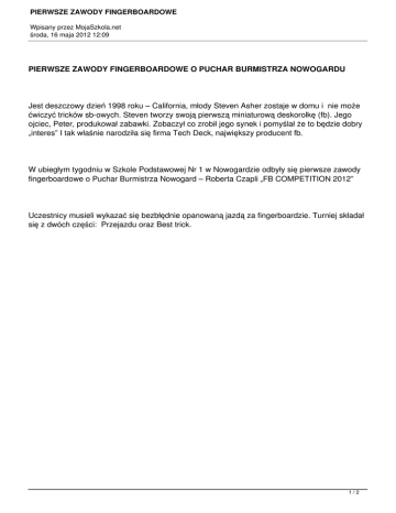 PIERWSZE ZAWODY FINGERBOARDOWE Wpisany przez MojaSzkola.net środa, 16 maja 2012 12:09 PIERWSZE ZAWODY FINGERBOARDOWE O PUCHAR BURMISTRZA NOWOGARDU Jest deszczowy dzień 1998 roku – California, młody Steven Asher zostaje w domu i nie może ćwiczyć tricków sb-owych. Steven tworzy swoją pierwszą miniaturową deskorolkę (fb). Jego ojciec, Peter, produkował zabawki. Zobaczył co zrobił jego synek i pomyślał że to będzie dobry „interes” I tak właśnie narodziła się firma Tech Deck, największy producent fb. W ubiegłym tygodniu w Szkole Podstawowej Nr 1 w Nowogardzie odbyły się pierwsze zawody fingerboardowe o Puchar Burmistrza Nowogard – Roberta Czapli „FB COMPETITION 2012” Uczestnicy musieli wykazać się bezbłędnie opanowaną jazdą za fingerboardzie. Turniej składał się z dwóch części: Przejazdu oraz Best trick. 1/2 PIERWSZE ZAWODY FINGERBOARDOWE Wpisany przez MojaSzkola.net środa, 16 maja 2012 12:09 Podczas najmniejszej przejazdu liczbie uczestnicy ponieważ musieli każde pokonać potknięcie tor w jak powodowało najkrótszym czasie iGliwka przy 5Nr sekund jak straty. Najszybszym się Teodorczyk Piotr Marcinkowski (SP1 okazał Nowogard). się (Gimnazjum Luter Nr uczeń 2Nowogard), przyznano SP1 Nowogardzie. zaś Bartkowi trzecie Margas miejsce Na miejscu (SP3 zajął Nowogard) drugim Michał uplasował Eliminacje okazali Nowogard), Kędzierski Labocha się (SP1 do (Gimnazjum nimi: Michał drugiej Nowogard). Artur Woroniecki kategorii Hovsepyan Nr 1 Nowogard), Best (SP1 (SP1 Trick Nowogard), Axel miały Mitura na Paweł celu Jakub (ZSP wyłonienie Feńczak Nowogard), 61Woroniecki, (Gimnazjum najlepszych Nowogard), oraz przedszkolak zawodników Erwin 2za Max Wyniki Axel uczestnika Mitura. Best zawodów Tricku: Wyróżniono Ibłędów, miejsce również –Wyróżnienie Jakub Pawła Cybulski, Feńczaka II miejsce oraz Maxa –Cybulski Michał Labocha, najmłodszego III miejsce – i Puchar konkurencji Burmistrza okazał trafił się najlepszy. wMaciej ręce Michała Woronieckiego, który po zsumowaniu wyników obu Bogdan Zawody Wawryczuk. sędziowali nauczyciele SP1 Nowogard –w Artur Danilewski, Sebastian Szymański oraz Podziękowania za Szymańskiego Damianowi w organizacji ufundowanie Baca, turnieju. za dla pucharów Pawłowi nagrody Państwa oraz Feńczak, rzeczowe, Magdaleny Dyrektora Michałowi firmie iNowogard), Mariusza Szkoły CreateVision Woronieckiemu, Podstawowej Koniecznych za projekt Nr Mateuszowi -(SP1 OW plakatu wdoliczenie Familijni Nowogardzie oraz w uczniom Dziwnówku Sebastiana pomoc Zespół Redakcyjny SP1 Nowogard 2/2