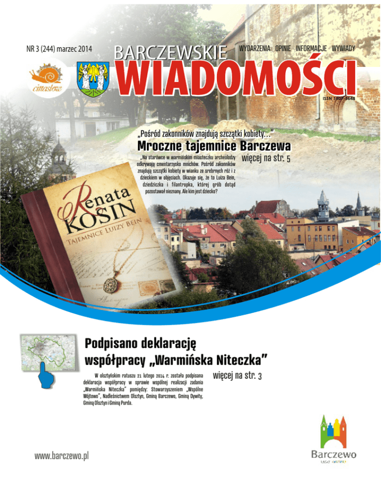 NR 3 (244) marzec 2014 BARCZEWSKIE WYDARZENIA OPINIE INFORMACJE WYWIADY „Pośród zakonników znajdują szczątki kobiety…” Mroczne tajemnice Barczewa „Na starówce w warmińskim miasteczku archeolodzy odkrywają cmentarzysko mnichów. Pośród zakonników znajdują szczątki kobiety w wianku ze srebrnych róż i z dzieckiem w objęciach. Okazuje się, że to Luiza Bein, dziedziczka i filantropka, której grób dotąd pozostawał nieznany. Ale kim jest dziecko? więcej na str. 5 Podpisano deklarację współpracy „Warmińska Niteczka” W olsztyńskim ratuszu 21 lutego 2014 r. została podpisana deklaracja współpracy w sprawie wspólnej realizacji zadania „Warmińska Niteczka” pomiędzy: Stowarzyszeniem „Wspólne Wójtowo”, Nadleśnictwem Olsztyn, Gminą Barczewo, Gminą Dywity, Gminą Olsztyn i Gminą Purda. więcej na str. 3 Kto pamięta tamte lata? W marcowym numerze „Wiadomości Barczewskich” publikujemy wyjątkową fotografię, wykonaną w Olsztynie, w drugiej połowie lat pięćdziesiątych XX wieku. Fotografię, na której uwieczniony jest Henryk Bociański, do naszej redakcji przyniósł mieszkaniec Barczewa - syn - pan Henryk Bociański. Ma ona nie tylko wartość sentymentalna, ale także historyczną. Przedstawia pierwszych muzyków w uniformach kolejarskich grających w tzw. Kolejowej Orkiestrze Dętej w Olsztynie. Przypomnijmy, że kilku muzyków z Barczewa miało swój udział w jej tworzeniu. Grając w orkiestrze przez długie lata zapisali się na kartach historii - mamy nadzieję, że nie bez imiennie. Zwracamy się z prośbą do naszych Czytelników o pomoc w ustaleniu imion i nazwisk osób uwiecznionych na fotografii. W. Zenderowski Kronika policyjna - Luty - 1 lutego w Wójtowie na terenie Rodzinnych Ogródków Działkowych „Zacisze” nieznany sprawca wyważył drzwi i włamał się do jednej z altanek, skąd zabrał butlę turystyczną z palnikiem o wartości 150 złotych. - 6 lutego na ul. Pułaskiego w Barczewie dwóch sprawców z terenu PKP dokonało kradzieży elementów ogrodzenia o wartości 848 zł. Amatorzy cudzej własności zostali zatrzymani na „gorącym uczynku” przez barczewskich policjantów. - 7 lutego w Wójtowie przy ul. Jaśminowej nieznany jak dotąd sprawca wybił 2 szyby w budynku handlowym. Poszkodowany wycenił straty na 500 złotych. - 8 lutego w Łęgajnach nieznani sprawcy po zerwaniu dwóch kłódek włamali się do garażu na ul. Akacjowej. Ich łupem padło 15 litrów oleju napędowego o wartości 80 złotych. - 11 lutego w Łapce jeden z mieszkańców został WIADOMOŚCI BARCZEWSKIE przyłapany przez policjantów i pracowników zakładu energetycznego na kradzieży energii elektrycznej, której dokonywał poprzez „pozalicznikowe” podłączenie się do sieci. Trwa szacowanie łącznej wartości ukradzionego w ten sposób prądu. - 14 lutego w Lamkówku nieznani sprawcy po zdemontowaniu ogrodzenia ukradli 22 metalowe słupki. Poszkodowany - Uniwersytet Warmińsko – Mazurski - wycenił straty na 4 tysiące złotych. - 14 lutego w Barczewie na ul. Warmińskiej nieustalony dotąd sprawca dokonał wybicia szyby w samochodzie Renault Laguna. Właściciel wycenił szkodę na 2 tysiące złotych. - 17 lutego w Lamkowie nieznany sprawca ukradł z terenu niezamieszkałego gospodarstwa rolnego m.in. kany na mleko oraz złom. Właściciel wycenił straty na tysiąc złotych. - 24 lutego na drodze między Kromerowem, Wydanie bieżące i numery archiwalne dostępne są w Biurze Informacji w Barczewie przy ul. Mickiewicza 12 oraz na www.gazeta.barczewo.pl Redaktor naczelny: Mariola Łukowska-Juckiewicz e-mail: [email protected] Redaktor, korekta Grzegorz Gawrylczyk Redaktor sportowy Bogdan Caruk Redaktor Lidia Zelman Redaktor Wojciech Zenderowski e-mail: [email protected] Redaktor Małgorzata Styczyńska a Ramsowem kierowca ciężarowej cysterny przewożącej mleko podczas omijania stojącego na poboczu ciągnika rolniczego najechał na niego i uszkodził go. Przybyli na miejsce zdarzenia policjanci z Barczewa przebadali 48-letniego kierowcę ciężarówki na zawartość alkoholu. Badanie alkomatem wykazało 3 promile alkoholu w organizmie. Funkcjonariusze zatrzymali mieszkańcowi gminy Lidzbark Warmiński prawo jazdy. Natomiast pojazd ciężarowy został przekazany właścicielowi firmy. Teraz kierujący za swoje postępowanie będzie odpowiadał przed sądem. Kodeks karny za kierowanie pojazdem w stanie nietrzeźwości przewiduje karę nawet 2 lat pozbawienia wolności. W lutym barczewscy policjanci zatrzymali 5 nietrzeźwych kierowców. Zebrał Grzegorz Gawrylczyk Skład DTP: Zbigniew Kozłowski e-mail: [email protected] Współpraca: J. Zieliński, A. Zalewska, T. Okulicz, B. Szewc, I. Rudź, M. Bronowska-Waliszewska, D. Kuchcińska. Oprac. graf. okładki: Zbigniew Ramsko Kozłowski. Zdjęcia na okładce: Zbigniew Ramsko Kozłowski, Wydawnictwo “Nasza Księgarnia”. Wydawca: Centrum Kultury i Promocji Gminy Adres: Barczewo, ul. Słowackiego 5 Tel. / fax. 89 514 82 81 Druk: Zakład Poligraficzny H-U Józef Skrajnowski 11-300 Biskupiec, ul. Krótka 1, tel. 89 715 34 58 Redakcja nie ponosi odpowiedzialności za treść ogłoszeń i reklam, nie zwraca tekstów nie zamówionych oraz zastrzega sobie prawo skracania i opracowywania tekstów. Redakcja informuje o możliwości zamieszczenia reklam. www.gazeta.barczewo.pl 2 GAZETA SAMORZĄDOWA 3 (244) marzec 2014 Informacje Barczewo to „Super Samorząd 2013” „Masz Głos, Masz Wybór” Stowarzyszenie "Wspólne Wójtowo" oraz władze samorządowe Gminy Barczewo zostali laureatami konkursu „Super Samorząd 2013”. Nagroda przyznawana jest od 3 lat przez Fundację Batorego. Z 250 zgłoszonych projektów tylko 5 w kraju otrzymało tą nagrodę. Honorowym patronatem nagrodę Super Samorząd 2013 objął Prezydent Bronisław Komorowski. Wręczenie statuetek odbyło się podczas uroczystej gali w Pałacu Prezydenckim w Warszawie w ostatni piątek lutego 2014 r. Nagrod