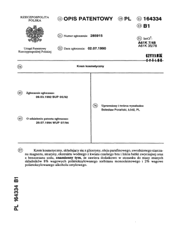 RZECZPOSPOLITA(12) OPIS PATENTOWY (19)PL (2 1) Numer zgłoszenia: 285915 Urząd Patentowy Rzeczypospolitej Polskiej (22) Data zgłoszenia: 02.07.1990 (5 4 ) (43) (11) 164334 (13) B1 (51) Int.Cl.5: A 61K 7/48 A61K 35/78 Krem kosmetyczny Zgłoszenie ogłoszono: 09.03.1992 BUP 05/92 (76) (45) Uprawniony i twórca wynalazku: Bolesław Porański, Łódź, PL O udzieleniu patentu ogłoszono: 29.07.1994 WUP 07/94 (57) PL 164334 B1 Krem kosmetyczny, składający się z gliceryny, oleju parafinowego, uwodnionego siarczanu magnezu, stearyny, ekstraktu wodnego z kwiatu czarnego bzu i liścia babki zwyczajnej oraz z benzoesanu sodu, znamienny tym, że zawiera dodatkowo w stosunku do masy znanych składników 8% wagowych polietoksylowanego sorbitanu monooleinowego i 2% wagowe polietoksylowanego alkoholu cetylowego. KREM KOSMETYCZNY Z a s t r z e ż e n i e p a t e n t o w e Krem kosmetyczny, składający się z gliceryny, oleju parafinowego, uwodnionego siarczanu magnezu, stearyny, ekstraktu wodnego z kwiatu czarnego bzu i liścia babki zwyczajnej oraz z benzoesanu sodu, z n a m i e n n y tym, że zawiera dodatkowo w stosunku do masy znanych składników 8% wagowych polietoksylowanego sorbitanu m o nooleinowego i 2% wagowe polietoksylowanego alkoholu cetylowego. * * * Przedmiotem wynalazku jest krem kosmetyczny, mający zastosowanie jako środek p i e lęgna cyjny skó ry zwłaszcza twarzy. Znane są do wytwarzania maści, kremów lub past składniki o charakterze odżywczo-pielęgnacyjnym, tak organiczne jak i nieorganiczne a także pochodzenia ziołowego. Według patentu polskiego nr 78 953 stosuje się stop oleju parafinowego, wazeliny białej i cerezyny, alkoholi 88 319 zmieszany ze stopem powstałym przy przepływie azotu z monooleinianu gliceryny, lanolinowych, stosuje się cholesterolu wodny ester i lanoliny etylowy kosmetycznej. glutyny, roztwór Wedł u g etanolowy patentu estru polskiego etylowego nr kwasu p-hydrobenzoesowego i powstałą z tych składników mieszaninę wprowadza się do stopu wosku pszczelego, lanoliny i euceryny. Natomiast według patentu polskiego nr 93 996 stosuje się stop monostearynianu gliceryny, wosku pszczelego, alkoholu o l e o c e t y l o w e g o , Nipaginy, zmiesza ny z wodnym roztworem glikolu propylenowego. Po wymieszaniu całości dodaje się koncentrat z i o ł o w o - t ł u s z c z o w y . Poza tym z polskiego opisu patentowego nr 107 065 wiadome jest też , że do środków tych stosuje się takie ekstrakty ziołowe jak: ekstrakt wodny lipy, ekstrakt kłącza tataraku, ekstrakt skrzypu, występujące przy składnikach takich jak: alkohol etylowy, sorbit, żółcień jajowa, kwas askorbinowy, kwas cytrynowy i t.p. Znany jest także z katalogu firmy angielskiej ICI-Atlas Chemical Industriec N.V., Formulation Bulletin, marzec 1981 r . , krem typu W/O w skład którego wchodzi między innymi M g S O 4 · 7H 2O, gliceryna, alkohol izopropylowy i preparaty oleiste o nazwach handlowych. Poza tym z publikacji Aleksandra Ożarowskiego i Wacława Jaroniewskiego "Rośliny leczni cze i ich praktyczne zastosowanie", Instytut Wydawniczy Związków Zawodowych, 1987 r., jest znane stosowanie liści babki zwyczajnej i kwiatu bzu czarnego, a z książki prof. dr hab. Anny Koźmiń skiego-Kuberskiej p.t. "Zarys kosmetyki lekarskiej - wydanie II", Państwowy Zakład W y dawnictw Lekarskich, 1984 r., znane jest stosowanie oksyetylenowego monooleinianu sorbitanu. W wyrobach przemysłowych do wytwarzania kremów są stosowane taż składniki takie jak: estry alkoholi z wyższymi kwasami tłuszczowymi, wyższe alkohole i składniki z dodatkiem albu miny z surowicy krwi bydlęcej lub białka albo żółtka jaj ptasich zwłaszcza kurzych, z a w ierają cych sero-albuminę, s e r o - g l o b u l i n ę , witalinę i ovo-albuminę, a także substancje biologicznie czynne jak: witaminy, aminokwasy, fofolipidy, flawonoidy, fitohormony, f i t o s t e r o i d y , poza tym garbniki z eurycyną, substancje śluzowe, saponiny, alantoina, enzymy, kwasy organiczne, alkanoidy, olejki eteryczne i t.p. Także są stosowane składniki nieorganiczne jak: tlenek cynku, węglan amonowy, dwutlenek tytanu, kaolin, talk i t.p. Kremy te, maści i pasty, przeznaczenie kosmetyczne, dzięki różnym stosowanym składnikom co prawda spełniają swoje ale żaden z tych środków nie oddziaływuje w sposób szybki na na skórek twarzy nadający jej wyraz świeżości i gładkości, oraz niekiedy nawet powoduje prze j ś ciowy stan podrażnienia szczególnie u ludzi o cerach anemicznych i uwrażliwia u nich różne uczulenia naskórka przy dalszych zabiegach kosmetycznych. Istota rozwiązania według wynalazku polega na tym, że krem obok znanych składników jak: gliceryna, olej parafinowy i M g S O 4 · 7H 2O, zawiera p o lietoksylowany sorbitan monooleinowy, 164 334 3 polietoksylowany alkohol cetylowy, stearynę, benzoesan sodu i ekstrakt wodny z kwiatu c z a r n e go bzu i liścia babki zwyczajnej. Składniki ekstraktu występują korzystnie w stosunku wagowym 1,5:1. Zaletą kremu typu O/W wedł u g wynalazku jest to, że dzięki odpowiednio dobranym s k ł a d n i kom ziołowym zastosowanym zwłaszcza przy polietoksylowanych związkach chemicznych środek ten jest radykalnie szybko działający na odżywcze odświeżanie naskórka twarzy zwłaszcza przy c e rach anemicznych, zmęczonych oraz szorstkich a także tłustych. Szczególnie u ludzi młodych zwłaszcza po usuniętym trądziku nie pozostawia żadnych uczuleń i skłonności do podrażnień n askó rka, któ ry się nie łuszczy i pozostaje świeży. Przedmiot wynalazku jest przedstawiony w następującym przykładzie wykonania. Przygotowanie ekstraktu ziołowego. Zalewa się 200 częściami wagowymi zagotowanej wody d e stylowanej 35-70 części wagowych suchego kwiatu czarnego bzu i 10-50 części wagowych suchego liścia babki zwyczajnej. Całość zaparza się pod przykryciem w ciągu 40-80 minut, po czym s ą czy i przesącz stanowiący eks