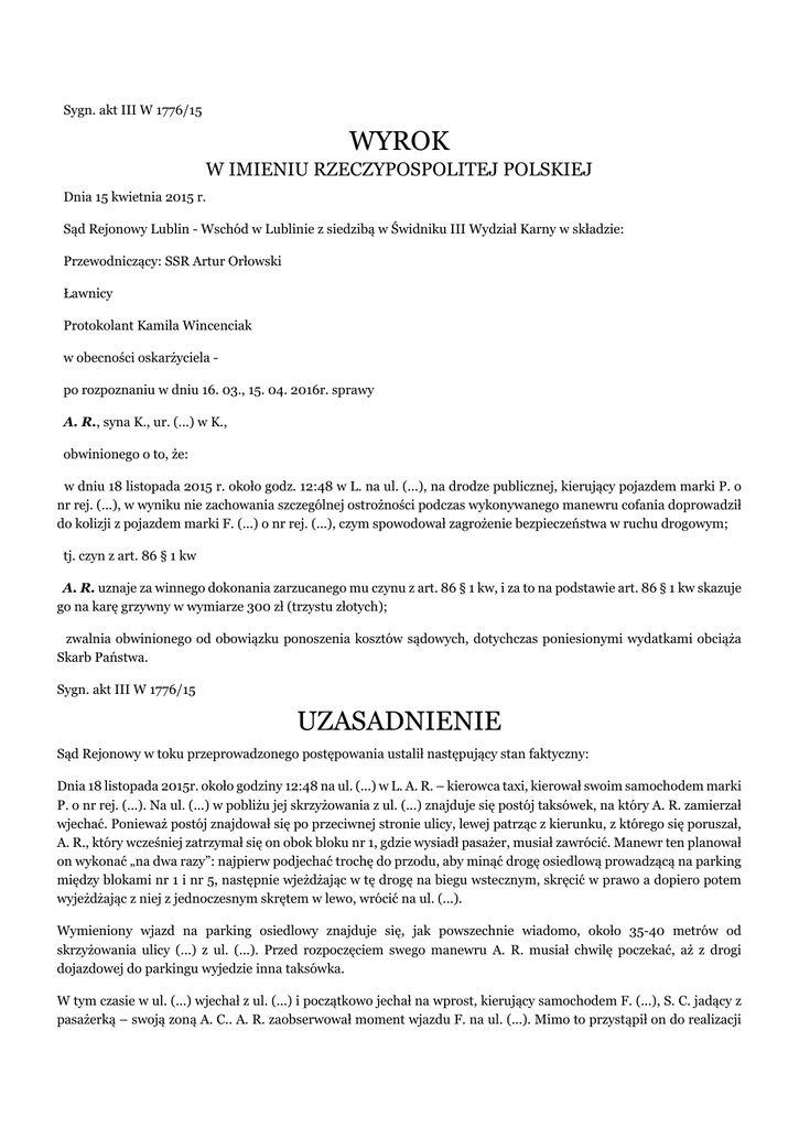 Sygn. akt III W 1776/15 WYROK W IMIENIU RZECZYPOSPOLITEJ POLSKIEJ Dnia 15 kwietnia 2015 r. Sąd Rejonowy Lublin - Wschód w Lublinie z siedzibą w Świdniku III Wydział Karny w składzie: Przewodniczący: SSR Artur Orłowski Ławnicy Protokolant Kamila Wincenciak w obecności oskarżyciela po rozpoznaniu w dniu 16. 03., 15. 04. 2016r. sprawy A. R., syna K., ur. (...) w K., obwinionego o to, że: w dniu 18 listopada 2015 r. około godz. 12:48 w L. na ul. (...), na drodze publicznej, kierujący pojazdem marki P. o nr rej. (...), w wyniku nie zachowania szczególnej ostrożności podczas wykonywanego manewru cofania doprowadził do kolizji z pojazdem marki F. (...) o nr rej. (...), czym spowodował zagrożenie bezpieczeństwa w ruchu drogowym; tj. czyn z art. 86 § 1 kw A. R. uznaje za winnego dokonania zarzucanego mu czynu z art. 86 § 1 kw, i za to na podstawie art. 86 § 1 kw skazuje go na karę grzywny w wymiarze 300 zł (trzystu złotych); zwalnia obwinionego od obowiązku ponoszenia kosztów sądowych, dotychczas poniesionymi wydatkami obciąża Skarb Państwa. Sygn. akt III W 1776/15 UZASADNIENIE Sąd Rejonowy w toku przeprowadzonego postępowania ustalił następujący stan faktyczny: Dnia 18 listopada 2015r. około godziny 12:48 na ul. (...) w L. A. R. – kierowca taxi, kierował swoim samochodem marki P. o nr rej. (...). Na ul. (...) w pobliżu jej skrzyżowania z ul. (...) znajduje się postój taksówek, na który A. R. zamierzał wjechać. Ponieważ postój znajdował się po przeciwnej stronie ulicy, lewej patrząc z kierunku, z którego się poruszał, A. R., który wcześniej zatrzymał się on obok bloku nr 1, gdzie wysiadł pasażer, musiał zawrócić. Manewr ten planował on wykonać „na dwa razy”: najpierw podjechać trochę do przodu, aby minąć drogę osiedlową prowadzącą na parking między blokami nr 1 i nr 5, następnie wjeżdżając w tę drogę na biegu wstecznym, skręcić w prawo a dopiero potem wyjeżdżając z niej z jednoczesnym skrętem w lewo, wrócić na ul. (...). Wymieniony wjazd na parking osiedlowy znajduje się, jak powszechnie wiadomo, około 35-40 metrów od skrzyżowania ulicy (...) z ul. (...). Przed rozpoczęciem swego manewru A. R. musiał chwilę poczekać, aż z drogi dojazdowej do parkingu wyjedzie inna taksówka. W tym czasie w ul. (...) wjechał z ul. (...) i początkowo jechał na wprost, kierujący samochodem F. (...), S. C. jadący z pasażerką – swoją zoną A. C.. A. R. zaobserwował moment wjazdu F. na ul. (...). Mimo to przystąpił on do realizacji swojego planu. Oba samochody poruszały się przy tym ze stosunkowo niewielkimi prędkościami. Przy ulicy (...) dodatkowo stały zaparkowane pojazdy, więc manewrowanie na niej było dość trudne. Dodatkowo utrudniała je pochmurna pogoda z padającymi tego dnia opadami deszczu. A. R., jak planował, podjechał do przodu mijając wjazd na parking, a następnie włączył wsteczny bieg i zaczął cofać. Tymczasem S. C. także planował wjechać na ten sam parking. Widząc początkowo, że samochód P. minął go jadąc do przodu, rozpoczął manewr skrętu w prawo. Kierowca P. manewrując na wąskiej ulicy i patrząc w boczne prawe lusterko stracił jednak z pola widzenia F. (...). Nie zachowując szczególnej ostrożności podczas manewru cofania wjeżdżał we wjazd na parking osiedlowy, mimo, że to samo czynił drugi pojazd. Co prawda S. C. widząc, że kierujący P. zaczyna cofać zdołał podjąć manewr obronny i zatrzymać swój samochód, jednak mimo to nie udało się uniknąć kolizji. A. R. bowiem, nie widząc go zajęty manewrowaniem i obserwacją prawej strony, uderzył tyłem swojego samochodu w lewy bok F. (...), w przedniej jego części, na odcinku miedzy kołem a kloszem lampy kierunkowskazu. W wyniku kolizji w samochodzie marki F. (...) wgnieciony zostały przedni lewy błotnik i zarysowany po lewej stronie przedni zderzak. Natomiast w P. A. R. został wgnieciony i pękł wykonany z plastyku tylny zderzak. Nie doszło do obrażeń ciała którejś z osób jadących samochodami. Zarówno A. R. jak i S. C. byli tamtego dnia trzeźwi. A. R. nie figuruje w ewidencji sprawców wykroczeń drogowych. Powyższy stan faktyczny Sąd Rejonowy ustalił na podstawie częściowo wyjaśnień A. R. (k. 8v, 44-46), na podstawie zeznań A. C. (k. 11, 41v, 46), S. C. (k. 14, 41-41v, 45-46). Sąd uwzględnił także i orzekł na podstawie następujących dowodów nieosobowych: notatka urzędowa (k. 1), protokół oględzin pojazdu (k. 3), protokół badania stanu trzeźwości (k. 4), świadectwo wzorcowania (k. 6), informacja o wpisach ewidencji kierowców naruszających przepisy ruchu drogowego (k. 16-17), dokumentacja fotograficzna (k. 43, 43a, 43b). Sąd Rejonowy zważył, co następuje: Powyższe ustalenia faktyczne jawią się jako generalnie bezsporne w zakresie ustalenia okoliczności wystarczających do rozstrzygnięcia w sprawie. Pozostają one niesprzeczne z wyjaśnieniami obwinionego, o ile chodzi o podawane fakty, oraz treścią zarzutu (poza okolicznościami irrelewantnymi dla rostrzygnięcia – co zostanie omówione w dalszej części niniejszego uzasadnienia). Obwiniony A. R. nie przyznał się jednak do dokonania zarzucanego mu czynu. Potwierdził, iż jechał samochodem w przedmiotowym miejscu i czasie oraz przedstawił przebieg zdarzeń odpowiadający, co prawda zasadniczo, powyższemu stanowi faktycznemu. Jednak podkreślał nieprawidłowości w jeździe kierowcy samochodu F. (...) twierdząc, że to ten ostatni jest współwinien kolizji. Ponieważ S. C. mieszka w pobliżu miejsca zdarzenia i wielokrotnie mógł widzieć taksówki wykonujące analogiczny manewr zawracania „na dwa razy”, jak ten, który wykonywał obwiniony, zdaniem A. R., powinien przewidzieć, że będzie to miało miejsce również w tej sytuacji. Wyjaśniania obwinionego odnoszące się do trasy przejazdu, warunków pogodowo – drogowych, faktycznie wykonanych przez niego manewr