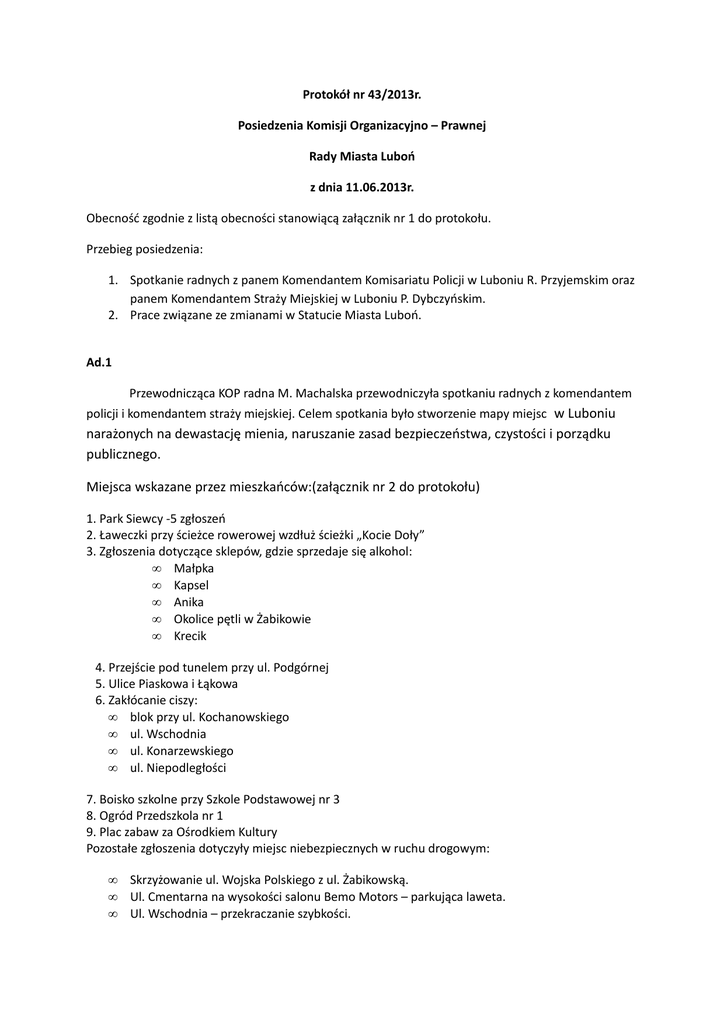 Protokół nr 43/2013r. Posiedzenia Komisji Organizacyjno – Prawnej Rady Miasta Luboń z dnia 11.06.2013r. Obecność zgodnie z listą obecności stanowiącą załącznik nr 1 do protokołu. Przebieg posiedzenia: 1. Spotkanie radnych z panem Komendantem Komisariatu Policji w Luboniu R. Przyjemskim oraz panem Komendantem Straży Miejskiej w Luboniu P. Dybczyńskim. 2. Prace związane ze zmianami w Statucie Miasta Luboń. Ad.1 Przewodnicząca KOP radna M. Machalska przewodniczyła spotkaniu radnych z komendantem policji i komendantem straży miejskiej. Celem spotkania było stworzenie mapy miejsc w Luboniu narażonych na dewastację mienia, naruszanie zasad bezpieczeństwa, czystości i porządku publicznego. Miejsca wskazane przez mieszkańców:(załącznik nr 2 do protokołu) 1. Park Siewcy -5 zgłoszeń 2. Ławeczki przy ścieżce rowerowej wzdłuż ścieżki „Kocie Doły” 3. Zgłoszenia dotyczące sklepów, gdzie sprzedaje się alkohol: • Małpka • Kapsel • Anika • Okolice pętli w Żabikowie • Krecik 4. Przejście pod tunelem przy ul. Podgórnej 5. Ulice Piaskowa i Łąkowa 6. Zakłócanie ciszy: • blok przy ul. Kochanowskiego • ul. Wschodnia • ul. Konarzewskiego • ul. Niepodległości 7. Boisko szkolne przy Szkole Podstawowej nr 3 8. Ogród Przedszkola nr 1 9. Plac zabaw za Ośrodkiem Kultury Pozostałe zgłoszenia dotyczyły miejsc niebezpiecznych w ruchu drogowym: • • • Skrzyżowanie ul. Wojska Polskiego z ul. Żabikowską. Ul. Cmentarna na wysokości salonu Bemo Motors – parkująca laweta. Ul. Wschodnia – przekraczanie szybkości. • Ul. Dworcowa – zasadność stojącego tam radaru. Radna W. Suleja – Kot przedstawiła sugestie miejsc wypracowanych przez KSS: • • • • • Posesja przy ul.Pułaskiego 12 Stare ogródki działkowe przy ul. Armii Poznań Plac Nad Żabinką Wejście do PPP przy Szkole Podstawowej nr2 Plac zabaw przy ul. Poznańskiej i ul. Fornalskiej Wszystkie miejsca zostały uszeregowane wg częstości zdarzeń. Burmistrz Rafał Marek powiedział że przedsięwzięcie ma na celu stworzenie mapy miejsc newralgicznych i należy na początek wytypować kilkanaście miejsc, w których występuje zakłócanie porządku, dewastacja mienia i innego rodzaju przestępczość. Następnie należy w tych miejscach wzmożyć patrole policji i straży miejskiej. Pan komendant R. Przyjemski powiedział, że na „Kocich Dołach” założona jest od miesiąca karta zadań działania doraźnego i w przeciągu tego miesiąca nie było żadnego zgłoszenia o interwencję. Powiedział również , że w/w miejsca są mu dobrze znane, ale zgłoszeń z tych miejsc jest mało lub nie ma ich wcale, a to jest wyznacznik miejsc newralgicznych. Burmistrz R. Marek zaproponował, aby szczególnie w weekend patrole policji i straży miejskiej odwiedzały miejsca zagrożone. W odpowiedzi pan komendant powiedział, że takie patrole są organizowane i udają się w miejsca zagrożone. Radny J. Dagoń zaproponował, aby chuliganów nie tylko pouczać, ale również dawać mandaty karne. Pan komendant zapewnił że mandaty karne są również wystawiane. Radny J. Mączkowiak powiedział że jeżeli policja lub straż miejska będzie otrzymywała od mieszkańców zgłoszenia to liczba wybryków chuligańskich na pewno zmaleje, czego przykładem jest Plac E. Bojanowskiego. Następnie głos zabrał pan Komendant Straży miejskiej P. Dybczyński. Powiedział, że mapa miejsc newralgicznych jest potrzebna i strażnicy miejscy również znają te miejsca. Powinny jednak tam znaleźć się również miejsca , gdzie są bójki, napady, rozboje, kradzieże, uszkodzenie mienia. Panowie komendanci wskazali miejsca najczęściej zgłaszane do interwencji, są to: Osiedle Lubonianka, ul. Wschodnia, ul. Jana Pawła. Są to miejsca wiodące w każdej kategorii przestępstw. Przewodnicząca KOP radna M. Machalska powiedziała, że nadal będziemy czekać na zgłoszenia miejsc przez mieszkańców, a do następnego spotkania możemy wyznaczyć miejsca zagrożeń i prowadzić na nich prewencję. Pan komendant policji powiedział, że przekaże nasze wskazania dzielnicowym i powinni oni dotrzeć do tych miejsc, zweryfikować je i w razie potrzeby podjąć wspólnie ze strażą miejską działania. Ustalono termin następnego spotkania na 23 lipca 2013r. Ad.2 Na posiedzenie KOP został zaproszony radny J. Bielawski, który zgłosił propozycje poprawek do Statutu Miasta Luboń. Zmiany zaproponowane przez radnego dotyczyły § 17, §19, §27, §33, §53, §73, §75, §83, §109. Po wysłuchaniu radnego i analizie propozycji zmian przewodnicząca KOP podjęła decyzje, że wszystkie zmiany będą przegłosowywane na kolejnym posiedzeniu KOP. Na koniec posiedzenia ustalono datę spotkania z radnymi powiatowymi na dzień 25 czerwca 2013r. Zaproponowane tematy to: Status drogi powiatowej dla ul. Sobieskiego lub drogi Żabikowska – Poznańska. Ponadto Master Plan oraz działania radnych powiatowych na rzecz miasta Luboń. Sekretarz komisji Przewodnicząca komisji