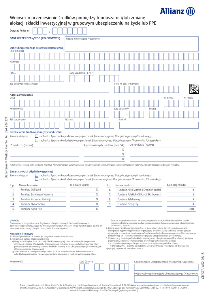 Wniosek o przeniesienie środków pomiędzy funduszami i/lub zmianę alokacji składki inwestycyjnej w grupowym ubezpieczeniu na życie lub PPE Dotyczy Polisy nr: / DANE UBEZPIECZAJĄCEGO (PRACODAWCY) Nazwa lub pieczątka Pracodawcy Dane Ubezpieczonego (Pracownika/Uczestnika) Imię (imiona) Nazwisko PESEL Data urodzenia (d-m-r) Typ dokumentu tożsamości Seria nr dok. tożsamości Adres zamieszkania Ulica Nr domu Miejscowość Kod pocztowy Nr lokalu Poczta Tel. stacjonarny Tel. kom. E-mail Przeniesienie środków pomiędzy funduszami Zmiana dotyczy: rachunku A/rachunku podstawowego (rachunek finansowany przez Ubezpieczającego (Pracodawcę)) rachunku B/rachunku dodatkowego (rachunek finansowany przez Ubezpieczonego (Pracownika /Uczestnika)) Z funduszu (nazwa) % przenoszonych środków (min. 5%) Do funduszu (nazwa) % % % Należy wybrać jedną z nazw funduszu: Akcji Plus, Aktywnej Alokacji, Dynamiczny, Akcji Małych i Średnich Spółek, Obligacji, Stabilnego Wzrostu, Selektywny, Polskich Obligacji Skarbowych, Pieniężny. Zmiana alokacji składki inwestycyjnej rachunku A/rachunku podstawowego (rachunek finansowany przez Ubezpieczającego (Pracodawcę)) Zmiana dotyczy: rachunku B/rachunku dodatkowego (rachunek finansowany przez Ubezpieczonego (Pracownika /Uczestnika)) L.p. Nazwa funduszu % alokacji składki L.p. % alokacji składki Nazwa funduszu 1. Fundusz Obligacji % 6. Fundusz Akcji Małych i Średnich Spółek % 2. Fundusz Stabilnego Wzrostu % 7. Fundusz Polskich Obligacji Skarbowych % 3. Fundusz Aktywnej Alokacji % 8. Fundusz Selektywny % 4. Fundusz Dynamiczny % 9. Fundusz Pieniężny % 5. Fundusz Akcja Plus % UWAGA: Oświadczam, iż otrzymałem treść Regulaminu Ubezpieczeniowych Funduszy Kapitałowych zatwierdzonego uchwałą Zarządu TU Allianz Życie Polska S.A. nr 83/2015 oraz wyrażam zgodę by miał on zastosowanie do umowy ubezpieczenia potwierdzonej w/w polisą. Klauzula informacyjna TU Allianz Życie Polska S.A. informuje, że zgodnie umową ubezpieczenia: 1. Przy zmianie alokacji składki inwestycyjnej: a) Nowy podział będzie dotyczył każdej składki inwestycyjnej, która zostanie wpłacona po dacie otrzymania wniosku. W przypadku braku wskazania rachunku, którego dotyczy dyspozycja, nowy podział zostanie zastosowany zarówno do składki płaconej przez Ubezpieczonego (Pracownika), jak i Ubezpieczającego (Pracodawcę). b) Suma wskazań w tabeli powinna być równa 100%. W przypadku braku wskazania funduszu cała składka przeznaczona na inwestycje zostanie alokowana w fundusz wybrany przez Allianz Miejscowość Data (d-m-r) 100% Życie. W przypadku wskazania nie sumującego się do 100%, nadmiar lub niedobór składki zostanie podzielony pomiędzy fundusze proporcjonalnie do wskazanego przez Ubezpieczonego (Pracownika) podziału. 2. Przeniesienie środków nastąpi najpoźniej w 5 dni roboczych od daty otrzymania poprawnie i kompletnie wypełnionego wniosku. W przypadku braku wskazania rachunku, którego dotyczy dyspozycja, przeniesienie będzie dotyczyć zarówno rachunku finansowanego przez Ubezpieczonego (Pracownika), jak i rachunku finansowanego przez Ubezpieczającego (Pracodawcę). 3. Zarówno przy zmianie podziału składki płaconej przez Ubezpieczającego (Pracodawcę), jak i przy przeniesieniu środków z finansowanego przez niego rachunku wymagane są: – w przypadku grupowego ubezpieczenia na życie – pisemna zgoda Pracodawcy, – w przypadku PPE – pisemne oświadczenie woli Uczestnika do Pracodawcy lub złożenie ww. dyspozycji za pośrednictwem Pracodawcy. Czytelny podpis Ubezpieczonego (Pracownika /Uczestnika) Podpis osoby reprezentującej Ubezpieczającego (Pracodawcy) Towarzystwo Ubezpieczeń Allianz Życie Polska Spółka Akcyjna z siedzibą w Warszawie, ul. Rodziny Hiszpańskich 1, 02-685 Warszawa, wpisana do rejestru przedsiębiorców prowadzonego przez Sąd Rejonowy dla m. st. Warszawy w Warszawie, XIII Wydział Gospodarczy Krajowego Rejestru Sądowego, pod numerem KRS: 0000021971, NIP 527-17-54-073, REGON 012634451, wysokość kapitału zakładowego: 118 630 000 złotych (wpłacony w całości). GRPSZA-W02 06/15 Departament Obsługi Klienta tel. 224 224 224 –