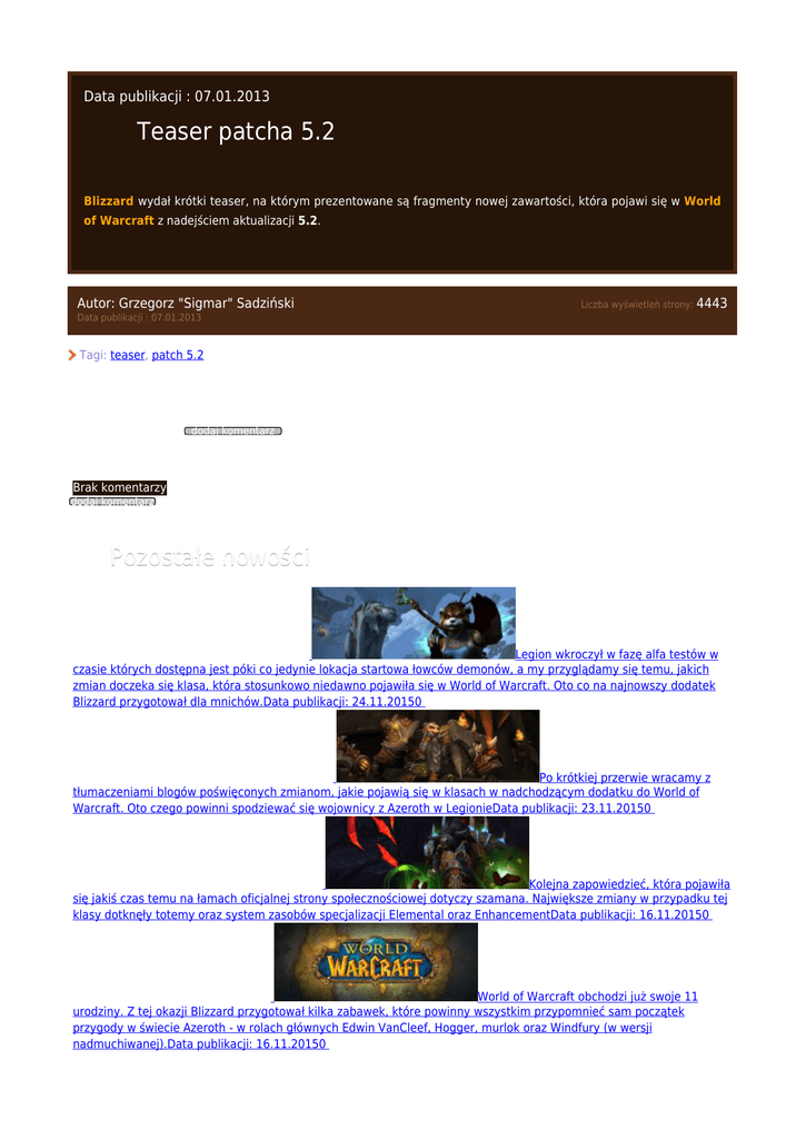 Data publikacji : 07.01.2013 Teaser patcha 5.2 Blizzard wydał krótki teaser, na którym prezentowane są fragmenty nowej zawartości, która pojawi się w World of Warcraft z nadejściem aktualizacji 5.2. Autor: Grzegorz "Sigmar" Sadziński Liczba wyświetleń strony: 4443 Data publikacji : 07.01.2013 Tagi: teaser, patch 5.2 Komentarz (0) dodaj komentarz Brak komentarzy dodaj komentarz Pozostałe nowości Zapowiedź zmian w klasach - Mnich Legion wkroczył w fazę alfa testów w czasie których dostępna jest póki co jedynie lokacja startowa łowców demonów, a my przyglądamy się temu, jakich zmian doczeka się klasa, która stosunkowo niedawno pojawiła się w World of Warcraft. Oto co na najnowszy dodatek Blizzard przygotował dla mnichów.Data publikacji: 24.11.20150 Zapowiedź zmian w klasach - Wojownik Po krótkiej przerwie wracamy z tłumaczeniami blogów poświęconych zmianom, jakie pojawią się w klasach w nadchodzącym dodatku do World of Warcraft. Oto czego powinni spodziewać się wojownicy z Azeroth w LegionieData publikacji: 23.11.20150 Zapowiedź zmian w klasach - Szaman Kolejna zapowiedzieć, która pojawiła się jakiś czas temu na łamach oficjalnej strony społecznościowej dotyczy szamana. Największe zmiany w przypadku tej klasy dotknęły totemy oraz system zasobów specjalizacji Elemental oraz EnhancementData publikacji: 16.11.20150 11 urodziny World of Warcraft World of Warcraft obchodzi już swoje 11 urodziny. Z tej okazji Blizzard przygotował kilka zabawek, które powinny wszystkim przypomnieć sam początek przygody w świecie Azeroth - w rolach głównych Edwin VanCleef, Hogger, murlok oraz Windfury (w wersji nadmuchiwanej).Data publikacji: 16.11.20150 Zapowiedź zmian w klasach - Rycerz śmierci Kolejna zapowiedź opublikowana na łamach oficjalnej strony społecznościowej World of Warcraft poświęcona jest klasie rycerzy śmierci. Poniżej znajdziecie informacje między innymi o ujednoliceniu wszystkich run oraz nowej umiejętności specjalizacji Blood, która została zainspirowana Lordem Marrowgarem z Icecrown Citadel.Data publikacji: 15.11.20150 Wszystkie nowości