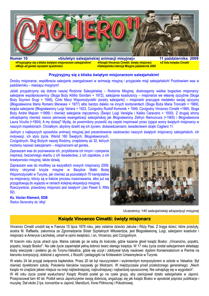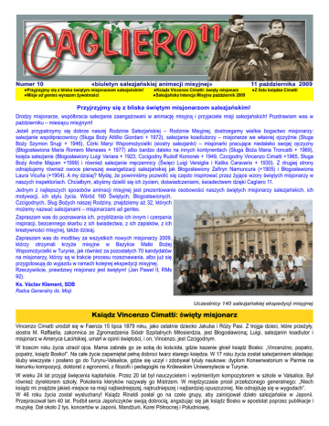 Numer 10 «biuletyn salezjańskiej animacji misyjnej» ♦Przyjrzyjmy się z bliska świętym misjonarzom salezjańskim! ♦Misje ad gentes wyrazem żywotności ♦Ksiądz Vincenzo Cimatti: święty misjonarz ♦Salezjańska Intencja Misyjna październik 2009 11 października 2009 ♦Z listu księdza Cimatti Przyjrzyjmy się z bliska świętym misjonarzom salezjańskim! Drodzy misjonarze, współbracia salezjanie zaangażowani w animację misyjną i przyjaciele misji salezjańskich! Pozdrawiam was w październiku – miesiącu misyjnym! Jeżeli przypatrzymy się dobrze naszej Rodzinie Salezjańskiej – Rodzinie Misyjnej, dostrzegamy wielkie bogactwo misjonarzy: salezjanie współpracownicy (Sługa Boży Attillio Giordani + 1972), salezjanie koadiutorzy – misjonarze we własnej ojczyźnie (Sługa Boży Szymon Srugi + 1946), Córki Maryi Wspomożycielki (siostry salezjanki) – misjonarki pracujące niedaleko swojej ojczyzny (Błogosławiona Maria Romero Meneses + 1977) albo bardzo daleko na innych kontynentach (Sługa Boża Maria Troncatti + 1969), księża salezjanie (Błogosławiony Luigi Variara + 1923, Czcigodny Rudolf Komorek + 1949, Czcigodny Vincenzo Cimatti +1965, Sługa Boży Andre Majcen +1999) i również salezjanie męczennicy (Święci Luigi Versiglia i Kaliks Caravario + 1930). Z drugiej strony odnajdujemy również owoce pierwszej ewangelizacji salezjańskiej jak Błogosławiony Zefiryn Namuncura (+1905) i Błogosławiona Laura Vicuña (+1904). A my dzisiaj? Myślę, że powinniśmy pozwolić się często inspirować przez żyjące wzory świętych misjonarzy w naszych inspektoriach. Chciałbym, abyśmy dzielili się ich życiem, doświadczeniami, świadectwem dzięki Cagliero 11. Jednym z najlepszych sposobów animacji misyjnej jest prezentowanie osobowości naszych świętych misjonarzy salezjańskich, ich motywacji, ich stylu życia. Wśród 160 Świętych, Błogosławionych, Czcigodnych, Sług Bożych naszej Rodziny, znajdziemy aż 32, których możemy nazwać salezjanami – misjonarzami ad gentes. Zapraszam was do poznawania ich, przybliżania ich innym i czerpania inspiracji, bezcennego skarbu z ich świadectwa, z ich zapisków, z ich kreatywności misyjnej, także dzisiaj. Zapraszam was do modlitwy za wszystkich nowych misjonarzy 2009, którzy otrzymali krzyże misyjne w Bazylice Matki Bożej Wspomożycielki w Turynie, jak również za pozostałych 70 kandydatów na misjonarzy, którzy są w trakcie procesu rozeznawania, albo już się przygotowują do wyjazdu w ramach kolejnej ekspedycji misyjnej. Rzeczywiście, prawdziwy misjonarz jest świętym! (Jan Pawel II, RMs 92). Ks. Václav Klement, SDB Radca Generalny ds. Misji Uczestnicy 140 salezjańskiej ekspedycji misyjnej Ksiądz Vincenzo Cimatti: święty misjonarz Vincenzo Cimatti urodził się w Faenza 15 lipca 1879 roku, jako ostatnie dziecko Jakuba i Róży Pasi. Z trojga dzieci, które przeżyły, siostra M. Raffaella, zakonnica ze Zgromadzenia Sióstr Szpitalnych Miłosierdzia, jest Błogosławioną; Luigi, salezjanin koadiutor i misjonarz w Ameryce Łacińskiej, umarł w opinii świętości, i on, Vincenzo, jest Czcigodnym. W trzecim roku życia utracił ojca. Mama zabrała go ze sobą do kościoła, gdzie kazanie głosił ksiądz Bosko: „Vincenzino, popatrz, popatrz, ksiądz Bosko!”. Na całe życie zapamiętał pełną dobroci twarz starego księdza. W 17 roku życia został salezjaninem składając śluby wieczyste i posłano go do Turynu-Valsalice, gdzie się uczył i zdobywał tytuły naukowe: dyplom Konserwatorium w Parmie na kierunku kompozycji, doktorat z agronomii, z filozofii i pedagogiki na Królewskim Uniwersytecie w Turynie. W wieku 24 lat przyjął święcenia kapłańskie. Przez 20 lat był nauczycielem i wyśmienitym kompozytorem w szkole w Valsalice. Był również dyrektorem szkoły. Pokolenia kleryków nazywały go Mistrzem. W międzyczasie prosił przełożonego generalnego: „Niech ksiądz mi znajdzie jakieś miejsce na misji najbiedniejszej, najtrudniejszej i najbardziej opuszczonej. Nie odnajduję się w wygodach”. W 46 roku życia został wysłuchany! Ksiądz Rinaldi posłał go na czele grupy, aby zainicjował dzieło salezjańskie w Japonii. Przepracował tam 40 lat. Podbił serca Japończyków swoją dobrocią, angażując się jak ksiądz Bosko w apostolat poprzez publikacje i muzykę. Dał około 2 tys. koncertów w Japonii, Mandżurii, Korei Północnej i Południowej. Przez trzy lata był dyrektorem pierwszego domu salezjańskiego w Miyazaki, potem został przełożonym rodzącej się Wizytatorii. Wiele podróżował, dodając nieustannie odwagi pierwszym salezjanom w Japonii, otwierając dzieła przede wszystkim dla odrzuconych i osieroconych chłopców. W 1935 roku został mianowany Prefektem Apostolskim, był nim do 1940 roku. Po trudnych latach wojny, pełnych niezliczonych ofiar, założył w Tokio „Miasto chłopców”, które poprzez szkoły podstawowe, średnie i zawodowe, w krótkim czasie przygarnęło 260 sierot. W 1949 roku, mając 70 lat, kończy obowiązek inspektora. Od 1952 roku, przez następne dziesięć lat, kontynuuje pracę jako dyrektor Studentatu filozofii i teologii w Chofu. Tutaj umiera, jak patriarcha, 6 października 1965 roku. Jego ciało – ekshumowane w 1977 roku i zachowane całkowicie nienaruszone – aktualnie spoczywa w krypcie w Chofu. Z listu księdza Cimatti do kleryka Luigi dal Fior (4 marca 1938) … Odwagi, mój Luigi: bądź szczodrym dla Pana, jeżeli chcesz, aby On był szczodrym dla ciebie. Całkowite oddanie: ciało i dusza: i z Księdzem Bosko, pracuj dla siebie i dla innych. Będę prosił, aby Jezus zachował cię swoim aż do końca; jak również, aby pomógł twojemu biednemu bratu, z którym, jak mi mówiłeś (również ksiądz Grigoletto mi o tym pisał), nie jest dobrze. Nie będę mógł być blisko ciebie, ale ty wiesz, że poprzez przyjaźń i modlitwę, będę bardziej niż blisko. Wszystkiego najlepszego i 