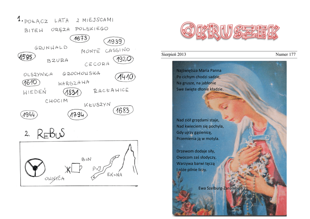Sierpień 2013 Numer 177 Najświętsza Maria Panna Po cichym chodzi sadzie, Na grusze, na jabłonie Swe święte dłonie kładzie. Nad ziół grzędami staje, Nad kwieciem się pochyla, Gdy ujrzy gąsienicę, Przemienia ją w motyla. Drzewom dodaje siły, Owocom zaś słodyczy, Warzywa barwi tęczą I róże pilnie liczy. Ewa Szelburg-Zarembina AKTUALNOŚCI 1 sierpnia – Narodowy Dzień Pamięci Powstania Warszawskiego. W tym dniu oddajemy hołd bohaterskim żołnierzom Warszawy, którzy stanęli do nierównej walki z hitlerowskim okupantem oraz ludności cywilnej, która pomagała powstańcom. 10 sierpnia –Dzień Przewodników i Ratowników Górskich Pamiętajmy, że nasza nierozwaga na górskich szlakach wystawia na niebezpieczeństwo nie tylko nas, ale niejednokrotnie tych ludzi, którzy spieszą nam z pomocą. 15 sierpnia – Wniebowzięcie Najświętszej Maryji Panny U nas nazywane świętem Matki Bożej Zielnej, z którym wiąże się bardzo piękna tradycja- uplecione z kwiatów, ziół i owoców wianki niesiemy do kościoła. Po powrocie zawieszamy je w domu by przyniosły pomyślność i szczęście na cały rok. 15 sierpnia – Świeto Wojska Polskiego Obchodzone na pamiatkę bitwy warszawskiej w 1920 roku. We wszystkich kościołach polowych odbywają się uroczyste Msze świete w intencji poległych na polu chwały. 26 sierpnia – Matki Bożej Częstochowskiej. Święta Maryja - modlitwy wysłucha, troski oddali i do serca przygarnie. 31 sierpnia – Dzień Solidarności i Wolności Dzień ten przypomina o strajkach z 1980 roku, które zapoczątkowały zmiany społeczne i gospodarcze w Polsce. Modlitwa: Boże, który wypełniłeś świętą Różę miłością do Ciebie, pozwoliłeś, aby opuściła świat i poświęciła się tylko Tobie, żyjąc surowo i pokutując, pomóż nam pójść w jej ślady na ziemi i cieszyć się obfitością Twoich rozkoszy w niebie. Amen. Świeta Róża z Limy ur.20.04.1589 w Limie (Peru) O G Ł O S Z E N I E zm.24.08.1617 w Limie Urodziła się jako Izabela Flores Oliva - dziesiąte z trzynaściorga dzieci hiszpańskiego szlachcica. Została nazwana Różą przez indiańską piastunkę dla podkreślenia jej niebywałej urody. Imię to otrzymała również na bierzmowaniu. Od najmłodszych lat odznaczała się pobożnością i pracowitością. Uczyła się sztuki haftu, troszczyła się o kwiaty w domowym ogródku. Kiedy rodzina zubożała na skutek kryzysu ekonomicznego krążyła po domach bogatych mieszkańców Limy i sprzedawała swoje hafty i kwiaty. W czasie tych wędrówek odkryła ubóstwo Indian, poniżanych i otoczonych pogardą. W wieku 20 lat została tercjanką dominikańską. Zamieszkała wtedy w letnim domku w ogrodzie swoich rodziców. Przez cały czas wykonywała prace ręczne, szyła i haftowała. Pielęgnowała obłożnie chorych, przyjmowała porzucone dzieci. Umarła w dniu, który sama przepowiedziała. Nasi księża należą do zgromadzenia Zakonnego Towarzystwa Chrystusowego dla Polonii Zagranicznej. 4 lipca 2013 roku Chrystusowcy zebrani na XII Kapitule Generalnej wybrali nowego przełożonego zgromadzenia. Został nim proboszcz Polskiej Misji Katolickiej w Braunschweigu ksiądz Ryszard Głowacki. W sztuce przedstawiana jako młoda dominikanka w habicie z Dzieciątkiem Jezus w ramionach lub krzyżem, z wiankiem róż na głowie. Jest patronką wszystkich prowincji, królestw, wysp i regionów kontynentu amerykańskiego, a także Filipin i Peru, miasta Limy, a także ogrodników i kwiaciarek. Wzywana do łagodzenia waśni rodzinnych. Jej święto obchodzimy 24 sierpnia. życzymy błogosławieństwa Bożego i nieustajacej pomocy Matki Bożej na czas sprawowania tego odpowiedzialnego stanowiska. BLASKI I CIENIE...............czyli co w historii drzemie ............. Legiony Polskie Naród polski nie pogodził się z utratą niepodległości. Wielu polskich patriotów pragnęło walczyć z zaborcami o wolność ojczyzny. W tym czasie we Francji wybuchła rewolucja przeciwko panowaniu i przywilejom arystokracji. Naród francuski obalił monarchię i uczynił swój kraj republiką. To uwikłało Francję w wojnę z kilkoma państwami, których władcy chcieli zdławić rewolucję - Austrią i Prusami, którzy byli także zaborcami Polski. Jedna z armii francuskich walczyła z wojskami austriackimi w północnych Włoszech. Dowodził nią i odnosił wiele zwycięstw młody i niezwykle utalentowany generał Napoleon Bonaparte. Na wieść o tych zwycięstwach do Bonapartego udali się polscy patrioci i uzyskali zgodę na utworzenie polskich oddziałów wojskowych, które będą walczyć u boku Francuzów. Oddziały te nazwano Legionami Polskimi, a na ich czele stanął generał Henryk Dąbrowski. Młodzi Polacy różnymi drogami przedostawali się do Włoch, by wstąpić do Legionów i walczyć o wolność. Legiony odznaczały się odwagą w bitwach, a żołnierze wierzyli, że powrócą do ojczyzny z bronią w ręku. W Legionach powstała wówczas patriotyczna pieśń, rozpoczynająca się od słów „Jeszcze Polska nie zginęła”. Jest ona do dziś polskim hymnem narodowym. Słowa do niej ułożył Józef Wybicki – oficer Legionów. Po zwycięskiej wojnie Francja zawarła pokój z Austrią, lecz w układzie nie było mowy o Polsce.