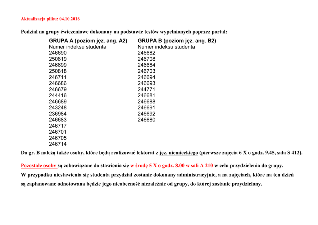 Aktualizacja pliku: 04.10.2016 Podział na grupy ćwiczeniowe dokonany na podstawie testów wypełnionych poprzez portal: GRUPA A (poziom jęz. ang. A2) Numer indeksu studenta 246690 250819 246699 250818 246711 246686 246679 244416 246689 243248 236984 246683 246717 246701 246705 246714 GRUPA B (poziom jęz. ang. B2) Numer indeksu studenta 246682 246708 246684 246703 246694 246693 244771 246681 246688 246691 246692 246680 Do gr. B należą także osoby, które będą realizować lektorat z jęz. niemieckiego (pierwsze zajęcia 6 X o godz. 9.45, sala S 412). Pozostałe osoby są zobowiązane do stawienia się w środę 5 X o godz. 8.00 w sali A 210 w celu przydzielenia do grupy. W przypadku niestawienia się studenta przydział zostanie dokonany administracyjnie, a na zajęciach, które na ten dzień są zaplanowane odnotowana będzie jego nieobecność niezależnie od grupy, do której zostanie przydzielony. Aktualizacja pliku: 4.10.2016 PRACA SOCJALNA PLAN ZAJĘĆ DYDAKTYCZNYCH – rok akademicki 2016/17 – semestr zimowy I rok studiów I stopnia – gr. A - podział na grupy – informacje na stronie wyżej! PONIEDZIAŁEK Lp Godz. WTOREK ŚRODA Godz. Godz. w dn.5,12,19,26 X, 9,16 XI w dn. 23,30 XI, 7,14,21 XII Wprow. do praktyk. Instytucjon. opieka i pomoc socj. sala A 210 Prawne aspekty pracy socj. i opiek. (ćw.) sala A 309 1. 8.0011.15 2. 3. 4. 5. 6. 7. 8. 9.4511.15 11.3013.00 JĘZ. ANG. / JĘZ. NIEM. 13.1514.45 9. 15.0010. 16.30 11.3013.00 do 20 XII Filozoficzne podstawy pracy socjalnej sala … 13.1514.45 do 20 XII Podstawy pedagogiki społ. i animacji sala … 11.4513.00 13.0014.00 do 4 I 2017 (z wył 2 XI) Biomedyczne aspekty rozwoju człowieka sala A 210 KONSULTACJE WYKŁADOWCÓW Wychowanie fizyczne CZWARTEK PIĄTEK Godz. Godz. 8.009.30 do 8 XII JĘZ. ANG. 9.4511.15 JĘZ. NIEM. 11.3013.00 do 8 XII Wprowadzenie do socjologii sala A 311 13.1515.45 Podstawy psychologii ogólnej i społecznej */ Wprow. do pracy socj. ** sala ….. w dn. 7,21 X, w dn. 2,9 XII, 4,18,25 XI 13,20,27 I Wprowadzenie do praktyk. Instytucj. opieka i pomoc socj. sala A 303 8.0011.15 11.3014.45 15.0016.30 Trening umiejętności interperson. sala A 303 12.15-14.45 JĘZ. ANG. Prawne aspekty pracy socjalnej i opiekuńczej (konwers.) sala A 311 11. 16.4512. 18.15 Filozoficzne podstawy pracy socjalnej – dr M. Boryczko– wykł. 20 godz. Wprowadzenie do socjologii – prof. UG, dr hab. P. Czekanowski – wykł. 20 godz. Biomedyczne aspekty rozwoju człowieka – prof. UG, dr hab. J. Wojciechowska– wykł. 20 godz. . Podstawy psychologii ogólnej i społecznej – dr A. Peplińska – wykł. 20 godz. *w dniach: Podstawy pedagogiki społecznej i animacji – dr B. Kosmalska – wykł. 20 godz. Prawne aspekty pracy socjalnej i opiekuńczej – mgr A. Lisowski konwersatorium 20 godz. + dr M. Szpunar ćw. 20 godz. Wprowadzenie do pracy socjalnej – dr M. Szpunar – wykł. 20 godz. **w dniach: Trening umiejętności interpersonalnych - ćw. 20 godz. – gr. A - mgr N. Pęcherzewska Wprowadzenie do praktyk. Instytucjonalna opieka i pomoc socjalna – dr D. Jaworska – ćw. 45 godz. pierwsze spotkanie na miejscu, pozostałe - wyjścia do placówek Język obcy – 60 godz. Wychowanie fizyczne – 30 godz. – zapisy prowadzi on-line Studium Wychowania Fizycznego i Sportu UG Plany zajęć mogą ulegać zmianom. Konieczne jest bieżące sprawdzanie aktualnego pliku. Sporządziła: mgr Karolina Malenda-Raszkiewicz [email protected] Aktualizacja pliku: 4.10.2016 PRACA SOCJALNA PLAN ZAJĘĆ DYDAKTYCZNYCH – rok akademicki 2016/17 – semestr zimowy I rok studiów I stopnia – gr. B - podział na grupy – informacje na stronie wyżej! PONIEDZIAŁEK Lp Godz. WTOREK ŚRODA Godz. Godz. w dn.12,19,26 X, 9,16 XI 1. 8.0011.15 2. 3. 4. 5. 6. 7. 8. 11.3013.00 JĘZ. ANG. / JĘZ. NIEM. 13.1514.45 9. 15.0010. 16.30 11.3013.00 13.1514.45 do 20 XII Filozoficzne podstawy pracy socjalnej sala do 20 XII Podstawy pedagogiki społ. i animacji sala 11.4513.00 13.0014.00 Prawne aspekty pracy socj. i opiek. (ćw.) sala A 309 CZWARTEK PIĄTEK w dn. 23,30 XI, 7,14,21 XII, 4 I Godz. Godz. Wprow. do praktyk. Instytucjon. opieka i pomoc socj. Sala A 210 8.009.30 od 5 X 2016 do 4 I 2017 (z wył 2 XI) Biomedyczne aspekty rozwoju człowieka sala A 210 KONSULTACJE WYKŁADOWCÓW Wychowanie fizyczne od 15 XII JĘZ. ANG. 9.4511.15 JĘZ. NIEM. 11.3013.00 do 8 XII Wprowadzenie do socjologii sala A 311 13.1515.45 Podstawy psychologii ogólnej i społecznej / Wprow. do pracy socj. * sala ….. 8.0011.15 12.1514.45 15.0016.30 w dn. 7,21 X, w dn. 2,9 XII, 4,18,25 XI 13,20,27 I Wprowadzeni e do praktyk. Instytucj. opieka i pomoc socj. sala A 303 JĘZ. ANG. 11.30-14.45 Trening umiejętności interperson. sala A 303 Prawne aspekty pracy socjalnej i opiekuńczej (konwers.) sala A 311 11. 16.4512. 18.15 Filozoficzne podstawy pracy socjalnej – dr M. Boryczko– wykł. 20 godz. Wprowadzenie do socjologii – prof. UG, dr hab. P. Czekanowski – wykł. 20 godz. Biomedyczne aspekty rozwoju człowieka – prof. UG, dr hab. J. Wojciechowska– wykł. 20 godz. . Podstawy psychologii ogólnej i społecznej – dr A. Peplińska – wykł. 20 godz. *w dniach: Podstawy pedagogiki społecznej i animacji – dr B. Kosmalska – wykł. 20 godz. Prawne aspekty pracy socjalnej i opiekuńczej – mgr A. Lisowski konwersatorium 20 godz. + dr M. Szpunar ćw. 20 godz. Wprowadzenie do pracy socjalnej – dr M. Szpunar – wykł. 20 godz. *w dniach: Trening umiejętności interpersonalnych - ćw. 20 godz. – gr. A - mgr N. Pęcherzewska Wprowadzenie do praktyk. Instytucjonalna opieka i pomoc socjalna – dr D. Jaworska – ćw. 45 godz. pierwsze spotkanie na miejscu, pozostałe - wyjścia do placówek Język obcy – 60 godz. Wychowanie fizyczne – 30 godz. – zapisy prowadzi on-line Studium Wychowania Fizycznego i Sportu UG Plany zajęć mogą ulegać zmianom. Konieczne jest bieżące sprawdzanie aktualnego pliku. Sporządziła: mgr Karolina Malenda-Raszkiewicz [email protected