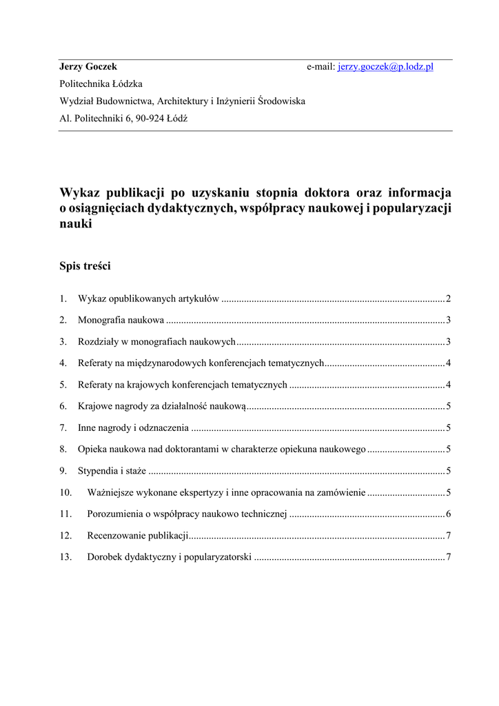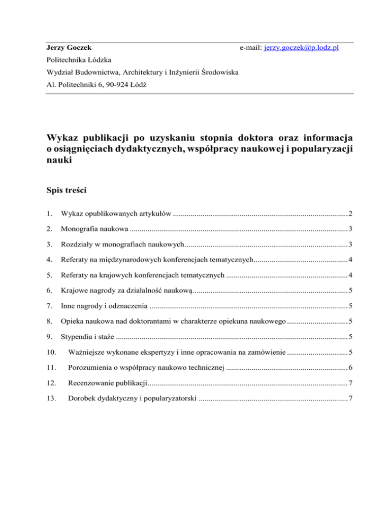 Jerzy Goczek e-mail: [email protected] Politechnika Łódzka Wydział Budownictwa, Architektury i Inżynierii Środowiska Al. Politechniki 6, 90-924 Łódź Wykaz publikacji po uzyskaniu stopnia doktora oraz informacja o osiągnięciach dydaktycznych, współpracy naukowej i popularyzacji nauki Spis treści 1. Wykaz opublikowanych artykułów ......................................................................................... 2 2. Monografia naukowa ............................................................................................................... 3 3. Rozdziały w monografiach naukowych ................................................................................... 3 4. Referaty na międzynarodowych konferencjach tematycznych ................................................ 4 5. Referaty na krajowych konferencjach tematycznych .............................................................. 4 6. Krajowe nagrody za działalność naukową ............................................................................... 5 7. Inne nagrody i odznaczenia ..................................................................................................... 5 8. Opieka naukowa nad doktorantami w charakterze opiekuna naukowego ............................... 5 9. Stypendia i staże ...................................................................................................................... 5 10. Ważniejsze wykonane ekspertyzy i inne opracowania na zamówienie ............................... 5 11. Porozumienia o współpracy naukowo technicznej .............................................................. 6 12. Recenzowanie publikacji...................................................................................................... 7 13. Dorobek dydaktyczny i popularyzatorski ............................................................................ 7 1. Wykaz opublikowanych artykułów Goczek J. (50%)1, Supeł Ł.: A method of predicting the flexural response of RHS beams 1.1. in the post-buckling state. Archives of Civil and Mechanical Engineering (25 pkt. MNiSW, Impact Factor 1,793), (Under Review). Gajdzicki M., Goczek J. (50%)2: Influence of sheet-to-purlin fastener properties on the 1.2. rotational restraint of cold-formed Z-purlins. Engineering Structures (40 pkt. MNiSW, Impact Factor 1,838), (Under Review). Gajdzicki M., Goczek J. (50%)3: Numerical determination of rotational restraint 1.3. of cold-formed Z-purlin according to EC3. International Journal of Steel Structures (20 pkt. MNiSW, Impact Factor 0,505), 15(3) 2015, 633-645. Goczek J. (50%)4, Supeł Ł.: Resistance of steel cross-sections subjected to bending 1.4. shear and axial forces. Engineering Structures (40 pkt. MNiSW, Impact Factor 1,838, SNIP 2014 2,396), 2014, vol. 70, 271-277. Goczek J. (40%)5, Supeł Ł., Gajdzicki M.: Wyznaczanie sprężystego momentu 1.5. krytycznego zwichrzenia belki bocznie stężonej jednostronnym poszyciem. Inżynieria i Budownictwo (4 pkt. MNiSW), nr 10/2012, 552-554. Goczek J. (50%)6, Supeł Ł.: Obliczanie charakterystyk współpracującego przekroju 1.6. zetownika giętego według PN-EN 1993-1-3. „Inżynieria i Budownictwo” (4 pkt. MNiSW), nr 8/2009, 459-463. Goczek J. (50%)7, Supeł Ł.: Oddziaływanie pionowego stężenia rygla pełnościennego 1.7. na ramę płaską. Zeszyty Naukowe Politechniki Łódzkiej (2 pkt. MNiSW), z. 57. 2008, 39-59. Goczek J. (40%)8, Supeł Ł., Gajdzicki M.: Reakcje boczne płatwi z kształtowników 1.8. giętych, Inżynieria i Budownictwo (4 pkt. MNiSW), nr 3/2008, 156-159. 1 Opracowanie metodyki analizy, jej opis, ocena otrzymanych wyników, sformułowanie wniosków. Sformułowanie celu badania numerycznego, wybór parametrów, współudział w interpretacji wyników i formułowaniu wniosków. 3 Sformułowanie celu badania numerycznego, opis badania, współudział w interpretacji wyników i formułowaniu wniosków. 4 Pomysł uzupełnienia przepisów normowych o brakujące zapisy, ich sformułowanie, opis, współudział w sformułowaniu wniosków. 5 Wskazanie celu, postawienie tezy, współudział w interpretacji wyników i sformułowaniu wniosków. 6 Wskazanie potrzeby publikacji, nadzór nad zgodnością opisywanego algorytmu z zapisami normowymi, opis algorytmu. 7 Wskazanie celu, postawienie tezy, współudział w interpretacji wyników i sformułowaniu wniosków. 8 Wskazanie celu, analiza porównawcza modeli numerycznych, współudział w interpretacji wyników i sformułowaniu wniosków. 2 2 1.9. Goczek J. (50%)9, Supeł Ł.: Niestateczność dystorsyjna belek z kształtowników giętych o stopkach z usztywnieniami brzegowymi, Inżynieria i Budownictwo (4 pkt. MNiSW), nr 4/2007, 206-209. 1.10. Goczek J. (50%)10, Supeł Ł.: Modelowanie płatwi stężającej ramę główną hali stalowej. Inżynieria i Budownictwo (4 pkt. MNiSW), nr 11/2006, 616-619. 1.11. Goczek J. (70%)11, Juchniewicz J.: Wpływ podatności podpór na ocenę nośności płatwi ciągłych z kształtowników giętych na zimno. „Inżynieria i Budownictwo” (4 pkt. MNiSW), nr 10/2003, 573-576. 1.12. Goczek J. (70%)12, Juchniewicz J.: Ocena przyczyn awarii stalowej hali magazynowej. „Inżynieria i Budownictwo” (4 pkt. MNiSW), nr 4/2003, 194-196. 1.13. Dauksza A., Goczek J. (40%)13, Łukowiak M.: Związki pomiędzy odkształceniami a siłami wewnętrznymi dla płaskownika stalowego z naprężeniami walcowniczymi. Zeszyty Naukowe Politechniki Łódzkiej (2 pkt. MNiSW), z.43, 1994, 123-137. 1.14. Goczek J. (100%): Wpływ niestateczności miejscowej na stan graniczny pręta cienkościennego o zamkniętym przekroju prostokątnym ściskanego i zginanego. Zeszyty Naukowe Politechniki Łódzkiej (2 pkt. MNiSW), z. 39, 1988, 117-129. 2. Monografia naukowa Goczek J.: Belki z kształtowników giętych stężone poszyciem z blach fałdowych. Monografia. Wydawnictwo Politechniki Łódzkiej, Łódź 2013 (20 pkt. MNiSW). 3. Rozdziały w monografiach naukowych 3.1. 