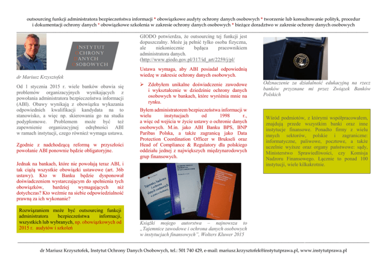 outsourcing funkcji administratora bezpieczeństwa informacji * obowiązkowe audyty ochrony danych osobowych * tworzenie lub konsultowanie polityk, procedur i dokumentacji ochrony danych * obowiązkowe szkolenia w zakresie ochrony danych osobowych * bieżące doradztwo w zakresie ochrony danych osobowych _________________________________________________________________________________________________________________________________________________________ GIODO potwierdza, że outsourcing tej funkcji jest dopuszczalny. Może ją pełnić tylko osoba fizyczna, ale niekoniecznie będąca pracownikiem administratora danych. (http://www.giodo.gov.pl/317/id_art/2259/j/pl/ dr Mariusz Krzysztofek Od 1 stycznia 2015 r. wiele banków obawia się problemów organizacyjnych wynikających z powołania administratora bezpieczeństwa informacji (ABI). Obawy wynikają z obowiązku wykazania odpowiednich kwalifikacji kandydata na to stanowisko, a więc np. skierowania go na studia podyplomowe. Problemem może być też zapewnienie organizacyjnej odrębności ABI w ramach instytucji, czego również wymaga ustawa. Zgodnie z nadchodzącą reformą w przyszłości powołanie ABI ponownie będzie obligatoryjne. Ustawa wymaga, aby ABI posiadał odpowiednią wiedzę w zakresie ochrony danych osobowych. Zdobyłem unikalne doświadczenie zawodowe i wykształcenie w dziedzinie ochrony danych osobowych w bankach, które wyróżnia mnie na rynku. Byłem administratorem bezpieczeństwa informacji w wielu instytucjach od 1998 r., a więc od wejścia w życie ustawy o ochronie danych osobowych. M.in. jako ABI Banku BPS, BNP Paribas Polska, a także zagranicą jako Data Protection Coordination Officer w Brukseli oraz Head of Compliance & Regulatory dla polskiego oddziału jednej z największych międzynarodowych grup finansowych. Jednak na bankach, które nie powołają teraz ABI, i tak ciążą wszystkie obowiązki ustawowe (art. 36b ustawy). Kto w Banku będzie dysponował doświadczeniem wystarczającym do spełnienia tych obowiązków, bardziej wymagających niż dotychczas? Kto weźmie na siebie odpowiedzialność prawną za ich wykonanie? Rozwiązaniem może być outsourcing funkcji administratora bezpieczeństwa informacji, wszystkich lub wybranych, np. obowiązkowych od 2015 r. audytów i szkoleń Odznaczenie za działalność edukacyjną na rzecz banków przyznane mi przez Związek Banków Polskich Wśród podmiotów, z którymi współpracowałem, znajdują przede wszystkim banki oraz inne instytucje finansowe. Ponadto firmy z wielu innych sektorów, polskie i zagraniczne: informatyczne, paliwowe, pocztowe, a także uczelnie wyższe oraz organy państwowe: sądy, Ministerstwo Sprawiedliwości, czy Komisja Nadzoru Finansowego. Łącznie to ponad 100 instytucji, wiele kilkakrotnie. Książki mojego autorstwa – najnowsza to „Tajemnice zawodowe i ochrona danych osobowych w instytucjach finansowych”, Wolters Kluwer 2015 _________________________________________________________________________________________________________________________________________________________ dr Mariusz Krzysztofek, Instytut Ochrony Danych Osobowych, tel.: 501 740 429, e-mail: [email protected], www.instytutprawa.pl outsourcing funkcji administratora bezpieczeństwa informacji * obowiązkowe audyty ochrony danych osobowych * tworzenie lub konsultowanie polityk, procedur i dokumentacji ochrony danych * obowiązkowe szkolenia w zakresie ochrony danych osobowych * bieżące doradztwo w zakresie ochrony danych osobowych _________________________________________________________________________________________________________________________________________________________ Proponuję Państwu powierzenie mi obowiązków administratora bezpieczeństwa informacji w Państwa Banku. To forma, która umożliwi zapewnienie zgodności z prawem w tym obszarze, bez konieczności spełniania skomplikowanych wymagań dotyczących tego stanowiska i bez etatu. Podejmę się pełnienia tej funkcji w całości lub w wybranym przez Państwa zakresie. Wykonam obowiązki Banku takie, jak: obowiązkowe okresowe audyty ochrony danych, które wymagają udokumentowania i sprawozdania dla Zarządu Banku Od 1 stycznia 2015 r. należy przeprowadzić co najmniej jeden planowy audyt ochrony danych rocznie. Ponadto audyt doraźny w przypadku podejrzenia naruszenia. Rozporządzenie Ministra Administracji i Cyfryzacji określa zakres tej obowiązkowej weryfikacji i sprawozdania. Przeprowadziłem wiele audytów ochrony danych osobowych w instytucjach finansowych. obowiązkową dokumentację przetwarzania danych (polityki, instrukcje) zapewnienie prawidłowości prowadzenie marketingu opracowanie klauzul zgody i klauzul informacyjnych rejestrację zbiorów danych upoważnienia dla pracowników i ewidencję osób upoważnionych nadzór nad zasadami adekwatności danych, ograniczenia czasowego i innymi zapewnienie prawidłowości zabezpieczeń danych osobowych zapewnienie zgodności umowom outsourcingu, opiniowanie takich umów doraźne opiniowanie i pomoc w razie wątpliwości lub problemów dotyczących ochrony danych i tajemnicy bankowej opiniowanie udzielania uprawnionym organom informacji o klientach zgodnie z przepisami o tajemnicy bankowej reprezentowanie Banku przed GIODO (w tym korespondencja), KNF i audytorami, w razie skargi klienta lub audytu help desk – pomoc (e-mailowo lub telefoniczne) w razie wątpliwości lub problemów dotyczących ochrony danych osobowych i tajemnicy bankowej, np. określoną liczbę odpowiedzi na bieżące pytania dotyczące ujawniania tajemnicy bankowej na wniosek uprawnionych organów, czy skarg klientów Należy również pamiętać o nadchodzącej reformie ochrony danych osobowych, która zostanie uchwalona w 2016 r. Wprowadzi wiele nowych obowiązków. Będzie wymagała analiz i dostosowania działalności. Jedno z moich wystąpień w TV na temat ochrony informacji w bankach Stopień doktora nauk prawnych uzyskałem właśni