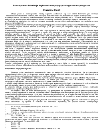 Przestępczość i dewiacja. Wybrane koncepcje psychologiczno- socjologiczne Magdalena Ciołak Chcąc pisać o przestępczości należy najpierw zastanowić się nad takimi terminami jak dewiacja i niedostosowanie społeczne. Pozwolą nam one lepiej zrozumieć wcale nie jednoznaczne pojęcie przestępczości. W pewnym sensie, choć nie był on kryminologiem, prekursorem socjologii dewiacji był E. Durkheim, który stanął na czele 1 trzech nurtów teoretycznych tejże dziedziny. Przyjął on bowiem koncepcję „pożytków z dewiacji” zakładając, że : a) „Dewiacja jest zjawiskiem normalnym, ponieważ występuje we wszystkich społeczeństwach, bez względu na ramy czasowe i przestrzenne”. b) „Dewiacja jest zjawiskiem normalnym ze statystycznego punktu widzenia przez swą powszechność występowania”. c) „Dewiacja stanowi czynnik zdrowia publicznego (i w tym sensie jest integralną częścią wszelkiego zdrowego społeczeństwa)”. 2 Współcześnie dewiację można definiować jako „nieprzestrzeganie zespołu norm przyjętych przez członków danej społeczności lub społeczeństwa”3. Normy zaś to reguły, które zawierają w sobie wartości danej kultury. To one wspólnie kształtują sposób, w jaki mają zachowywać się uczestnicy kultury, czyli jednostki. Nie należy jednak dzielić społeczeństwa na tych, którzy przestrzegają normy i tych, którzy tego nie robią. Każdy z nas czasami przekracza pewne 4 ogólnie przyjęte normy, czy sprzeciwia się ogólnie przyjętym wartościom. Przykładem może być przekraczanie ograniczenia prędkości jadąc samochodem, czy przechodzenie na czerwonym świetle. Termin dewiacji obejmuje wiele zachowań, które nie są prawnie sankcjonowane (np. naturyzm, czy subkultury dewiacyjne). Zdecydowanie są to odbiegające od społecznie wytworzonych norm zachowania, ale nie jest to postępowanie nonkonformistyczne, które jest 5 jednoznaczne ze złamaniem prawa. Podobnie niejednoznacznie określane jest w literaturze przedmiotu pojęcie niedostosowania społecznego. Zazębia się ono także z pojęciem normy.6 Większość definicji i ujęć teoretycznych zjawiska niedostosowania społecznego wykorzystuje wskazane kryteria normalności traktując je jako kategorię zjawisk, które wykraczają poza dopuszczalne granice akceptacji. Chcąc zrozumieć pojęcie niedostosowania społecznego w literaturze podaje się definicje przystosowania. Jest to „bezkonfliktowe funkcjonowanie w otoczeniu społecznym”, albo „bezkonfliktowe uczestnictwo w grupach społecznych”.7 Ujmowane jest to także jako „równowaga między wymaganiami środowiska społecznego i życia codziennego a sposobem postępowania jednostki”8, lub w socjologiczny sposób przez F. Znanieckiego jako interakcyjny „proces przystosowania, określając je jako proces adaptacji społecznej, w którym celem jest przystosowanie jednostki do społeczności ludzkiej i do pełnego uczestnictwa w jej życiu”.9 Powyżej zdefiniowane terminy wskazują na nieprzestrzeganie norm, które to mogą prowadzić do popełniania przestępstwa. Ukazują także zjawisko odchylenia od społeczeństwa w niesankcjonowany prawnie sposób. Interpretacje biopsychologiczne Pierwsze próby wyjaśniania przestępczości miały w większości charakter biologiczny. Są to interpretacje najdawniejsze i głównie już nie brane pod uwagę przez badaczy, niemniej warto o nich wspomnieć, gdyż łączyły one także interpretacje psychologiczne. Ich głównymi założeniami były: a) „decydujący wpływ na zachowanie człowieka wywierają cechy pozwalające traktować go jako odrębne indywiduum b) niektóre z tych cech- dziedziczone, wrodzone, lub nabyte (np. w wyniku urazu lub choroby)- tworzą podłoże sprzyjające powstawaniu zachowań antyspołecznych (społecznie szkodliwych) c) można ustalić jakie cechy wywołują tendencję do zachowań antyspołecznych (bądź przestępczych), czyli możliwe jest wykrycie związku przyczynowego między określoną cechą (zespołem cech) a określonym zachowaniem d) ustalenie takiego związku jest jednoznaczne z ustaleniem przyczyn przestępczości, co otwiera możliwości skutecznemu zapobieganiu tego zjawiska”.10 W związku z tym, że teorie antropologiczne, czy genetyczne nie są brane pod uwagę przez współczesnych badaczy skupię się jedynie na teoriach psychologicznych. Podobnie jak interpretacje biologiczne, psychologiczne ujęcia powstawania przestępstw poszukują źródeł jego powstawania w jednostce a nie w społeczeństwie. Różniącym jest fakt, że podczas gdy biologiczne ujęcia opierają się na cechach fizycznych, tak perspektywy psychologiczne zajmują się typami osobowości. Przedstawiciele nurtu „pewnych specyficznych cech osobowości” zajmują się głównie badaniami nad tym jakie cechy osobowości są ujemne w skutkach dla człowieka. Wyróżniają oni pojęcie dziecka przestępczego 1 Por, B.Hołyst, Socjologia kryminalistyczna, Warszawa 2007, s. 952. Tamże, s. 952. 3 A. Giddens, Socjologia, Warszawa 2004, s. 224. 4 Wartości to „ abstrakcyjne idee, które dają ludziom poczucie sensu i są dla nich drogowskazem w interakcjach ze światem społecznym”. Tamże, s. 46. 5 Por, A. Giddens, op. cit., s.224-225. 6 Definicje norm, które mają znaczenie dla określenia pojęcia niedostosowania społecznego, mogą mieć charakter statystyczno- psychometryczny, kulturalistyczny, psychiatryczny, pedagogiczny, psychologiczny, etyczny oraz religijny. E. Wysoka, Diagnoza w resocjalizacji, Warszawa 2009, s. 21. 7 Tamże, s. 22. 8 Tamże, s. 22. 9 Tamże, s. 22. 10 J.Błachut, A.Gaberle, K.Krajewski, Kryminologia, Gdańsk 2001, s. 89. 2 i nieprzestępczego. To pierwsze posiada cechy, które prowadzą je do popełnienia przestępstwa (impulsywność, wybuchowość, drażliwość, brutalność, skłonność do zachowania agresywnego). Z kolei u dziecka nieprzestępczego nie 11 zauważa się takich cech, albo jest ich bar