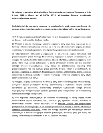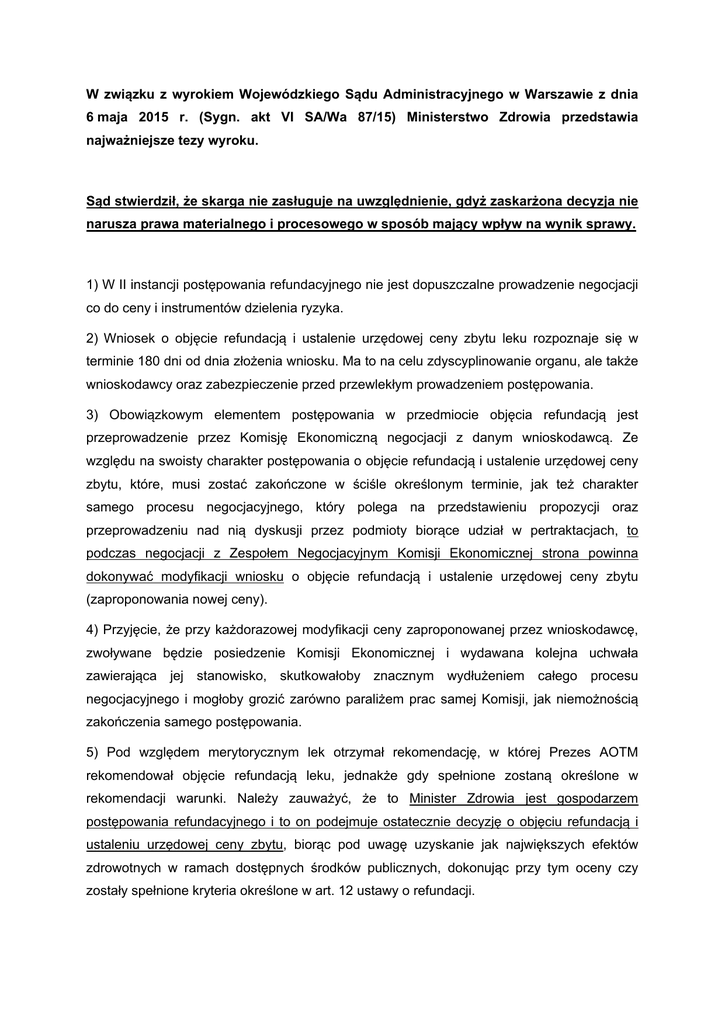 W związku z wyrokiem Wojewódzkiego Sądu Administracyjnego w Warszawie z dnia 6 maja 2015 r. (Sygn. akt VI SA/Wa 87/15) Ministerstwo Zdrowia przedstawia najważniejsze tezy wyroku. Sąd stwierdził, że skarga nie zasługuje na uwzględnienie, gdyż zaskarżona decyzja nie narusza prawa materialnego i procesowego w sposób mający wpływ na wynik sprawy. 1) W II instancji postępowania refundacyjnego nie jest dopuszczalne prowadzenie negocjacji co do ceny i instrumentów dzielenia ryzyka. 2) Wniosek o objęcie refundacją i ustalenie urzędowej ceny zbytu leku rozpoznaje się w terminie 180 dni od dnia złożenia wniosku. Ma to na celu zdyscyplinowanie organu, ale także wnioskodawcy oraz zabezpieczenie przed przewlekłym prowadzeniem postępowania. 3) Obowiązkowym elementem postępowania w przedmiocie objęcia refundacją jest przeprowadzenie przez Komisję Ekonomiczną negocjacji z danym wnioskodawcą. Ze względu na swoisty charakter postępowania o objęcie refundacją i ustalenie urzędowej ceny zbytu, które, musi zostać zakończone w ściśle określonym terminie, jak też charakter samego procesu negocjacyjnego, który polega na przedstawieniu propozycji oraz przeprowadzeniu nad nią dyskusji przez podmioty biorące udział w pertraktacjach, to podczas negocjacji z Zespołem Negocjacyjnym Komisji Ekonomicznej strona powinna dokonywać modyfikacji wniosku o objęcie refundacją i ustalenie urzędowej ceny zbytu (zaproponowania nowej ceny). 4) Przyjęcie, że przy każdorazowej modyfikacji ceny zaproponowanej przez wnioskodawcę, zwoływane będzie posiedzenie Komisji Ekonomicznej i wydawana kolejna uchwała zawierająca jej stanowisko, skutkowałoby znacznym wydłużeniem całego procesu negocjacyjnego i mogłoby grozić zarówno paraliżem prac samej Komisji, jak niemożnością zakończenia samego postępowania. 5) Pod względem merytorycznym lek otrzymał rekomendację, w której Prezes AOTM rekomendował objęcie refundacją leku, jednakże gdy spełnione zostaną określone w rekomendacji warunki. Należy zauważyć, że to Minister Zdrowia jest gospodarzem postępowania refundacyjnego i to on podejmuje ostatecznie decyzję o objęciu refundacją i ustaleniu urzędowej ceny zbytu, biorąc pod uwagę uzyskanie jak największych efektów zdrowotnych w ramach dostępnych środków publicznych, dokonując przy tym oceny czy zostały spełnione kryteria określone w art. 12 ustawy o refundacji. To Minister Zdrowia ustala dla danego leku urzędowa cenę zbytu i zwraca się z prośbą do Prezesa AOTM o dokonanie pogłębionej i szczegółowej weryfikacji analizy ekonomicznej załączonej do wniosku o objęcie refundacją leku. 6) Modyfikowanie wniosku w szerokim zakresie w końcowej fazie postępowania należy uznać za niedopuszczalną jako spóźnioną, a brak wzięcia pod uwagę przez Ministra Zdrowia kolejnych propozycji cenowych należy uznać, w kontekście charakteru postępowania refundacyjnego, za zgodny z przepisem art. 7, 8, 10 § 1, 77 § 1, 80 i 107 § 3 Kpa. Nie zmienia tego faktu specyfika tego postępowania, która z jednej strony nakazuje uzyskać najlepsze osiągnięcia, ale z drugiej strony ogranicza organ i stronę postępowania terminem opisanym w art. 31 ust. 5 ustawy o refundacji. 7) Dokonywanie modyfikacji wniosku o objęcie refundacją i ustalenie urzędowej ceny zbytu na etapie postępowania drugoinstancyjnego (po złożeniu wniosku o ponowne rozpatrzenie sprawy) związane jest z problemem zakresu nowości dopuszczalnych na etapie postępowania odwoławczego. Zasadne jest twierdzenie, że istnieje konieczność zapewnienia tożsamego zakresu rozpoznania w I i II instancji i w konsekwencji rozstrzygnięcia sprawy. Sprawa rozstrzygana w postępowaniu odwoławczym powinna być tożsama ze sprawą rozpatrzoną przez organ I instancji. Zmiana na etapie postępowania odwoławczego wniosku o objęcie refundacją i ustalenie urzędowej ceny zbytu jest pojawieniem się nowości w zakresie podstawowych elementów danego wniosku, co skutkuje powstaniem braku tożsamości przedmiotowej. 8) Organ prawidłowo uznał, że Komisja Ekonomiczna nie jest zobowiązana do sporządzania uzasadnienia podjętej uchwały. Komisja Ekonomiczna nie może zostać uznana za organ administracji w znaczeniu funkcjonalnym, gdyż stanowisko które przyjmuje w drodze uchwały jest tylko i wyłącznie jednym z kryteriów służących do wydania decyzji w przedmiocie objęcia refundacją. Charakter prawny Komisji Ekonomicznej jako organu doradczego został wskazany wyrokiem Wojewódzkiego Sądu Administracyjnego w Warszawie z 5 marca 2013 r., sygn. akt VI SA/Wa 2172/12, w którym to Sąd umiejscowił zespół negocjacyjny Komisji Ekonomicznej w postępowaniu refundacyjnym, wskazując, że „Zespół Negocjacyjny Komisji Ekonomicznej nie jest organem administracji publicznej, nie posiada kompetencji do wydawania decyzji administracyjnych jest jedynie organem doradczym działającym na podstawie wystawy o refundacji”. 9) Ustawodawca w sposób jednoznaczny zidentyfikował pojęcie Komisji Ekonomicznej, a mianowicie jako ciała kolegialnego. Także podejmowanie uchwały Komisji Ekonomicznej w składzie innym niż 5 - osobowy skład negocjujący z Wnioskodawcą nie stanowi naruszenia przepisów ustawy refundacyjnej. 10) Naruszenie obowiązku założenia i prowadzenia oraz aktualizacji metryki nie stanowi naruszenia przepisów postępowania, które mogłoby mieć wpływ na jego wynik (art. 138 § 2) albo wznowienia postępowania (art.145) (Komentarz A. Wróbel Komentarz aktualizowany do art. 66a Kpa, stan prawy na 22 lipca 2014 r.). Metryka sprawy nie stanowi kluczowego dokumentu sprawy. 11) Strona musi uprawdopodobnić, że notatki służbowe wytworzone w sprawie, jak również wyliczenia i kalkulacje, jak i korespondencja, które to dokumenty nie zostały udostępnione, zostały w ogóle sporządzone. Przedmiotowy wyrok jest prawomocny i potwierdza prawidłowość dotychczasowej praktyki Mi