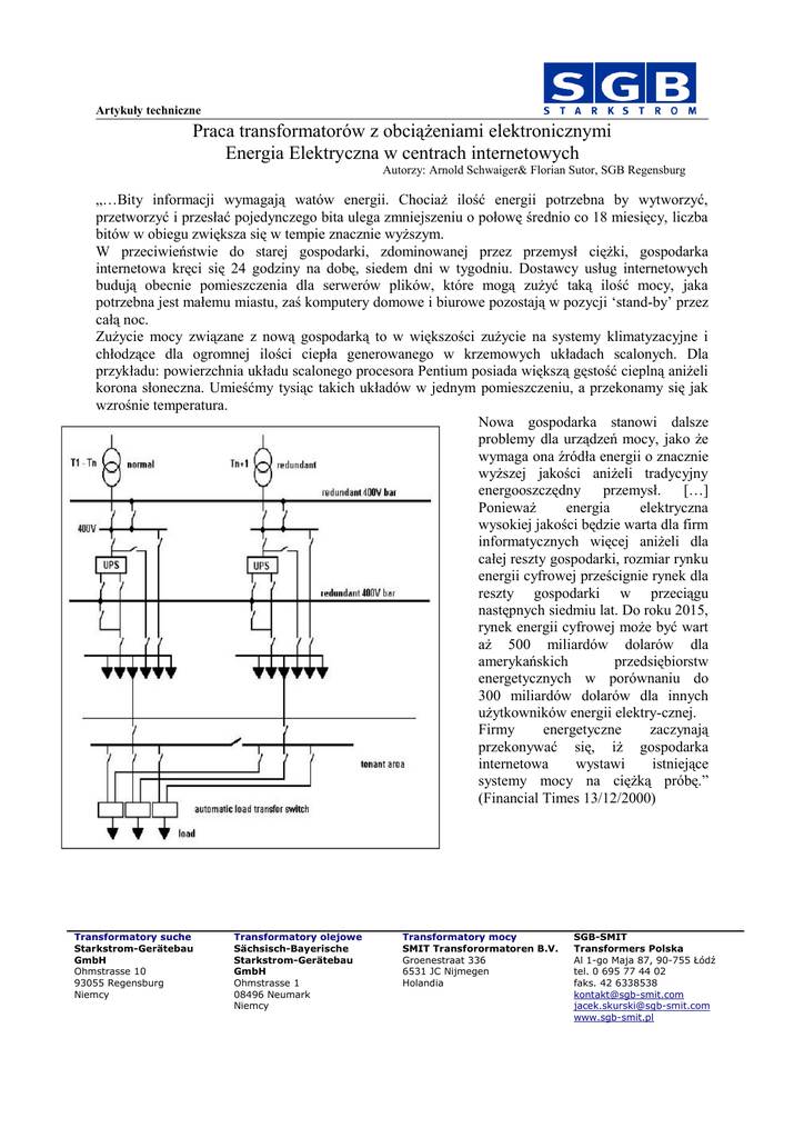 Artykuły techniczne Praca transformatorów z obciążeniami elektronicznymi Energia Elektryczna w centrach internetowych Autorzy: Arnold Schwaiger& Florian Sutor, SGB Regensburg „…Bity informacji wymagają watów energii. Chociaż ilość energii potrzebna by wytworzyć, przetworzyć i przesłać pojedynczego bita ulega zmniejszeniu o połowę średnio co 18 miesięcy, liczba bitów w obiegu zwiększa się w tempie znacznie wyższym. W przeciwieństwie do starej gospodarki, zdominowanej przez przemysł ciężki, gospodarka internetowa kręci się 24 godziny na dobę, siedem dni w tygodniu. Dostawcy usług internetowych budują obecnie pomieszczenia dla serwerów plików, które mogą zużyć taką ilość mocy, jaka potrzebna jest małemu miastu, zaś komputery domowe i biurowe pozostają w pozycji ‘stand-by’ przez całą noc. Zużycie mocy związane z nową gospodarką to w większości zużycie na systemy klimatyzacyjne i chłodzące dla ogromnej ilości ciepła generowanego w krzemowych układach scalonych. Dla przykładu: powierzchnia układu scalonego procesora Pentium posiada większą gęstość cieplną aniżeli korona słoneczna. Umieśćmy tysiąc takich układów w jednym pomieszczeniu, a przekonamy się jak wzrośnie temperatura. Nowa gospodarka stanowi dalsze problemy dla urządzeń mocy, jako że wymaga ona źródła energii o znacznie wyższej jakości aniżeli tradycyjny energooszczędny przemysł. […] Ponieważ energia elektryczna wysokiej jakości będzie warta dla firm informatycznych więcej aniżeli dla całej reszty gospodarki, rozmiar rynku energii cyfrowej prześcignie rynek dla reszty gospodarki w przeciągu następnych siedmiu lat. Do roku 2015, rynek energii cyfrowej może być wart aż 500 miliardów dolarów dla amerykańskich przedsiębiorstw energetycznych w porównaniu do 300 miliardów dolarów dla innych użytkowników energii elektry-cznej. Firmy energetyczne zaczynają przekonywać się, iż gospodarka internetowa wystawi istniejące systemy mocy na ciężką próbę.” (Financial Times 13/12/2000) Transformatory suche Starkstrom-Gerätebau GmbH Ohmstrasse 10 93055 Regensburg Niemcy Transformatory olejowe Sächsisch-Bayerische Starkstrom-Gerätebau GmbH Ohmstrasse 1 08496 Neumark Niemcy Transformatory mocy SMIT Transforormatoren B.V. Groenestraat 336 6531 JC Nijmegen Holandia SGB-SMIT Transformers Polska Al 1-go Maja 87, 90-755 Łódź tel. 0 695 77 44 02 faks. 42 6338538 [email protected] [email protected] www.sgb-smit.pl Artykuły techniczne Ciągły dostęp do energii elektrycznej musi być zapewniony w szczególności dla powiększających się gałęzi biznesu, handlu i bankowości elektronicznej. Niektóre centra internetowe zużywają 120 000 kW każde. Ten zwiększający się popyt na zasilanie mocy jest zaspokajany przez wielokrotne rezerwowanie dostaw. W zilustrowanym przykładzie zastosowano urządzenia UPS (zasilacz awaryjny) (Zob. Rys. 1) Niektóre transformatory nie są wyposażone w UPS, jako że dostarczają mocy dla odbiorców nie będących krytycznymi, takich jak układy chłodzenia, itp. Lecz są one również podłączone do silników wysokoprężnych tak więc mogą pracować przez długi czas na wypadek awarii zasilania. Inne transformatory (T1 – Tn) są połączone z UPS i zasilają zabezpieczone przez UPS szyny 400V, Tn+1 także zasila rezerwową szynę 400V. W obszarze zamieszkanym znajduje się szyna zabezpieczona 400V i inna szyna 400V zasilana przez urządzenie rezerwowe. Do każdego odbiornika krytycznego przypisany został automatyczny przełącznik obciążenia, tak więc każdy z nich może być zasilany alternatywnie i niezależnie tak przez system UPS 1 jak i system UPS 2. Na wypadek awarii zasilania głównego, przełącznik automatycznie przełącza na inną dostępną szynę zbiorczą bez przerwy w zasilaniu. Stąd też zastosowano dwa statyczne przełączniki z przeciwsobnymi stosunkami/współczynnikami zwarcia. 1) Składowa harmoniczna wywołana nieliniowymi obciążeniami. Prawie cały sprzęt posiadający zdolność produkcyjną stosowany w centrach internetowych to odbiorniki nieliniowe. Serwery i układy chłodzenia zawierają zespoły układów do konwersji dostarczanego przez przedsiębiorstwo energetyczne prądu zmiennego na prąd stały, który zasila elementy mikroelektroniczne. Odbiorniki te są jednofazowe lub mogą być trójfazowe. Pomiar prądu liniowego z obwodu gałęziowego obsługującego wyłącznie odbiorniki w postaci komputerów pokazano na Rysunku 2. Nie należy w tym przypadku stosować zbyt małych przewodów neutralnych w obwodach zasilających obciążenia elektroniczne. Rysunek 2. Przykładowy kształt przebiegu falowego prądu dla obwodu z odbiornikiem elektronicznym/ Częstotliwość (H Pu)spektrum harmoniczne dla prądu obciążenia elektronicznego Transformatory suche Starkstrom-Gerätebau GmbH Ohmstrasse 10 93055 Regensburg Niemcy Transformatory olejowe Sächsisch-Bayerische Starkstrom-Gerätebau GmbH Ohmstrasse 1 08496 Neumark Niemcy Transformatory mocy SMIT Transforormatoren B.V. Groenestraat 336 6531 JC Nijmegen Holandia SGB-SMIT Transformers Polska Al 1-go Maja 87, 90-755 Łódź tel. 0 695 77 44 02 faks. 42 6338538 [email protected] [email protected] www.sgb-smit.pl Artykuły techniczne W istocie, ze względu na wybrany projekt, powinny one mieć niemal podwójną możliwość obciążenia w stosunku do przewodów fazowych. 2) Układy UPS Do produkcji energii elektrycznej zastosowano urządzenia synchroniczne przy eksploatacji urządzeń wirujących. Ich wysoka wydajność i niska impedancja źródła leżą u podstaw zastosowania ich w układach UPS. Urządzenia zasilania rezerwowego są aktywowane w momencie awarii zasilania i przejmują zasilanie energii. Źródłem energii w tym przypadku są akumulatory lub paliwo. Stabilizatory magazynują energię kinetyczną w kołach zamachowych i są stosowane do celu uzupełniania krótkich przerw pomiędzy awarią z
