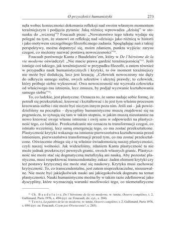 O przyszłości humanistyki 273 nęła wobec konieczności dokonania refleksji nad swoim własnym momentem teraźniejszym i podjęcia pytania: Jaką różnicę wprowadza „dzisiaj” w stosunku do „wczoraj”? Foucault pisze: „Nowatorstwo tego tekstu wydaje się polegać na tym, że stanowi on refleksję nad «dzisiaj» jako różnicą w historii i jako motywem szczególnego filozoficznego zadania. Spoglądając nań z takiej perspektywy, można dopatrzyć się, moim zdaniem, punktu wyjścia: zarysu czegoś, co możemy nazwać postawą nowoczesności”14. Foucault porównuje Kanta z Baudelaire’em, który w De l’héroisme de la vie moderne oświadczył: „Nie macie prawa gardzić teraźniejszością”15. Jeśli istnieje coś takiego, jak teraźniejszość w przypadku filozofii, a zatem również w przypadku nauk humanistycznych i krytyki, to ów moment teraźniejszy nie może być dedukcją, lecz jest kreacją: „Człowiek nowoczesny nie dąży do odkrycia samego siebie, swych sekretów i ukrytej prawdy; to człowiek, który próbuje siebie wykreować. Owa nowoczesność nie wyzwala człowieka od właściwego mu istnienia, lecz zmusza, by podjął wyzwanie kształtowania samego siebie”16. To, co ludzkie, jest plastyczne. Oznacza to, że samo nadaje sobie formę, że potrafi się przekształcać, kreować i kształtować i że jest tym właśnie procesem kreowania siebie i nie może być niczym innym poza nim. Jeśli zaś – jak powiedzieliśmy na początku – dyscypliny humanistyczne muszą znajdować się na pograniczu, to sytuują się tam w takim stopniu, w jakim muszą nieustannie na nowo kreować swoje własne istnienie i swój sens w odpowiedzi na plastyczność tego, co ludzkie. Przekształcanie nie oznacza tu transformacji czegoś, co istniało wcześniej, lecz samą emergencję tego, co ma zostać przekształcone. Plastyczność krytyki wskazuje na istnienie pierwszeństwa kształtowania przed istnieniem, pierwszeństwa transformacji przed tym, co ma zostać przekształcone. Oświecenie zbiega się z tą właśnie świadomością naszej plastyczności, czyli naszej wolności. Jak widzieliśmy, zdaniem Kanta plastyczność ta nie może jednak przekroczyć pewnych granic, swoich własnych granic. Plastyczność nie może stać się dogmatyczną metafizyką ani nauką. Aby pozostać plastyczna, musi respektować transcendentalny zakaz: żaden element krytyki czy też postawy krytycznej nie może stać się naukowy. Krytyka musi zachować krytyczność. To, co transcendentalne, jest zatem nieprzekraczalne, nieusuwalne. Nie może być jakiejkolwiek nauki ani jakiegokolwiek dogmatu na temat plastyczności. Nauki humanistyczne można by w takim razie zdefiniować jako dyscypliny, które wyznaczają warunki możliwości tego, co niemetafizyczne Ch. B a u d e l a i r e, De l’héroisme de la vie moderne, w: tenże, Oeuvre complètes, t. 2, Gallimard, Paris 1976, s. 494 (cyt. za: Foucault, dz. cyt., s. 284). 16 T e n ż e, La paintre de la vie moderne, w: tenże, Oeuvre complètes, t. 2, Gallimard, Paris 1976, s. 694 (cyt. za: Foucault, Czym jest Oświecenie?, s. 285). 15 Catherine MALABOU 274 i nienaukowe, to znaczy transcendentalnej, plastycznej kreacji tego, co ludzkie. Wiedzy, władzy politycznej, etyki. Foucault zgadza się z Kantem we wszystkich punktach z wyjątkiem jednego, a mianowicie kwestionuje ideę transcendentalnych nieprzekraczalnych granic. Pyta: Jaka byłaby dziś adekwatna odpowiedź na pytanie „Czym jest Oświecenie?”, gdyby pytanie to zostało ponownie do nas skierowane? Co byśmy odpowiedzieli? I udziela owej zagadkowej i trudnej odpowiedzi: w przeciwieństwie do tego, co mówił w swoich czasach Kant, musimy przekraczać to, co transcendentalne, przesuwać granice i konsekwentnie radykalizować ludzką plastyczność. Czy oznacza to jednak, że nauki humanistyczne muszą otworzyć się na swoje zewnętrze, czyli na nauki ścisłe? Absolutnie nie: „Krytyka nie będzie dalej miała na celu znalezienia formalnych struktur o wartości uniwersalnej, ale raczej historyczne poszukiwanie zdarzeń, które doprowadziły nas do ustanowienia siebie i do rozpoznania siebie jako podmiotów tego, co robimy, mówimy, myślimy”17. Możliwość przekroczenia tego, co transcendentalne, zbiega się z samym jego pojęciem jako struktury formalnej. Dla Kanta wolność jest strukturą uniwersalną; stanowi ona transcendentalną możliwość plastyczności. Dla Foucaulta definicja ta jest ciągle jeszcze zbyt dogmatyczna, nazbyt normalizująca, pozostaje zakorzeniona w tej samej regule co nauka, czyli w uniwersalizmie. W przeciwieństwie do tego, co mówi Kant, wolność jest historyczna i przygodna. Kreowanie siebie to proces przygodny. W tym sensie – i to stanowiłoby zdaniem Foucaulta przyszłość humanistyki – trzeba by opierać się na krytyce, która nie byłaby transcendentalna. „Krytyka nie jest transcendentalna”18 – formuła ta może wydawać się nad wyraz szokująca, niemniej jednak otwiera pole nowej ontologii, „historycznej ontologii nas samych”19, która musi odwrócić się od wszelkich projektów roszczących sobie prawo do globalności i radykalizmu”20. Raz jeszcze powróćmy do tego bardzo ważnego fragmentu: „W tym znaczeniu krytyka nie jest transcendentalna, jej celem zaś nie jest czynienie możliwą metafizyki: jej cel jest genealogiczny, a metoda archeologiczna. Archeologiczna – a nie transcendentalna – w tym sensie, że nie będzie starała się poszukiwać uniwersalnych struktur wszelkiego poznania bądź wszystkich możliwych działań moralnych, lecz spróbuje traktować dyskursy artykułujące to, co myślimy, mówimy i robimy, jako zdarzenia historyczne. Krytyka ta będzie zaś analogiczna w tym sensie, że [...] spróbuje doszukiwać się w przygodności, która uczyniła nas tym, czym jesteśmy, możliwości tego, że kiedyś nie będziemy żyć, działać czy myśleć 17 18 19 20 F o u c a u l t, Czym jest Ośw