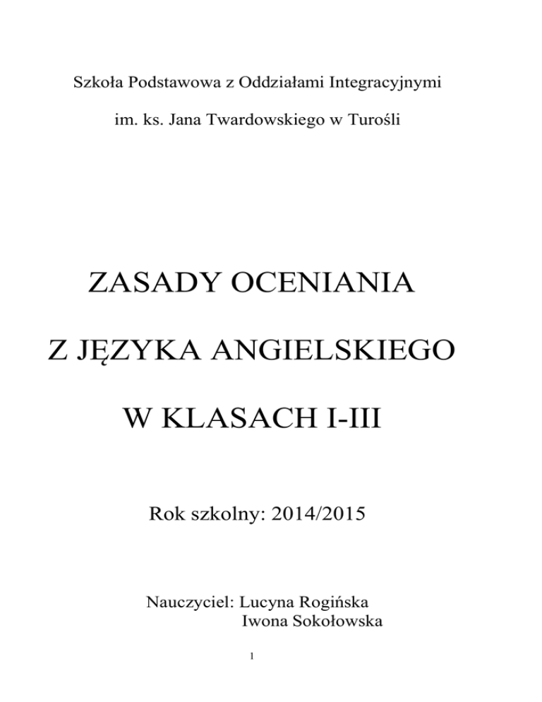 Szkoła Podstawowa z Oddziałami Integracyjnymi im. ks. Jana Twardowskiego w Turośli ZASADY OCENIANIA Z JĘZYKA ANGIELSKIEGO W KLASACH I-III Rok szkolny: 2014/2015 Nauczyciel: Lucyna Rogińska Iwona Sokołowska 1 Podstawa prawna: 1. Ustawa z dnia 7 września 1991r. o systemie oświaty (tekst jednolity: Dz.U. z 2004 r., Nr 256, poz. 2572). 2. Rozporządzenie Ministra Edukacji Narodowej z dnia 23 grudnia 2008 r. w sprawie podstawy programowej wychowania przedszkolnego oraz kształcenia ogólnego w poszczególnych typach szkół (Dz.U. z 2009 r. nr 4 poz. 17) z późniejszymi zmianami. 3. Rozporządzenie Ministra Edukacji Narodowej z dnia 30 kwietnia 2007 roku w sprawie warunków i sposobu oceniania, klasyfikowania i promowania uczniów i słuchaczy oraz przeprowadzania sprawdzianów i egzaminów w szkołach publicznych (Dz.U. Nr 83 poz.562, z późn. zm.) 4. Statut Szkoły I. CELE KSZTAŁCENIA Wspomaganie dzieci w porozumiewaniu się z osobami, które mówią innym językiem. II. WYBRANE PROGRAMY I PODRĘCZNIKI Nauczanie języka angielskiego w klasach I-III w Szkole Podstawowej z Oddziałami Integracyjnymi im. ks. Jana Twardowskiego w Turośli odbywa się według Programu Nauczania Języka Angielskiego dla I etapu edukacyjnego, klasy I-III. Autorami programu są: Ilona Studzińska, Arkadiusz Mędela, Magdalena Kondro, Ewa Piotrowska. Program jest zgodny z zadaniami i celami edukacyjnymi szkoły, określonymi przez nową podstawę programową (Rozporządzenie Ministra Edukacji Narodowej z dnia 8 czerwca 2009 r.). Program oparto na założeniu, że uczeń znajduje się w centrum procesu nauczania, a podstawową rolą nauczyciela jest dobranie treści i metod nauczania tak, aby uwzględniały możliwości rozwoju dziecka oraz jego potrzeby i zainteresowania. Program przybliża cele kształcenia i wychowania, treści nauczania, a także metody i techniki nauczania różnych sprawności językowych, zgodnie z zasadą nauczania zintegrowanego. Znajdują się w nim też nim założenia dotyczące osiągnięć uczniów w zakresie znajomości języka angielskiego, pod koniec omawianego etapu nauki szkolnej, oraz propozycje kryteriów i przykładowe sposoby oceniania postępów uczniów. Uczniowie korzystają z następujących podręczników i zeszytów ćwiczeń: Kl. I: Bugs World 1, Carol Read, Ana Soberón, wydawnictwo Macmillan Kl. II: Bugs World 2, Carol Read, Ana Soberón, wydawnictwo Macmillan Kl. III: Bugs World 3, Carol Read, Ana Soberón, wydawnictwo Macmillan 2 III. OBSZARY AKTYWNOŚCI PODLEGAJĄCE OCENIE słuchanie, mówienie, czytanie (kl. III), pisanie (kl. II-III), słownictwo, rozwój emocjonalno – społeczny IV. SPRAWDZANIE I OCENIANIE OSIĄGNIĘĆ UCZNIÓW W klasach I-III ocena stanowi integralną część procesu nauczania i składają się na nią następujące elementy: Ocena nieformalna - uczniowie nagradzani są słowem, gestem, naklejkami, uśmiechem jak również buźkami, które nauczyciel rysuje w nagrodę za aktywność i pracę na lekcji, - oceniany jest wysiłek ucznia i postępy w nauce na podstawie systematycznej obserwacji i notowania jego osiągnięć, - dzieci dokonują samooceny, oznaczając właściwy obrazek w podręczniku. Ocena formalna : w postaci symboli cyfrowych w klasach II-III (6, 5, 4, 3, 2, 1), które odpowiadają trzem poziomom wiadomości i umiejętności ucznia w zakresie poszczególnych edukacji. Oceny zapisywane na sprawdzianach zawierają komentarz, a w dzienniku oznaczone są następująco: 6, 5 – powyżej oczekiwań, 4, 3 – zgodnie z oczekiwaniami, 2, 1 – poniżej oczekiwań. W ocenianiu bieżącym dopuszcza się stosowanie znaków plus (+) i minus (-). W e-dzienniku w klasie I przy ocenianiu nauczyciel posługuje się oceną opisową bez symboli, która odpowiada trzem poziomom opanowania wiadomości i umiejętności ucznia w zakresie języka angielskiego. Oceny zawierają komentarz, a w e-dzienniku oznaczone są następująco: 3 a) Powyżej oczekiwań – kolor niebieski, b) Zgodnie z oczekiwaniami – kolor żółty, c) Poniżej oczekiwań – kolor różowy Formy sprawdzania wiadomości uczniów w klasach I-III: 1) Praca klasowa (test) kl. II-III - z określonego materiału poprzedzona powtórzeniem, zapisana w dzienniku i zapowiedziana z tygodniowym wyprzedzeniem. Prace klasowe powinny być ocenione i omówione w terminie tygodnia (a najpóźniej dwóch tygodni) po ich przeprowadzeniu. Skala ocen testów: 6 Poziom powyżej oczekiwań 100% (Znakomicie) 5 Poziom powyżej oczekiwań 99% - 90% (Bardzo dobrze) 4 Poziom zgodnie z oczekiwaniami 89% - 75% (Dobrze) 3 Poziom zgodnie z oczekiwaniami 74% - 50% (Zadowalająco) 2 Poziom poniżej oczekiwań 49% - 30% (Pracuj więcej) 1 Poziom poniżej oczekiwań 0% - 29% (Niezadowalająco) 2) Kartkówka (kl. II – III)– niezapowiedziana lub zapowiedziana praca obejmująca materiał z 1 do 3 ostatnich jednostek lekcyjnych. Zadania oceniane są w punktach, które przeliczane są na ocenę zgodnie z proporcją stosowaną przy ocenianiu testów. 3) Prace domowe ucznia – podlegające sprawdzeniu, ale nie zawsze ocenie w formie stopnia, brak pracy domowej jest odnotowywany w zeszycie przedmiotowym ucznia (klasa II - III) lub zeszycie ćwiczeń. Pod uwagą nauczyciela wymagany jest podpis rodzica. Uczeń ma obowiązek nadrobienia zaległości. Na wykonanie trudniejszych zadań (projektów – kl. III) uczeń otrzymuje tydzień. 4) Wypowiedzi ustne: a) odpowiedzi z ostatnich 3 lekcji, b) aktywność na lekcji. Przy ustalaniu oceny semestralnej lub końcowej systematyczność pracy oraz możliwości intelektualne ucznia. 4 nauczyciel uwzględnia także Sformułowania ocen opisowych śródrocznych i końcowo rocznych z języka angielskiego: Wspaniale opanował materiał z języka angielskiego. Bardzo dobrze opanował materiał z języka angielskiego. Dobrze opanował materiał z języka angielskiego. Zadowalająco opanował materiał z języka angielskiego. Słabo opanował materiał z języka angiel