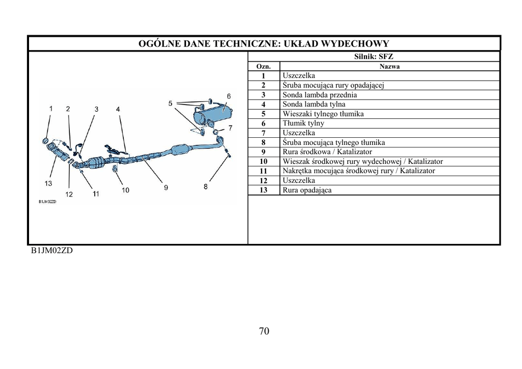 OGÓLNE DANE TECHNICZNE: UKŁAD WYDECHOWY Silnik: SFZ Ozn. 1 2 3 4 5 6 7 8 9 10 11 12 13 B1JM02ZD 70 Nazwa Uszczelka Śruba mocująca rury opadającej Sonda lambda przednia Sonda lambda tylna Wieszaki tylnego tłumika Tłumik tylny Uszczelka Śruba mocująca tylnego tłumika Rura środkowa / Katalizator Wieszak środkowej rury wydechowej / Katalizator Nakrętka mocująca środkowej rury / Katalizator Uszczelka Rura opadająca OGÓLNE DANE TECHNICZNE: UKŁAD WYDECHOWY Silnik: SFZ Dane techniczne Tylny tłumik wyposaŜony jest w zawór, który spełnia 2 zadania: Zmniejsza natęŜenie dźwięku. Poprawia osiągi silnika. Działanie: Na wolnych obrotach Ozn. 14 15 16 17 18 19 20 21 Nazwa Komora A Komora B Komora C Rura wylotowa tłumika Zawór Otwory kalibrowane Rura wlotowa tylnego tłumika Przepona Gdy prędkość przepływu spalin jest niska, zawór (18) jest zamknięty i tylny tłumik działa jak rezonator w celu zwiększenia komfortu akustycznego. Przebieg przepływu spalin: Rura wlotowa tylnego tłumika (20), otwory kalibrowane (19), komora „B” (15), przepona (21), komora „A” (14) i rura wylotowa tylnego tłumika (17). B1JM030D 71 OGÓLNE DANE TECHNICZNE: UKŁAD WYDECHOWY Silnik: SFZ Działanie: W przypadku obciąŜenia W przypadku obciąŜenia prędkość przepływu spalin wzrasta i powoduje otwarcie zaworu (18). Przebieg przepływu spalin: Rura wlotowa tylnego tłumika (20). Komora „C” (16). Zawór (18). Komora „B” (15). Przepona (21). Komora „A” (14). Rura wylotowa tylnego tłumika (17). Ten przebieg stawia mniejszy opór przepływowi spalin i poprawia osiągi silnika. B1JM031D 72