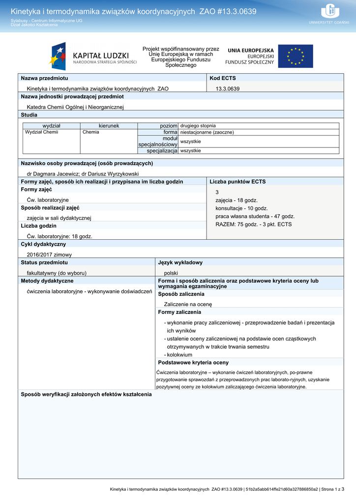 Kinetyka i termodynamika związków koordynacyjnych ZAO #13.3.0639 Sylabusy - Centrum Informatyczne UG Dział Jakości Kształcenia Projekt współfinansowany przez Unię Europejską w ramach Europejskiego Funduszu Społecznego Nazwa przedmiotu Kod ECTS Kinetyka i termodynamika związków koordynacyjnych ZAO Nazwa jednostki prowadzącej przedmiot 13.3.0639 Katedra Chemii Ogólnej i Nieorganicznej Studia wydział Wydział Chemii kierunek Chemia poziom forma moduł specjalnościowy specjalizacja drugiego stopnia niestacjonarne (zaoczne) wszystkie wszystkie Nazwisko osoby prowadzącej (osób prowadzących) dr Dagmara Jacewicz; dr Dariusz Wyrzykowski Formy zajęć, sposób ich realizacji i przypisana im liczba godzin Formy zajęć Liczba punktów ECTS Ćw. laboratoryjne Sposób realizacji zajęć zajęcia w sali dydaktycznej Liczba godzin 3 zajęcia - 18 godz. konsultacje - 10 godz. praca własna studenta - 47 godz. RAZEM: 75 godz. - 3 pkt. ECTS Ćw. laboratoryjne: 18 godz. Cykl dydaktyczny 2016/2017 zimowy Status przedmiotu Język wykładowy fakultatywny (do wyboru) Metody dydaktyczne ćwiczenia laboratoryjne - wykonywanie doświadczeń polski Forma i sposób zaliczenia oraz podstawowe kryteria oceny lub wymagania egzaminacyjne Sposób zaliczenia Zaliczenie na ocenę Formy zaliczenia - wykonanie pracy zaliczeniowej - przeprowadzenie badań i prezentacja ich wyników - ustalenie oceny zaliczeniowej na podstawie ocen cząstkowych otrzymywanych w trakcie trwania semestru - kolokwium Podstawowe kryteria oceny Ćwiczenia laboratoryjne – wykonanie ćwiczeń laboratoryjnych, po-prawne przygotowanie sprawozdań z przeprowadzonych prac laborato-ryjnych, uzyskanie pozytywnej oceny ze kolokwium zaliczającego ćwiczenia laboratoryjne. Sposób weryfikacji założonych efektów kształcenia Kinetyka i termodynamika związków koordynacyjnych ZAO #13.3.0639 | 51b2a5abb614ffe21d60a327886850a2 | Strona 1 z 3 Kinetyka i termodynamika związków koordynacyjnych ZAO #13.3.0639 Sylabusy - Centrum Informatyczne UG Dział Jakości Kształcenia Sposoby weryfikacji przyswojenia wiedzy: Student rozwiązuje problemy w formie pisemnej (sprawdziany) lub ustnej (odpowiedź ustana) z zakresu chemii podstawowej oraz nowoczesnych metod analitycznych (KW_02, KW_03, KW_05, K_W07, K_W10). Przygotowuje raporty z przeprowadzonych doświadczeń (KW_02, KW_03, KW_05, K_W07, K_W10). Sposoby weryfikacji nabycia umiejętności: Student wyjaśnia prowadzącemu zajęcia przebieg przeprowadzanych doświadczeń chemicznych, poprawnie analizuję wyniki pomiarów oraz wyciąga poprawne wnioski z przeprowadzonych doświadczeń (K_U02). Podczas zajęć student potrafi zastosować wiedzę zdobytą z chemii oraz z pokrewnych dyscyplin naukowych do projektowania doświadczeń (K_U04). Sposoby weryfikacji nabrania kompetencji społecznych: Stawianie problemów naukowo-badawczych Studentowi, a następnie analiza jego zdolności do ich rozwiązywania w zespole - wykonywanie ćwiczeń w parach (K_K02). Określenie przedmiotów wprowadzających wraz z wymogami wstępnymi A. Wymagania formalne brak B. Wymagania wstępne brak Cele kształcenia - kontynuacja i rozszerzenie kursu chemii nieorganicznej, fizycznej i koordynacyjnej - zapoznanie studentów z technikami badania związków chemicznych wykorzystywanymi powszechnie w różnorodnych gałęziach przemysłu, w badaniach naukowych oraz w przyzakładowych laboratoriach kontroli jakości - zapoznanie studentów ze sposobami planowania eksperymentów, interpretacją uzyskanych danych oraz sposobem wizualizacji i prezentacji otrzymanych wyników - przedstawienie najważniejszych, współczesnych zagadnień związanych z badaniem kinetyki i termodynamiki związków chemicznych - wyrobienie umiejętności samodzielnego eksperymentowania i interpretacji uzyskanych wyników oraz rozwiązywania problemów podczas prowadzenia doświadczeń chemicznych Treści programowe Właściwości kinetyczne i termodynamiczne związków koordynacyjnych. Kompleksy trwałe i nietrwałe, bierne i labilne. Czynniki wpływające na trwałość związków kompleksowych. Parametry termodynamiczne reakcji chemicznych. Właściwości spektroskopowe związków kompleksowych. Mechanizmy reakcji związków koordynacyjnych, zmiany w strukturze konformacyjnej reagentów. Właściwości termiczne związków kompleksowych. Termograwimetria. Różnicowa analiza termiczna. Kalorymetria. Wykaz literatury A. Literatura wymagana do ostatecznego zaliczenia zajęć (zdania egzaminu): A.1. wykorzystywana podczas zajęć Opracowania własne D. Jacewicz, D. Wyrzykowski A.2. studiowana samodzielnie przez studenta S. J. Lippsrd, J. M. Berg, Podstawy chemii bionieorganicznej, PWN W-wa (1998) L. Stryer, J. L. Tymoczko, J. M. Berg, Biochemia, PWN, Warszawa 2005 J M. Cieślak-Golonka, J. Starosta, M. Wasielewski, Wstęp do chemii koordynacyjnej – PWN (W-wa, 2010) J. Chatłas, A, Katafias, P. Kita, G Wrzeszcz, „Ćwiczenia laboratoryjne z chemii nieorganicznej”; Toruń 1995 S. Dietrich, Termiczna analiza różnicowa, PWN Warszawa, 1974. S. Gaisford, M. A. A. O’Neill, “Pharmaceutical Isothermal Calorimetry”, Informa Healthcare USA, Inc., NY (2007). B. Literatura uzupełniająca J. Keeler, “Kinetics of Chemical Reactions”, University of Cambridge, Departament of Chemistry, 25, IA Chemistry 2002/03. Efekty kształcenia (obszarowe i kierunkowe) Wiedza K_W02: operuje rozszerzoną i pogłębioną wiedzą w zakresie podstawowych działów chemii; K_W03: wykazuje się rozszerzoną wiedzą w zakresie nowoczesnych technik pomiarowych stosowanych w analizie chemicznej; K_W05: operuje poszerzoną wiedzą w zakresie studiowanej specjalności; K_W07: dobiera techniki eksperymentalne oraz teoretyczne w zakresie niezbędnym do zrozumienia, opisu i Rozumienie mechanizmów oddziaływań międzycząsteczkowych w różnych stanach skupienia materii. Ocenianie trwałości wiązań oraz reaktywności związków nieorganicznych i kompleksowych na podstawie 